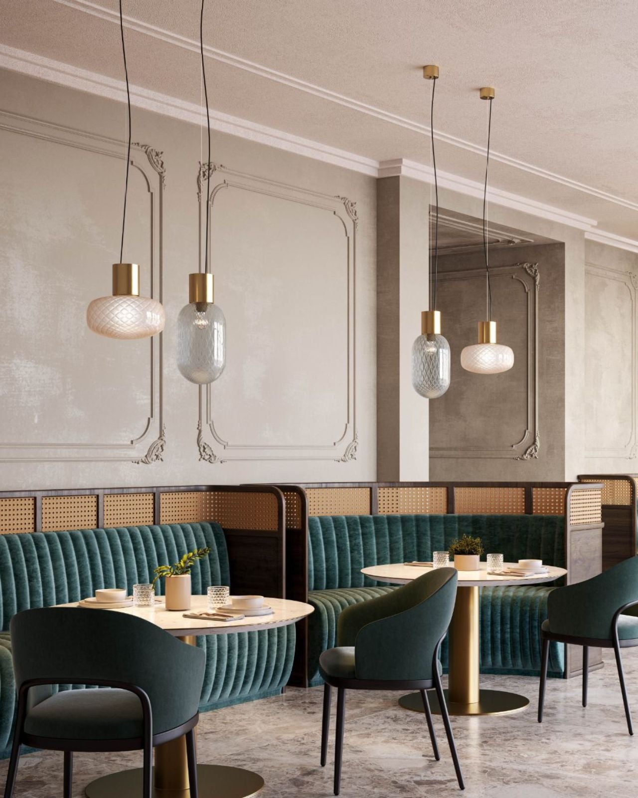 Designer Perfume Bottle Glass Pendants hanging in a retro restaurant