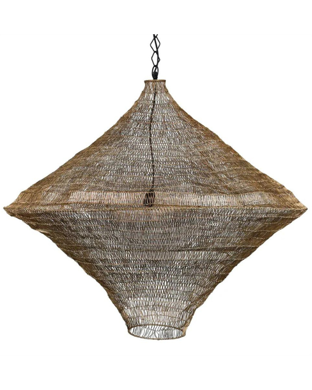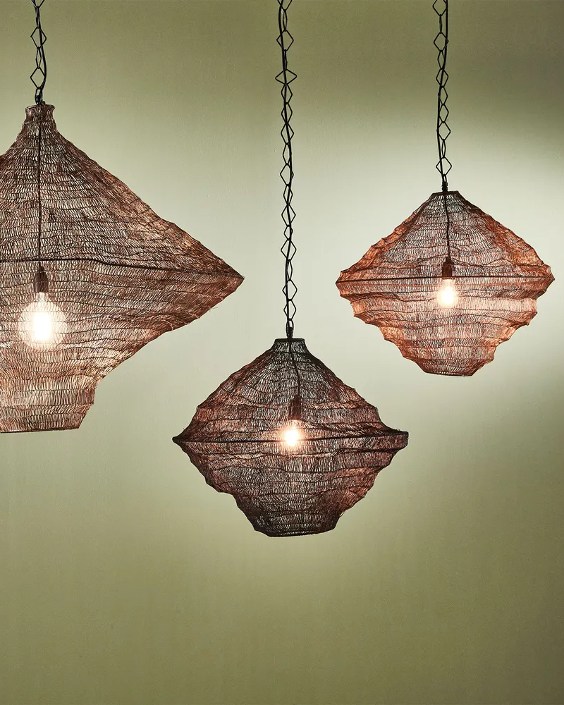 The Diamond Crochet Wire Pendant Light, available in both small and large sizes, features a striking diamond-shaped design that intertwines geometric shapes with aluminium wire that drapes organically of the shade. The wire ensures both durability and a delicate, intricate appearance. Choose from a classic black for a sleek, contemporary look or warm brass for a touch of vintage charm. With two sizes and two finishes, this versatile fitting will suit a variety of interiors.