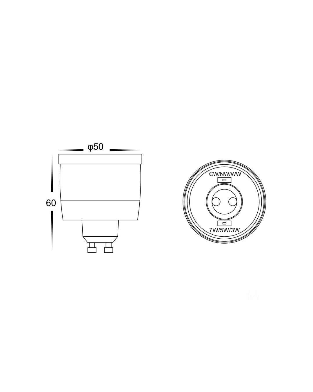 This GU10 is equipped with the ability to be set to 3, 5, or 7 watts. The colour temperature of the globe can also be selected from 3000k, 4000k, and 5500k with the flick of a button at the bottom of the globe.