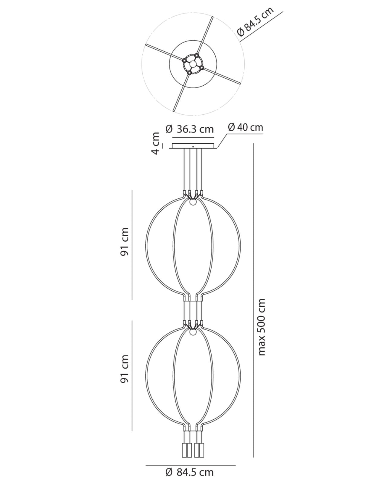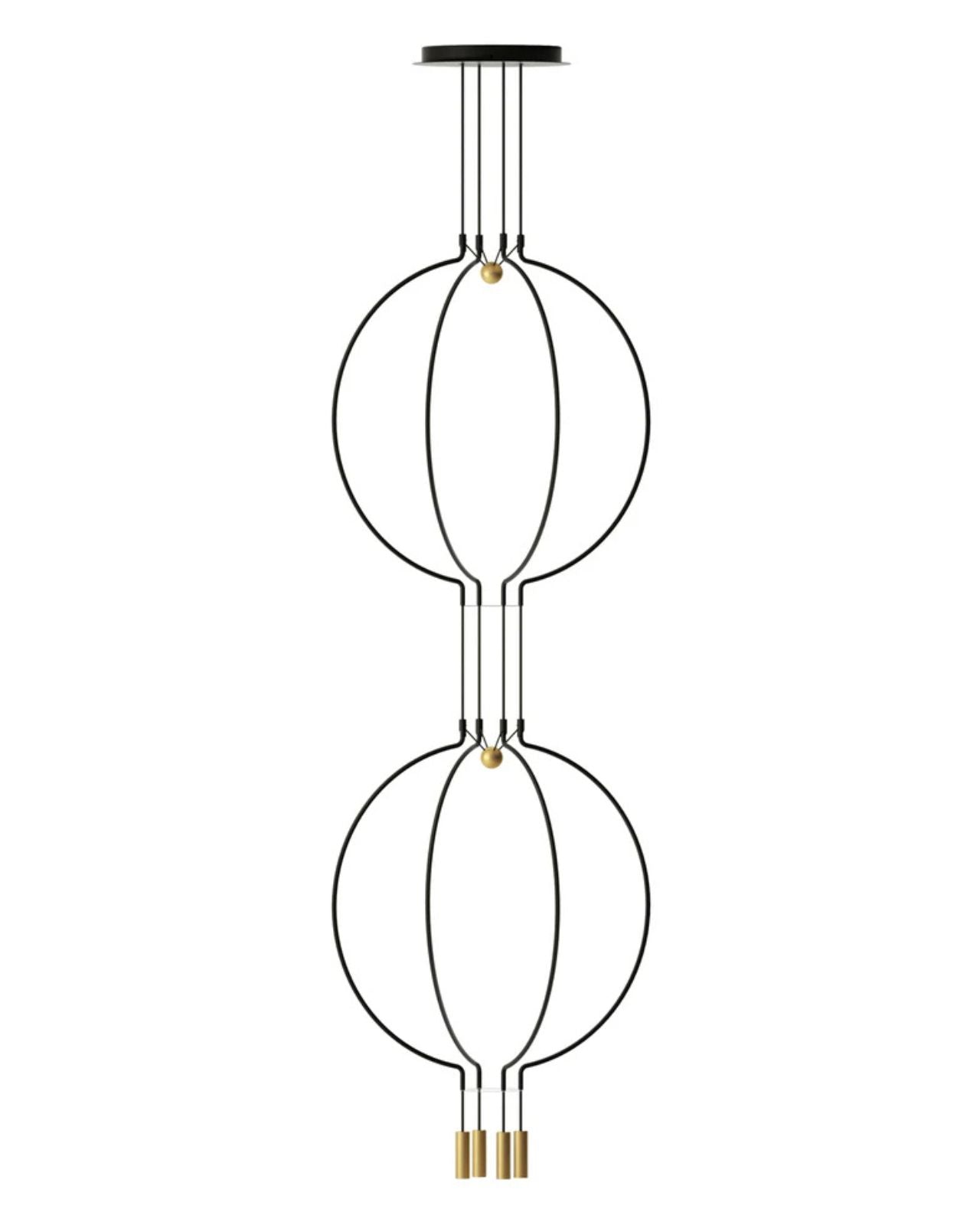A uniquely beautiful statement piece to showcase. This double quad-frame metallic structure composes of eight contrasting slender curves suspended on a metallic rod, creating the form of a double circle. Evoking a sense of modern playfulness in an elegant and sleek form. Crafted in Italy, this pendant is available in custom configurations, available on request.