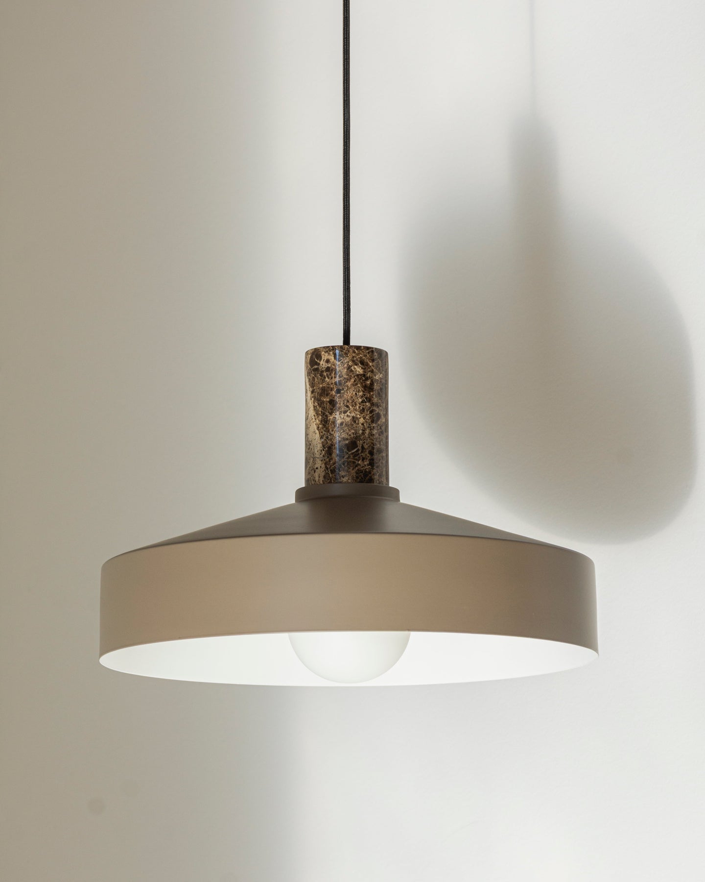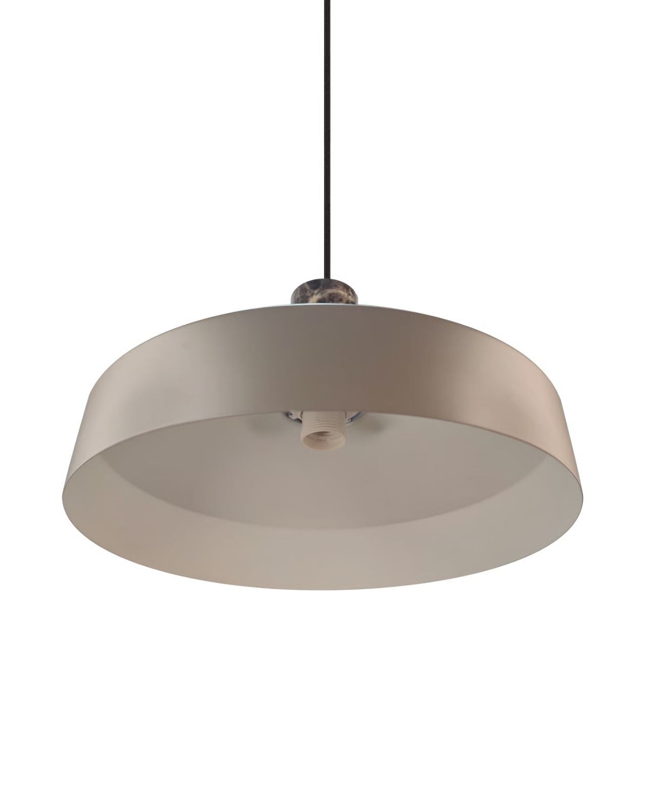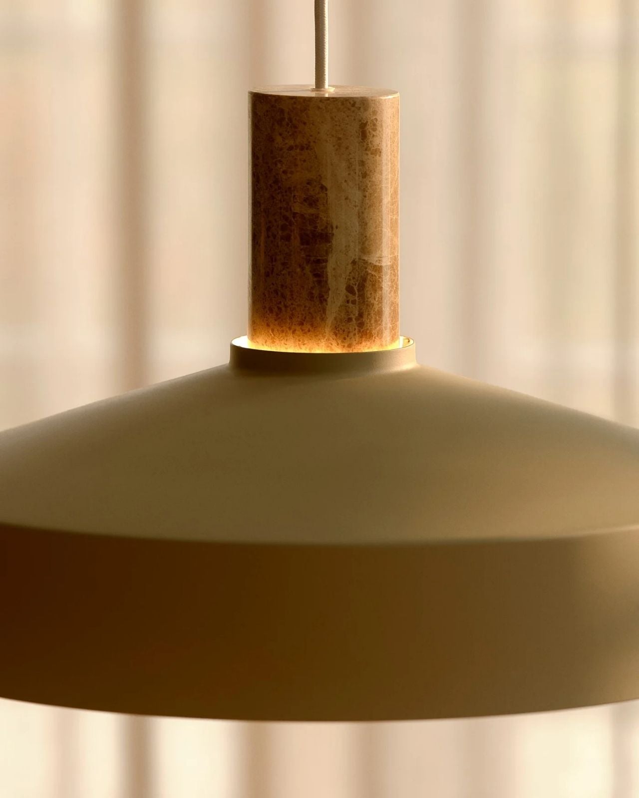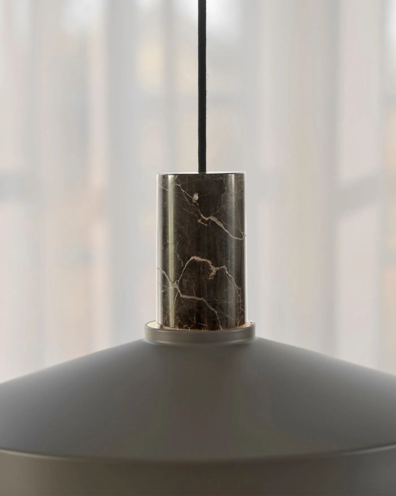 The Elemental & Metal Dome Pendant has a sleek, conical shade meticulously formed from metal, offering an architectural silhouette, while the suspension is crafted from marble or cork. This delicate contrast between cool, industrial lines and organic materials creates a pendant that is sculptural and inviting. Suspended from a slender, textile-covered cable, this fitting appears to float effortlessly, ideal above a dining table, kitchen island, or contemplative reading nook.