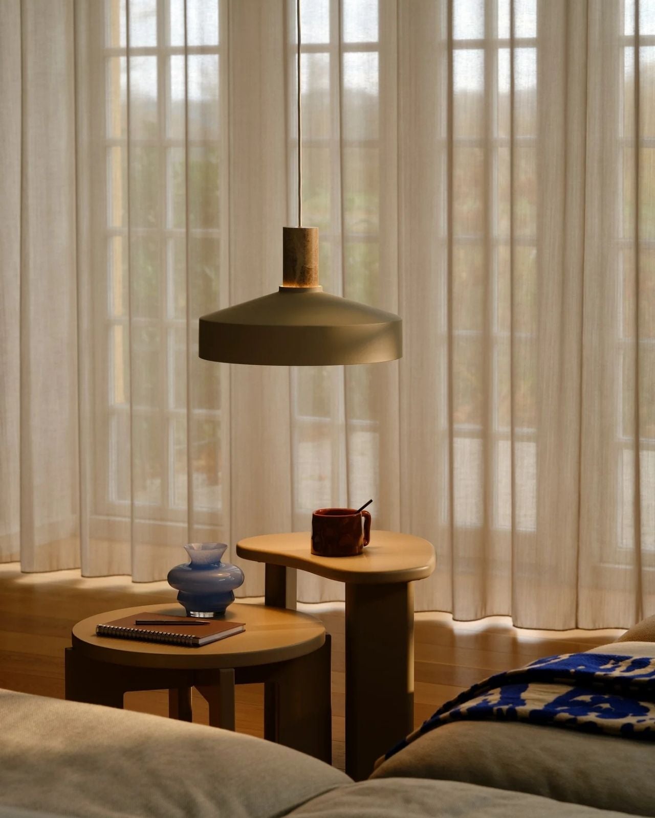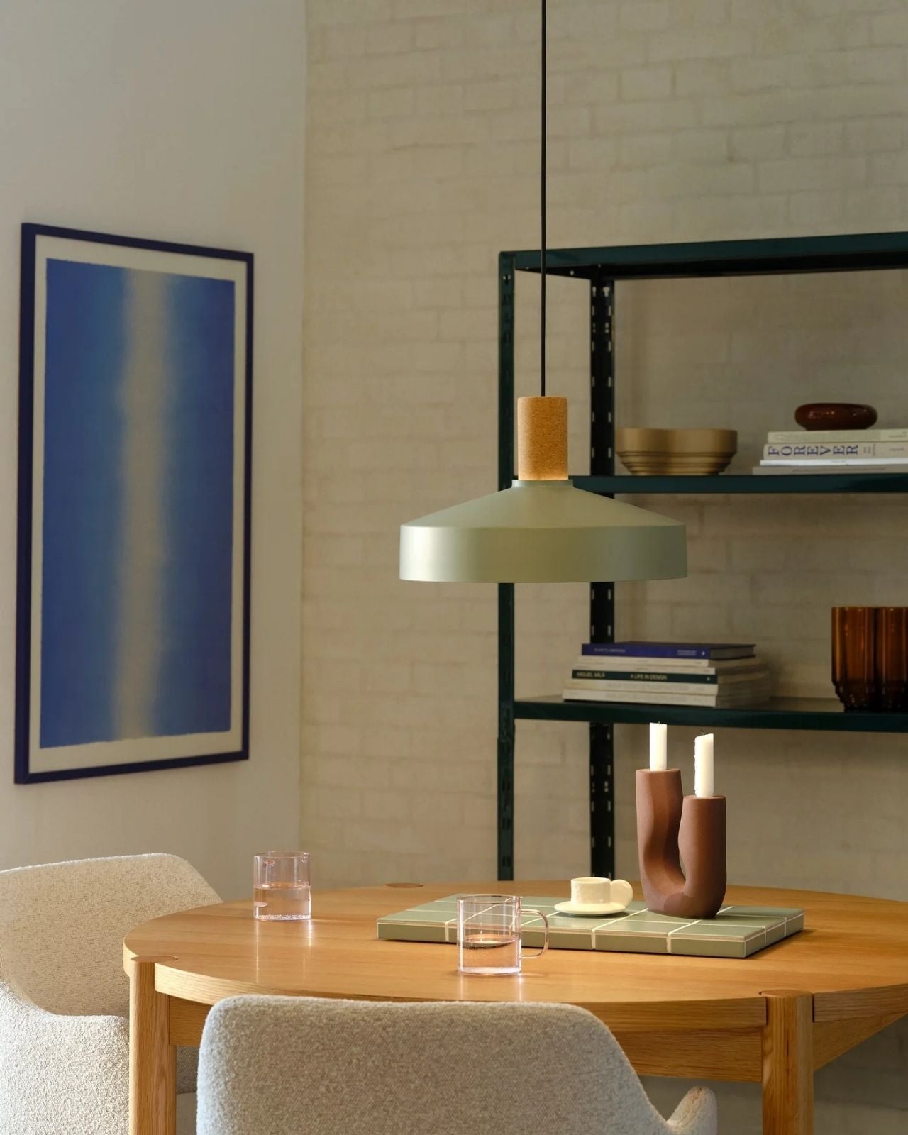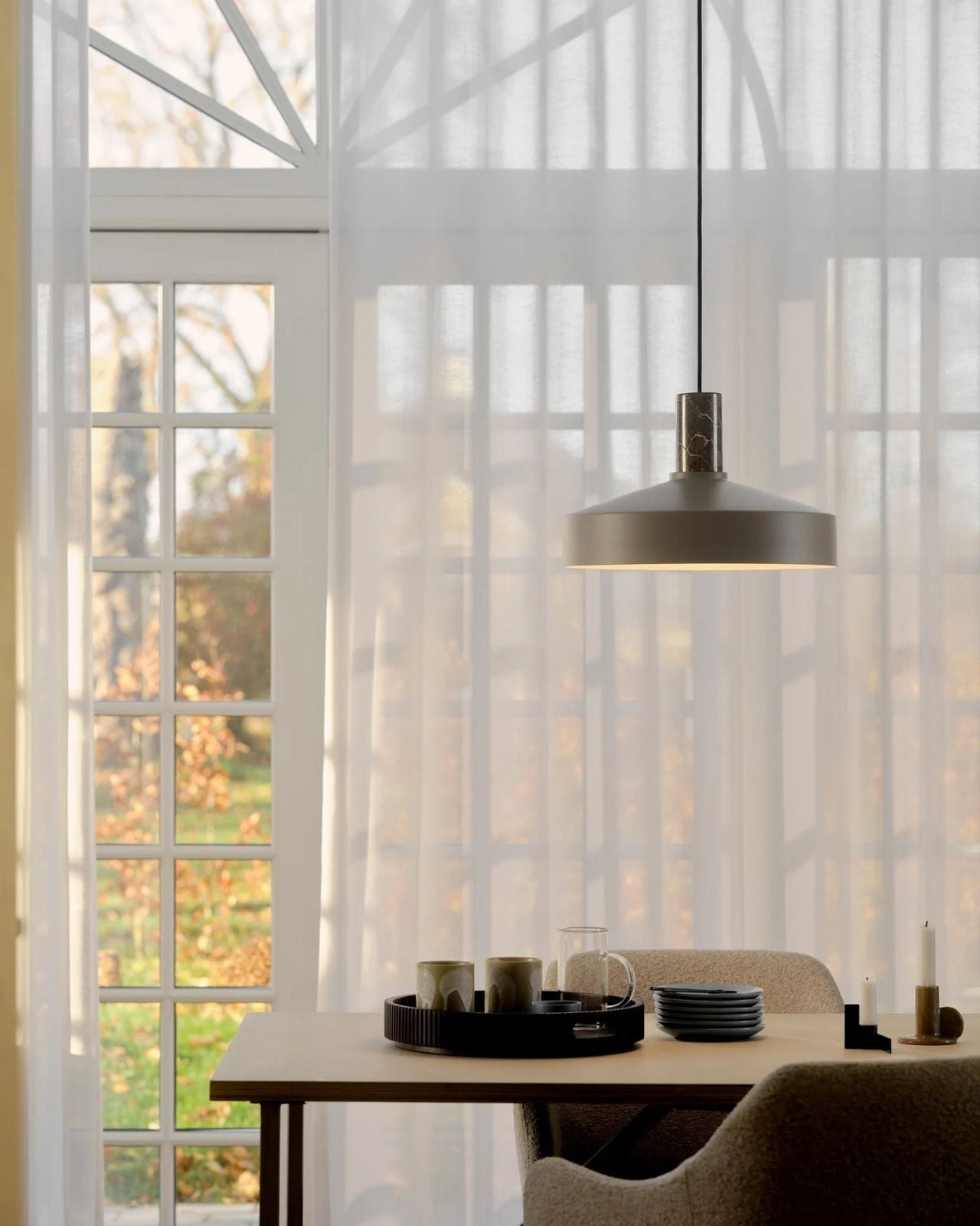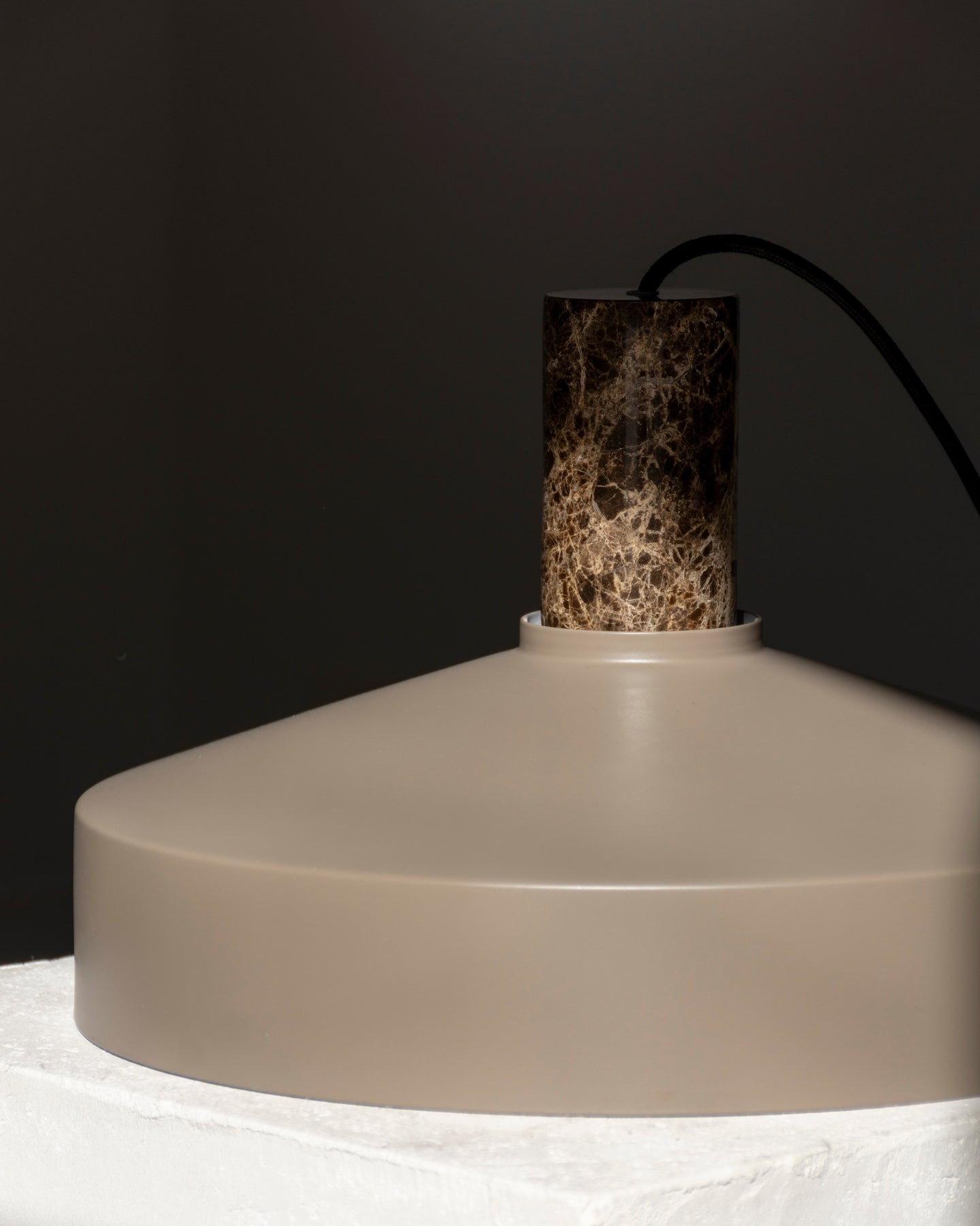 The Elemental & Metal Dome Pendant has a sleek, conical shade meticulously formed from metal, offering an architectural silhouette, while the suspension is crafted from marble or cork. This delicate contrast between cool, industrial lines and organic materials creates a pendant that is sculptural and inviting. Suspended from a slender, textile-covered cable, this fitting appears to float effortlessly, ideal above a dining table, kitchen island, or contemplative reading nook.