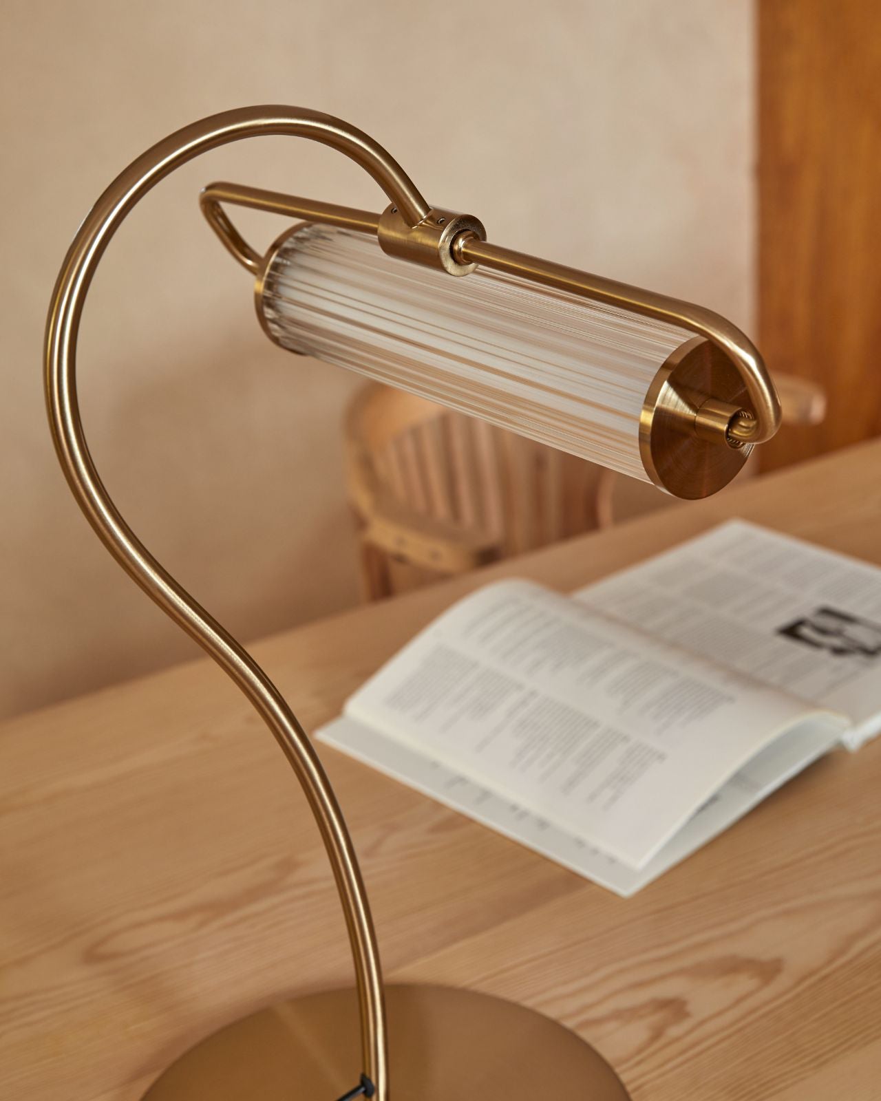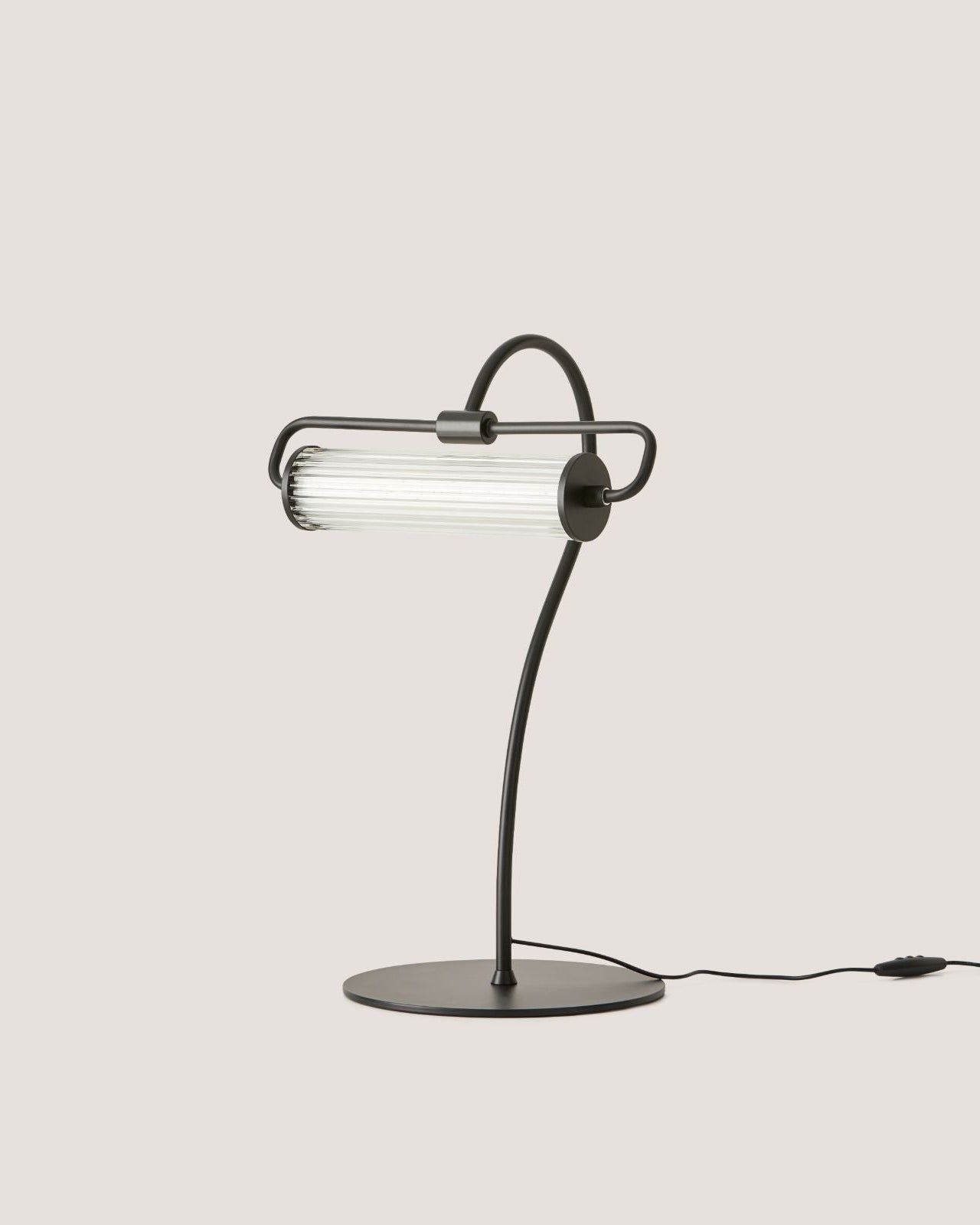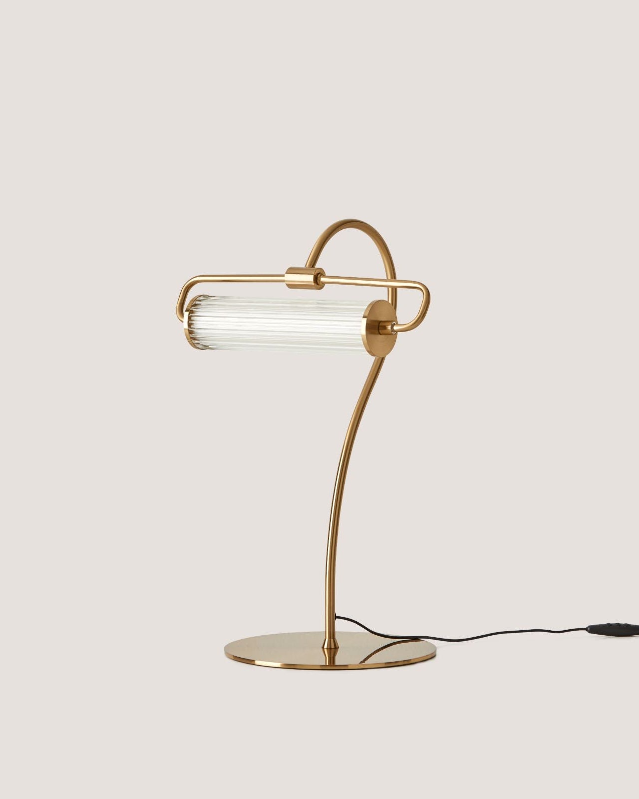 Featuring an elongated curved frame and cylindrical fluted glass shade this Traditional table lamp will add a sense of luxury to any interior space. Its subtly textured glass shade houses a warm (2700K) dimmable LED. This design's elegant features will incorporate refined motifs into interior spaces. Perfect for office desks, hallway consoles or bookshelves. Made from steel finished in either a Matte Black or Matte Brass finish.