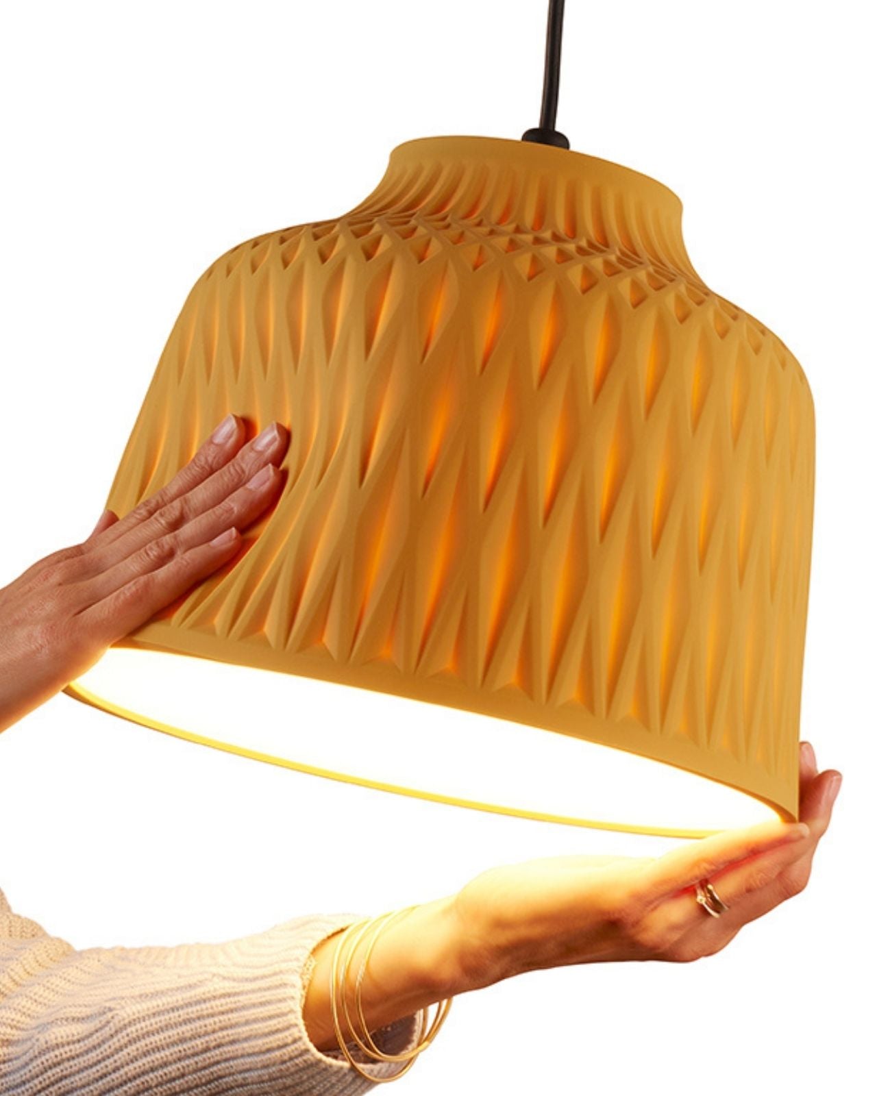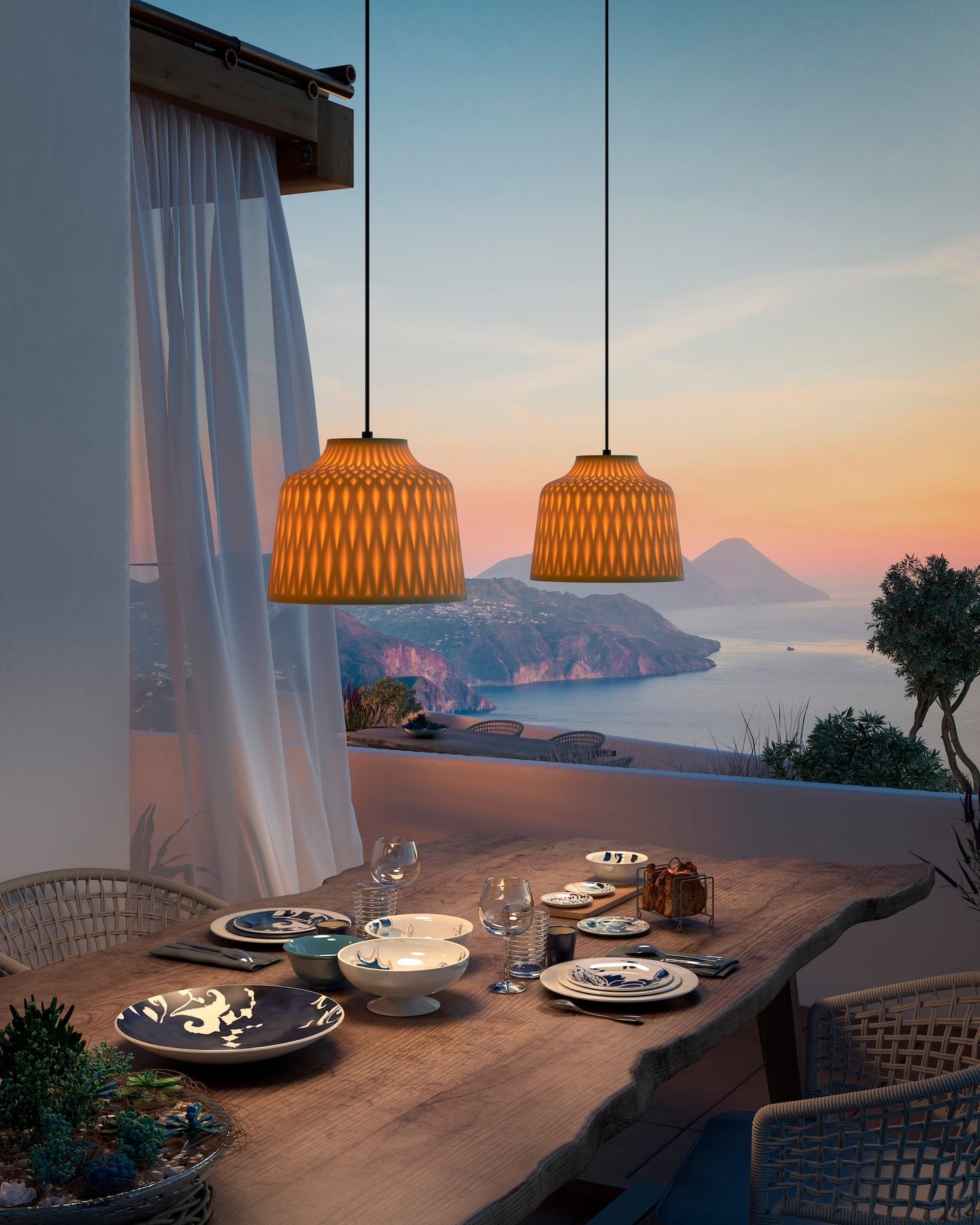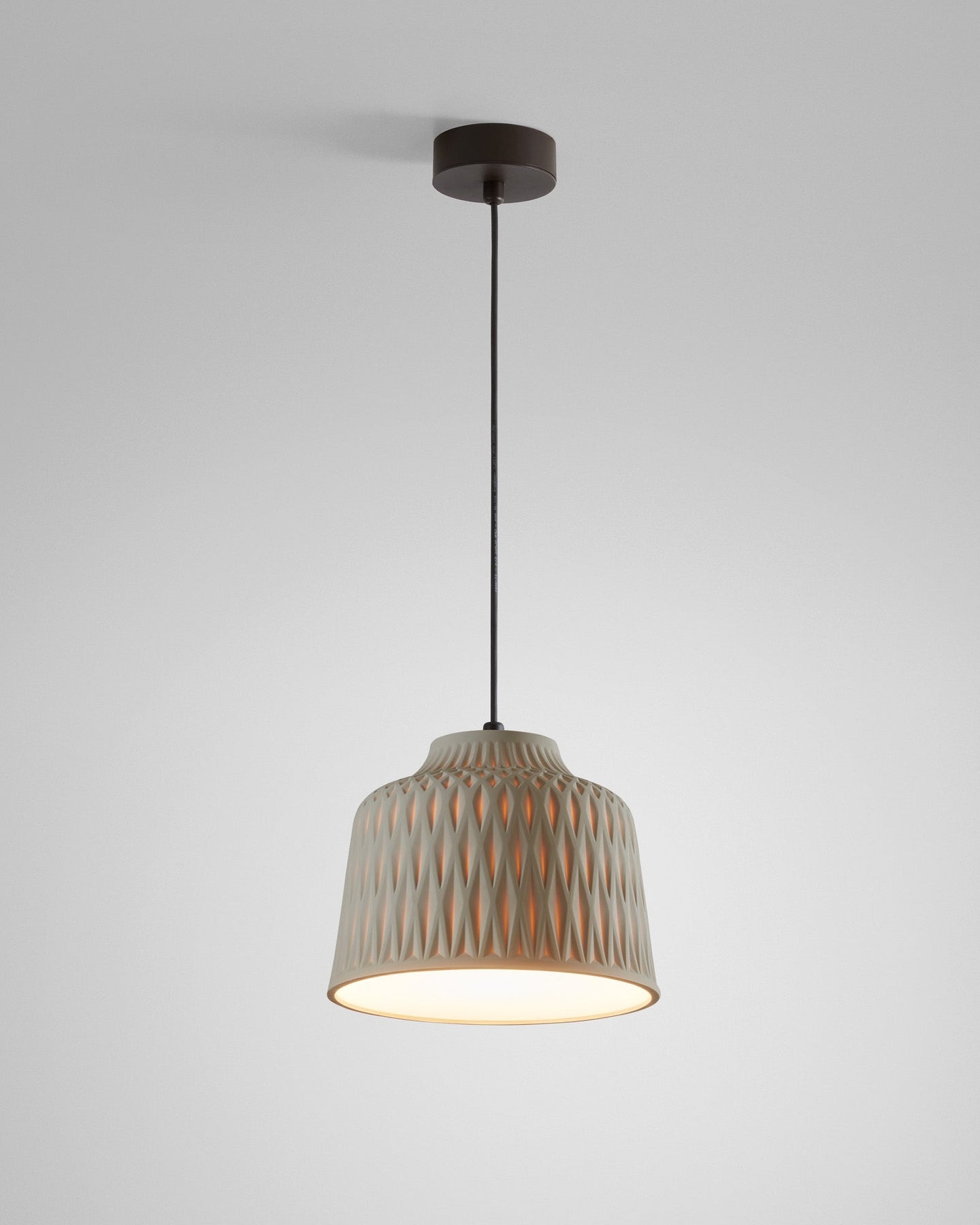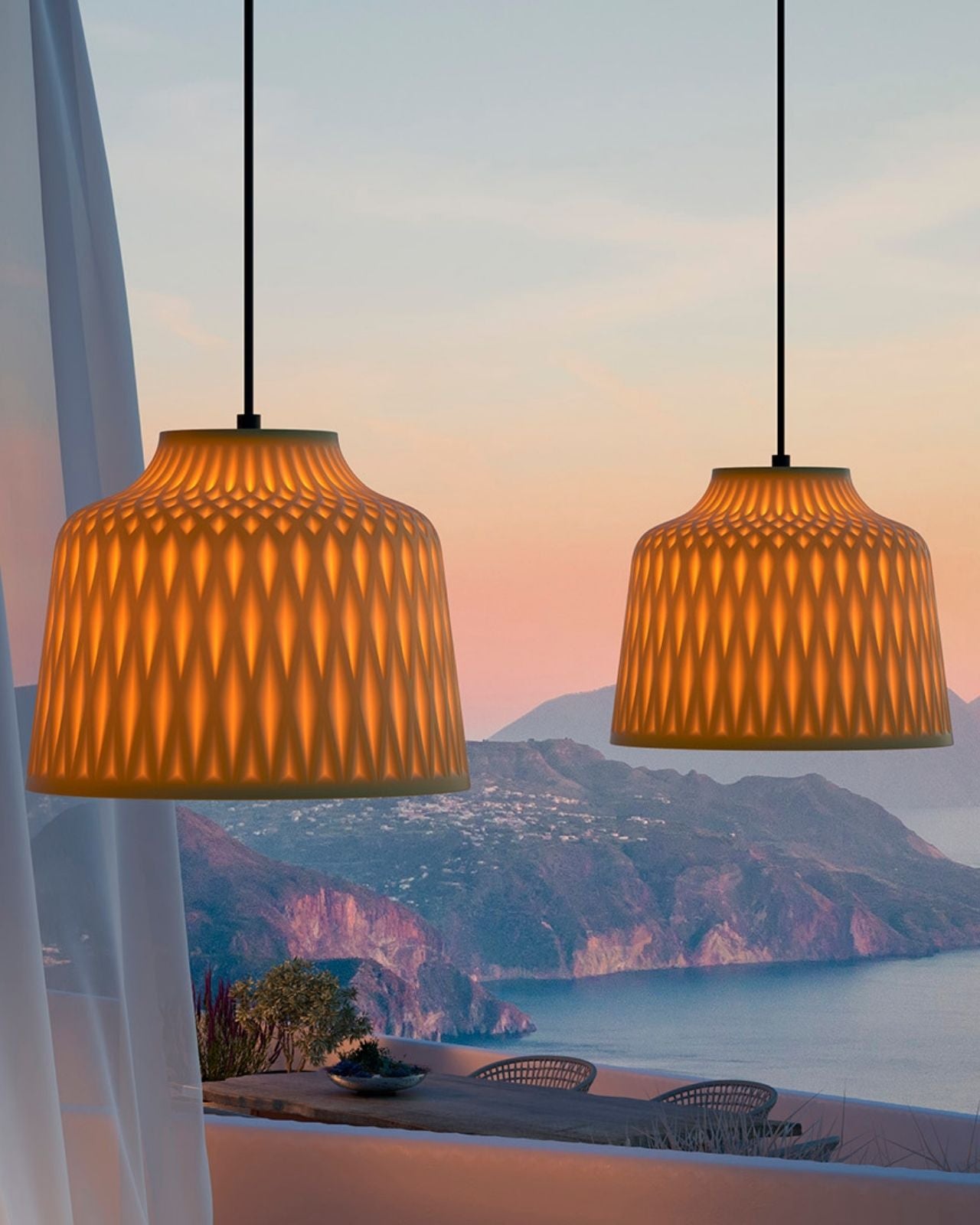 The Exterior Silicone Pendant Light, designed and crafted in Barcelona, is a flexible pendant available in three finishes, Ochre, Light Grey and Olive Grey. Made from silicone, this unique material comes with many benefits. The semi-translucent nature of silicone allows the shade to glow from within. This pendant can also be easily disassembled and wiped down for cleaning. Inspired by the patterns of Bohemian glass, this fitting is a unique focal piece, ideal for harsh weather.
