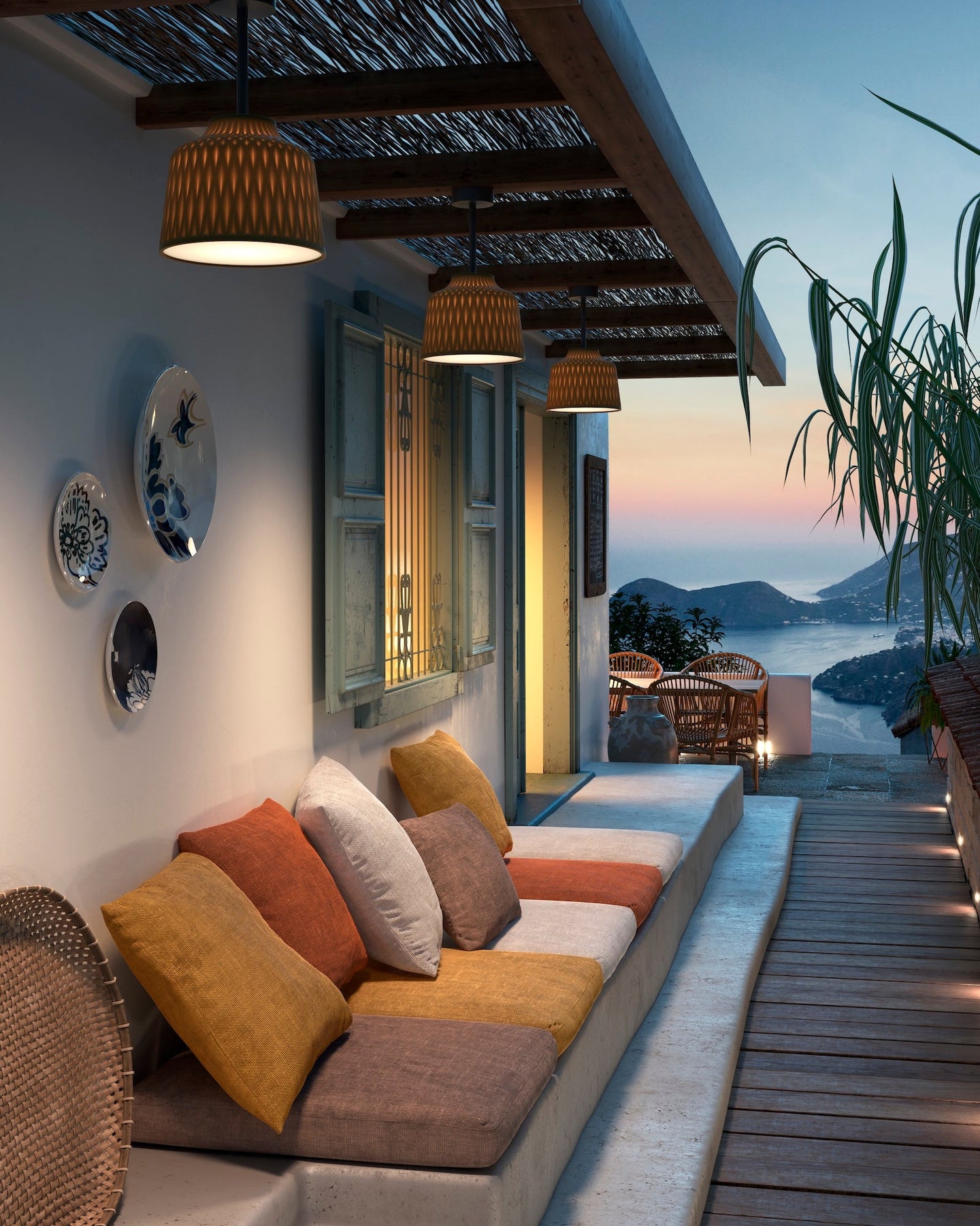 Dining table and Exterior Pendants with scenic view of a mountainous landscape at sunset.