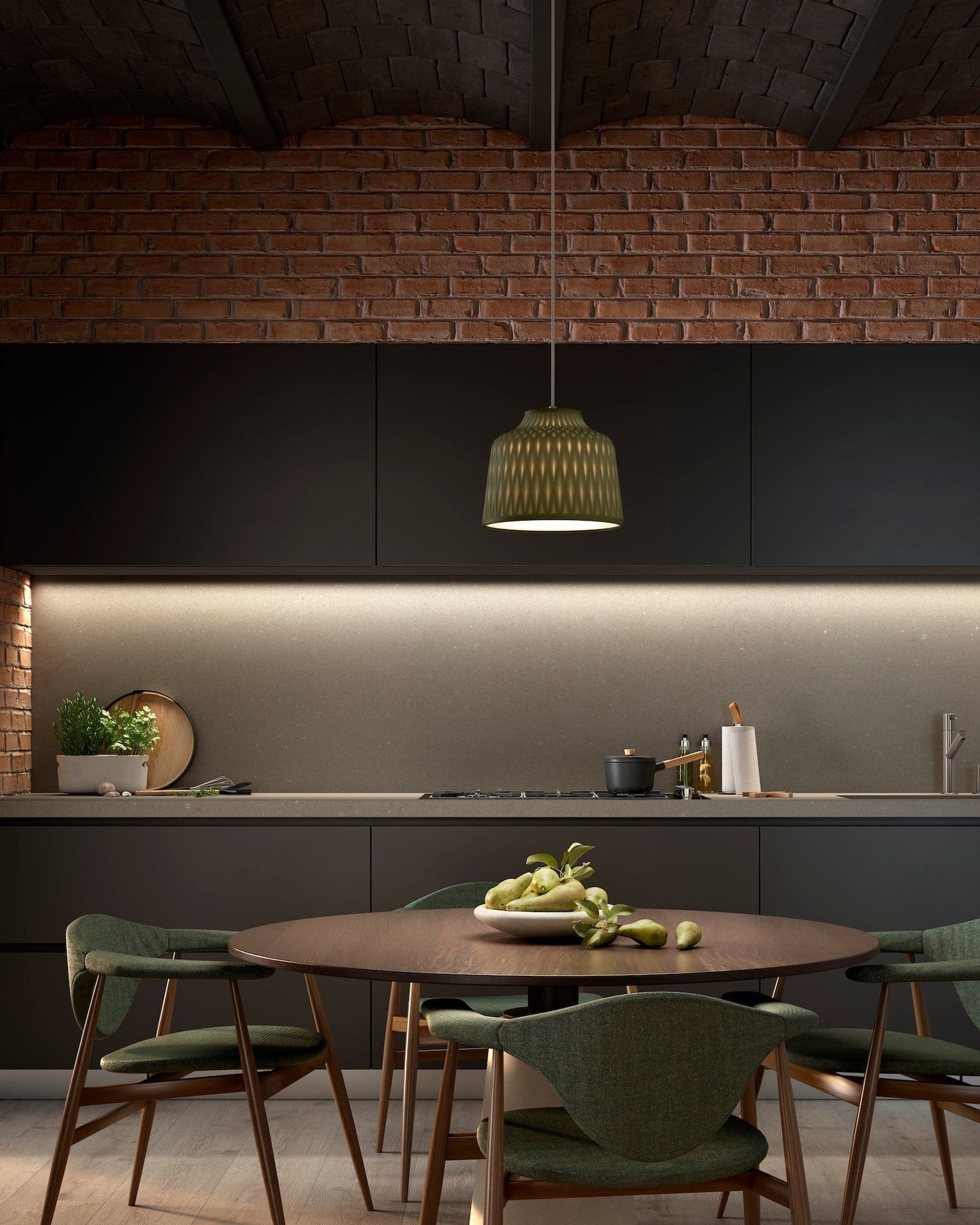 Modern kitchen with round dining table and chairs, Silicone pendant light, and brick wall.
