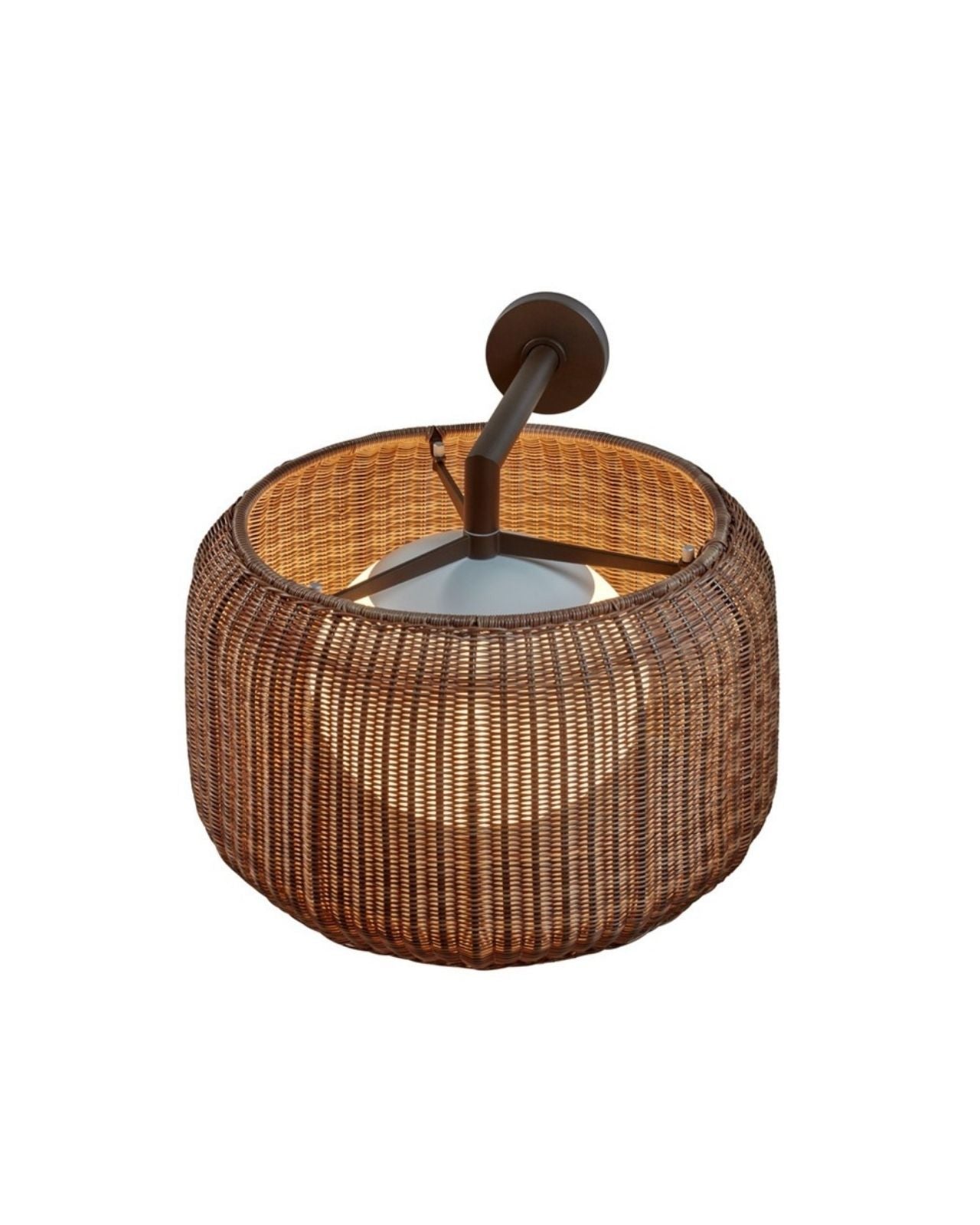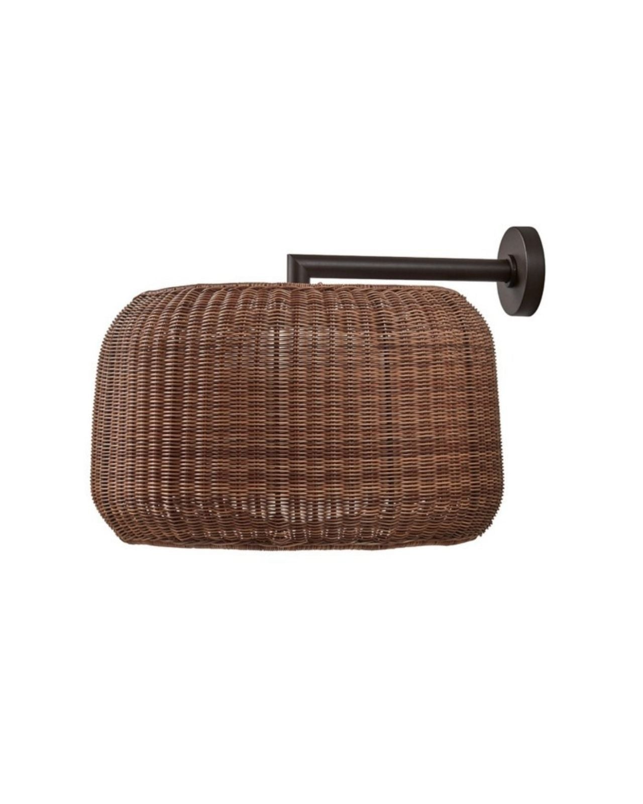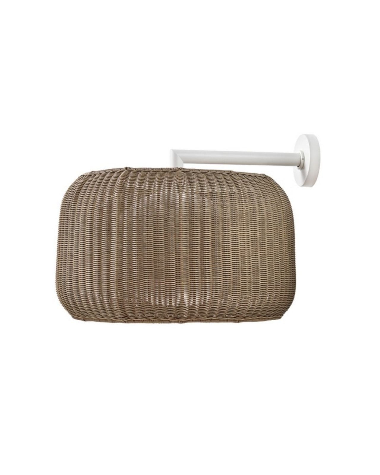 Designed and crafted in Barcelona, Spain, this exterior wall light features a woven synthetic wicker shade that is highly resistant to the elements, with an IP66 rating for durability. Inside the woven shade, a polythene diffuser ensures additional water-tight protection. This Spanish wall light emits a warm, inviting glow, making it suitable for both interior and exterior spaces. It is available in two rich finishes: a light beige shade with a natural white bracket, or a brown rattan shade with a graphite brown bracket.