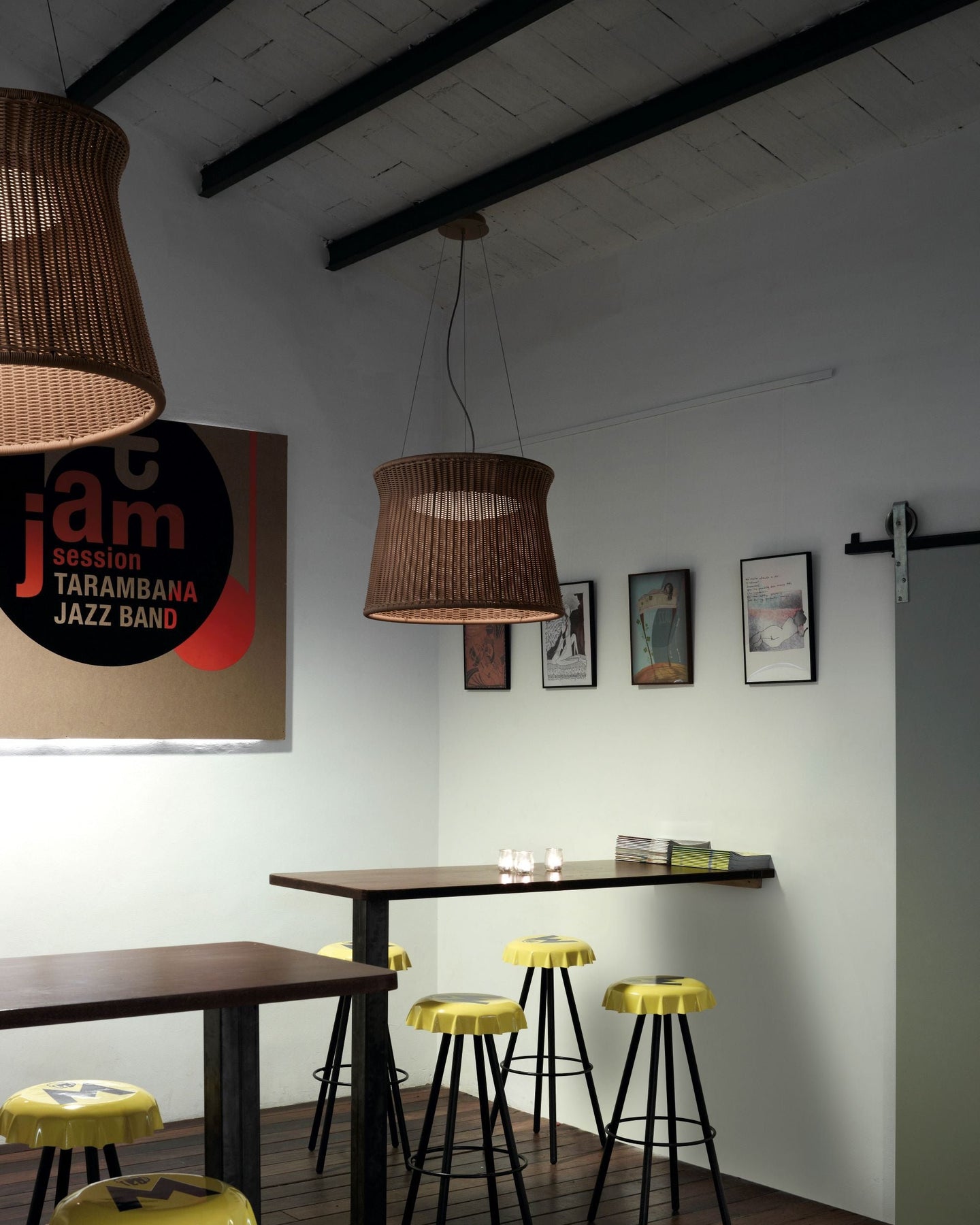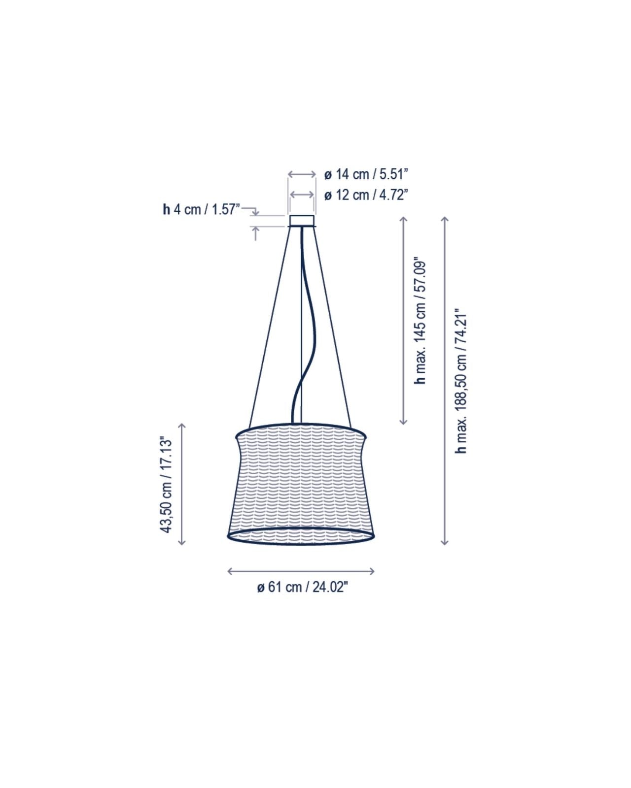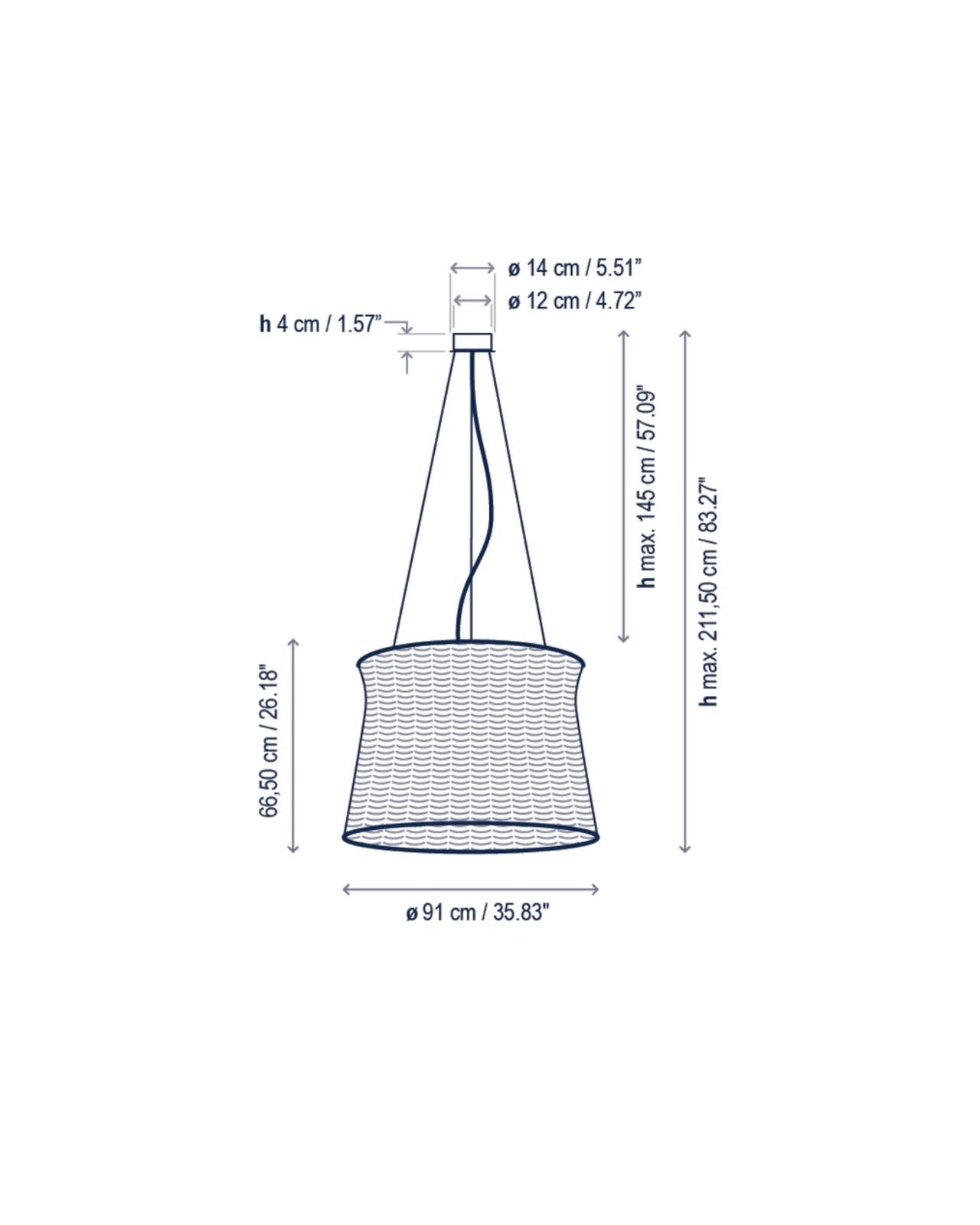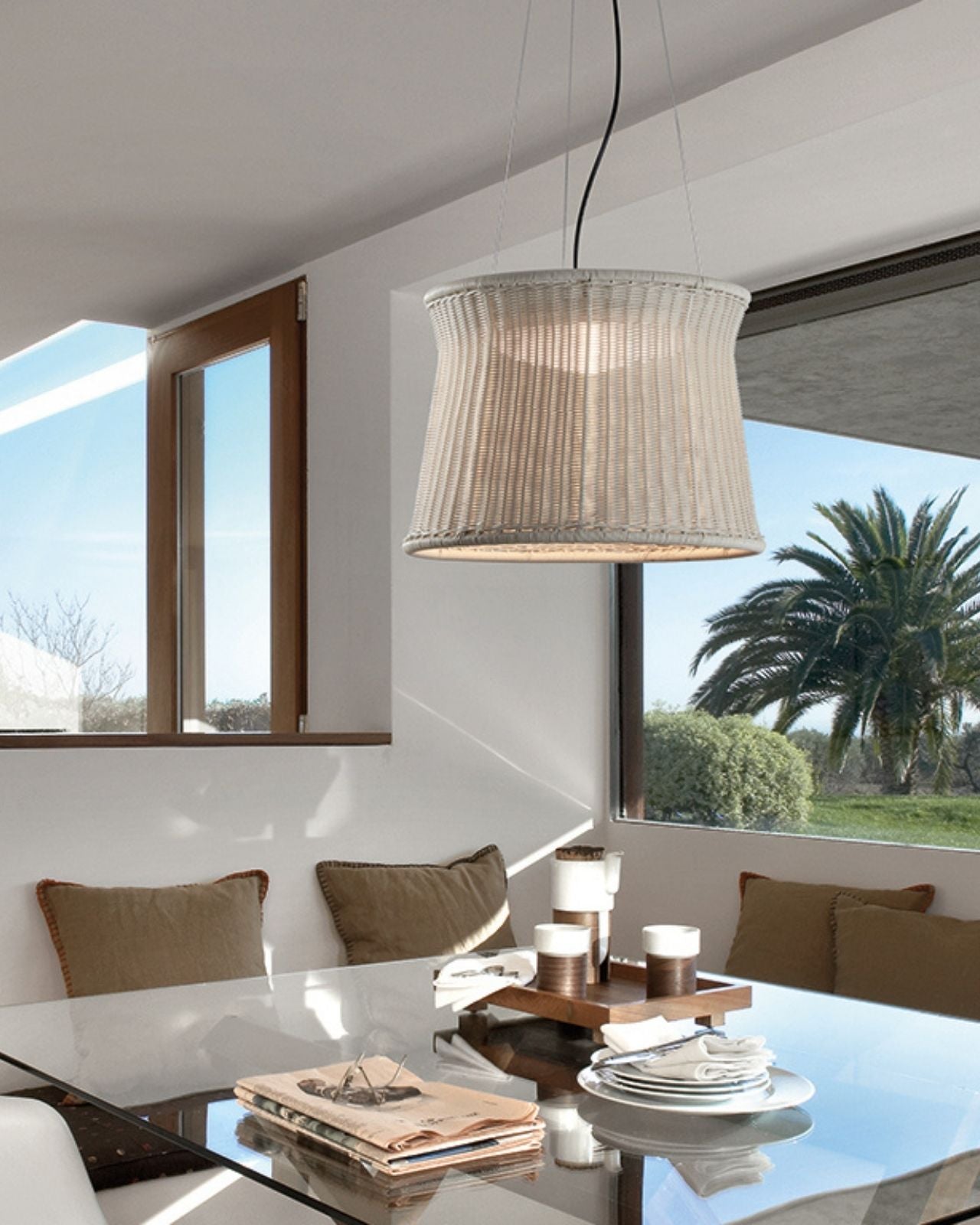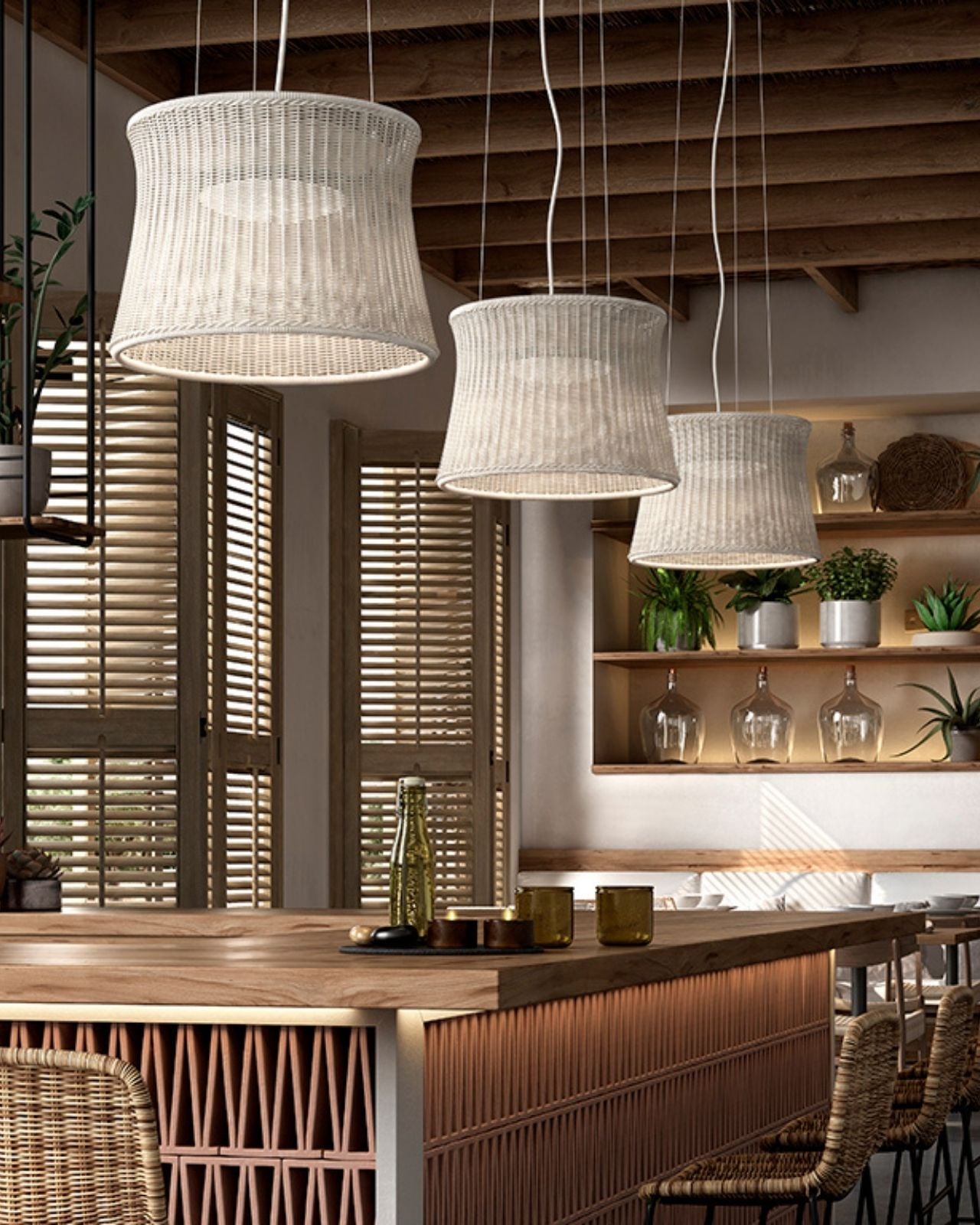 The Woven Basket LED Pendant, designed and crafted in Barcelona, boasts an asymmetrical shade that serves as an eye-catching focal point. An opal glass panel diffuses the integrated LED, while the hand-woven synthetic fibre shade allows light to gently filter through its gaps, creating captivating shadows and a warm 2700K glow. With an IP rating of IP66, this fitting is ideal for exterior areas.