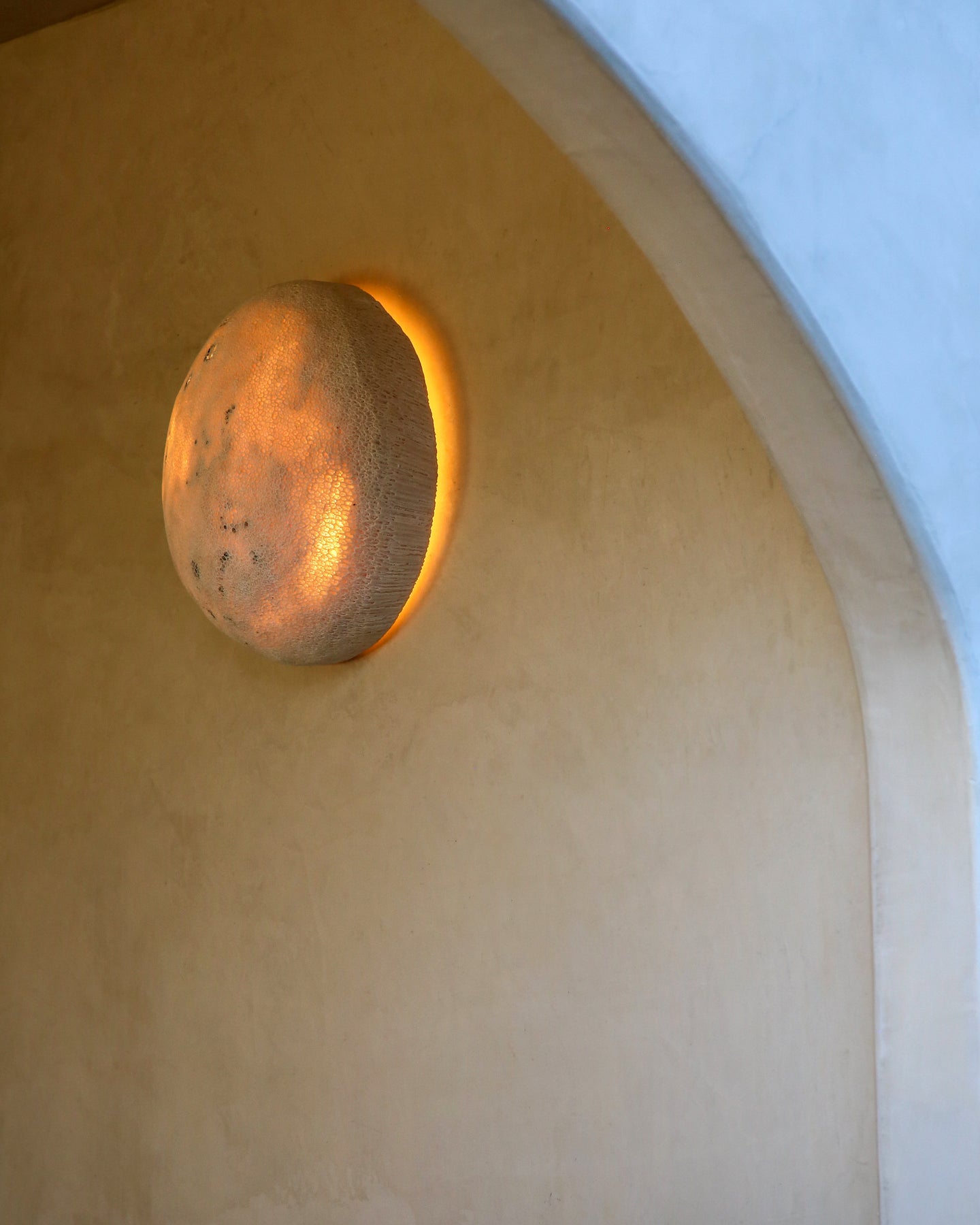 Round wall light fixture on a beige wall with a white archway.