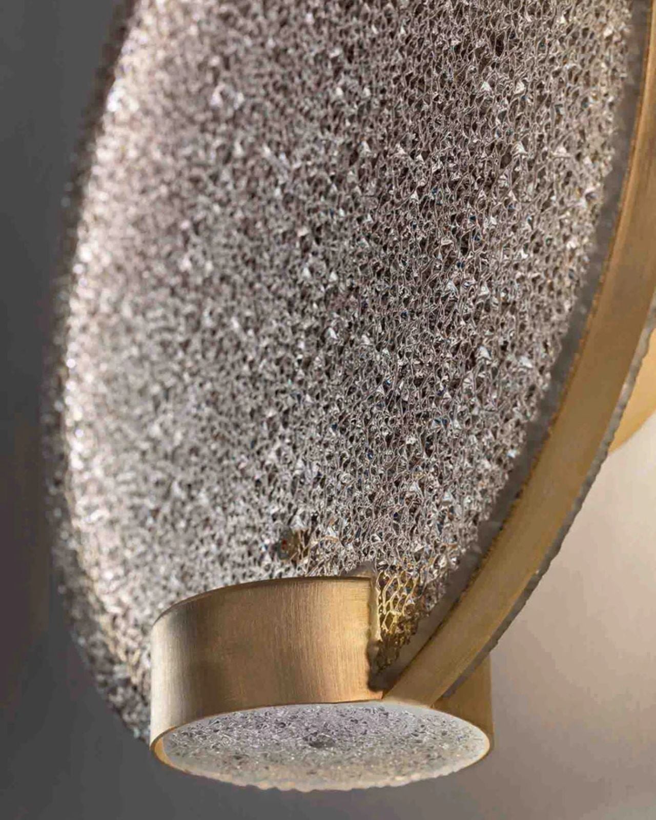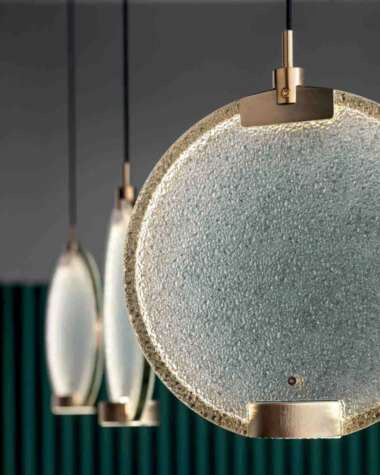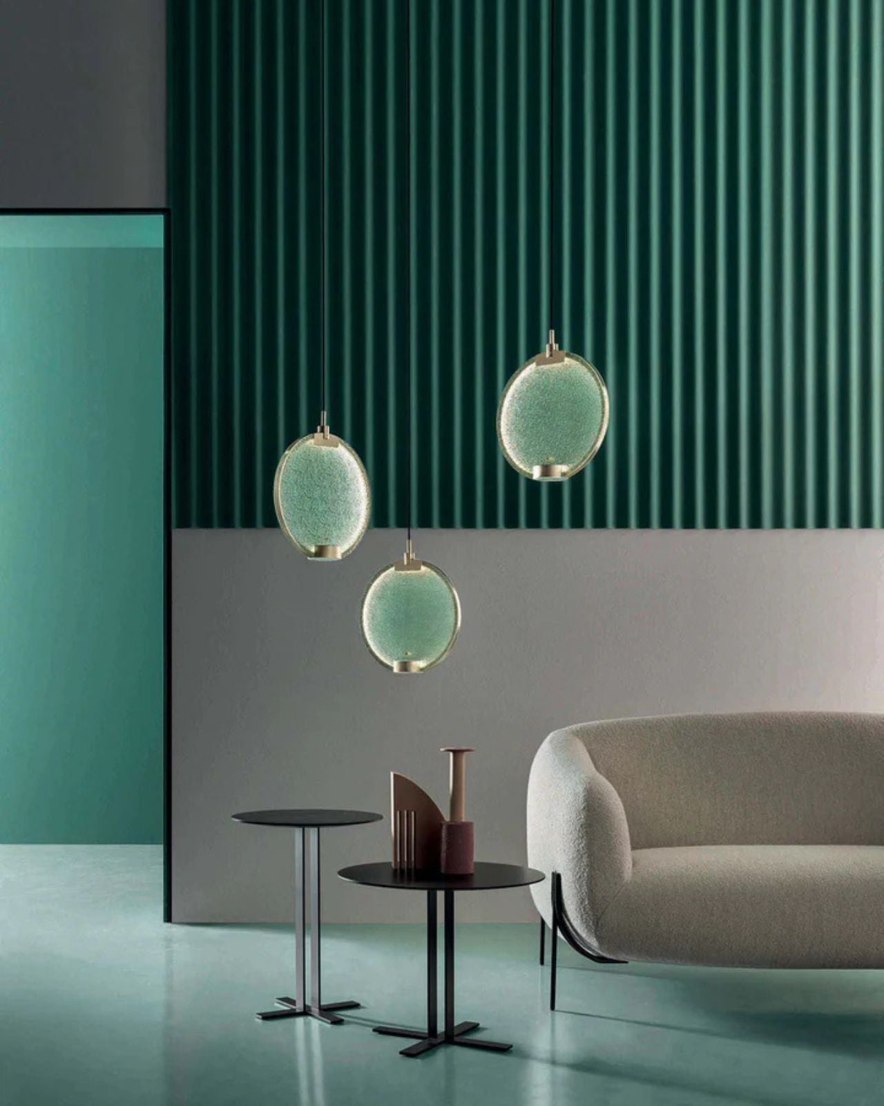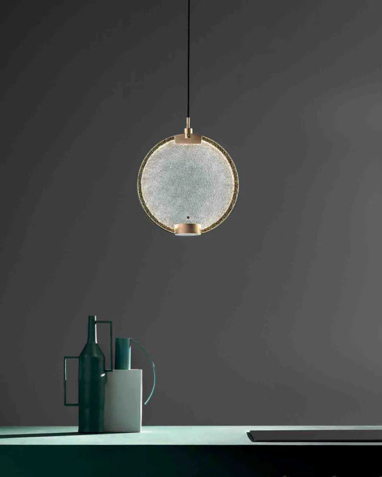 A timeless circular glass pendant using a frosted finish in a range of soft colours, this pendant light brings an artistic and creative feel to any room. Perfect as a statement piece or within a cluster. This light boasts elegance in a fun and delicate way. Prismatic glass and featured brushed brass metal details bring a colour ethereal wonder to your rooms.