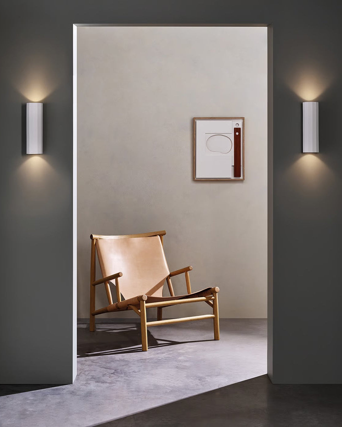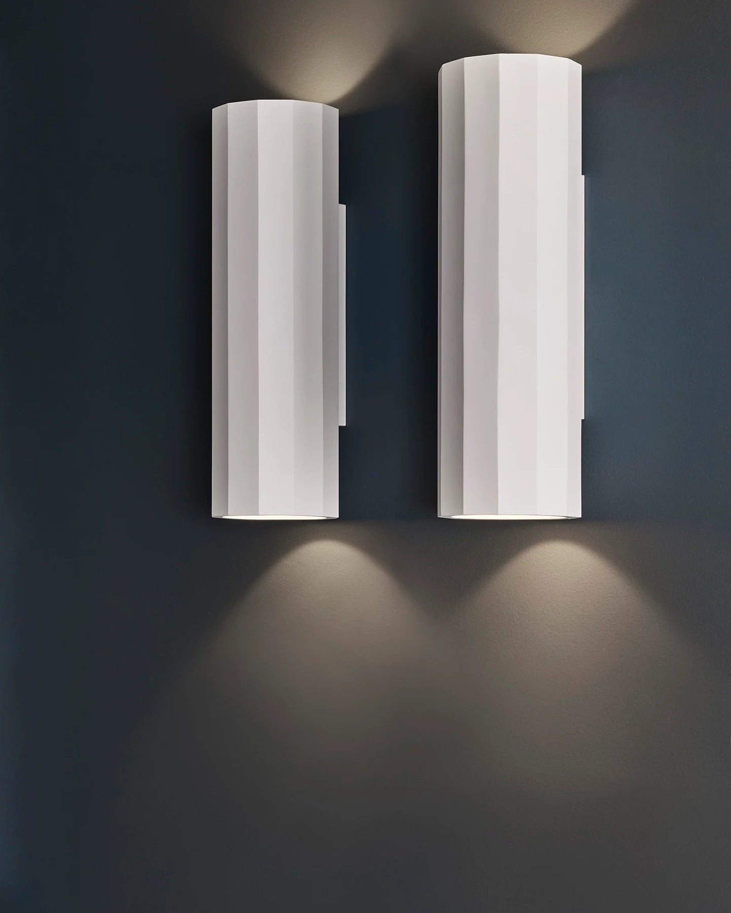 Made from high-quality plaster this wall-mounted light features a clean contemporary design with geometric contouring. The shape and neutral white plaster finish make this fitting perfect for both residential and commercial interiors.