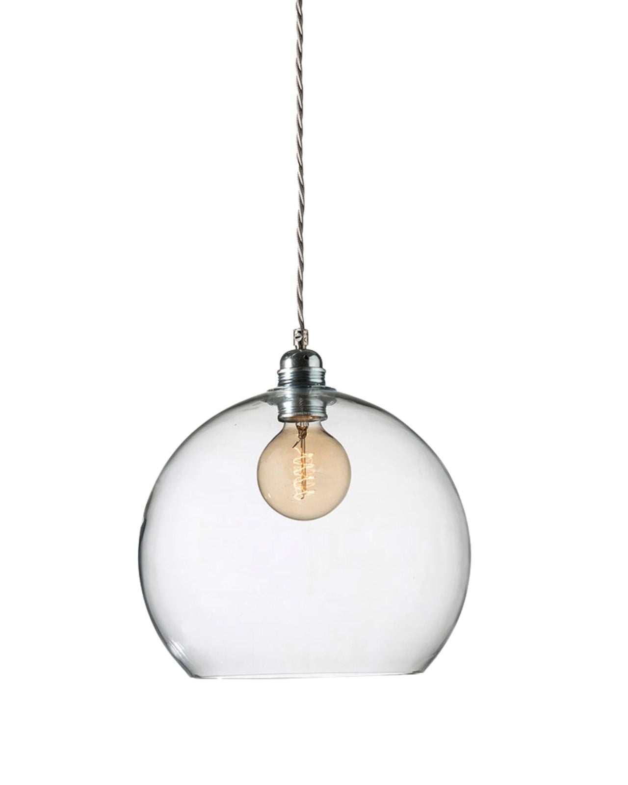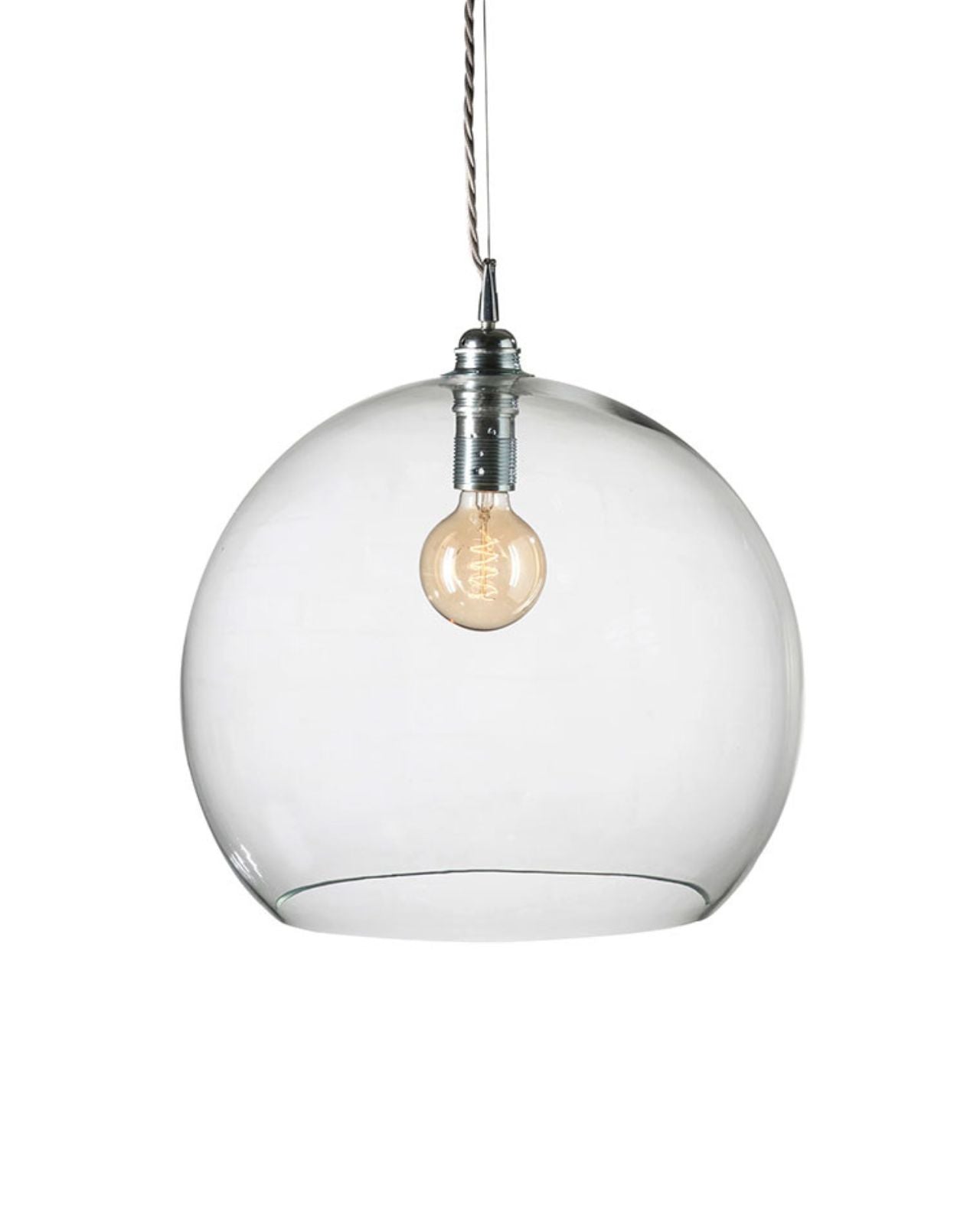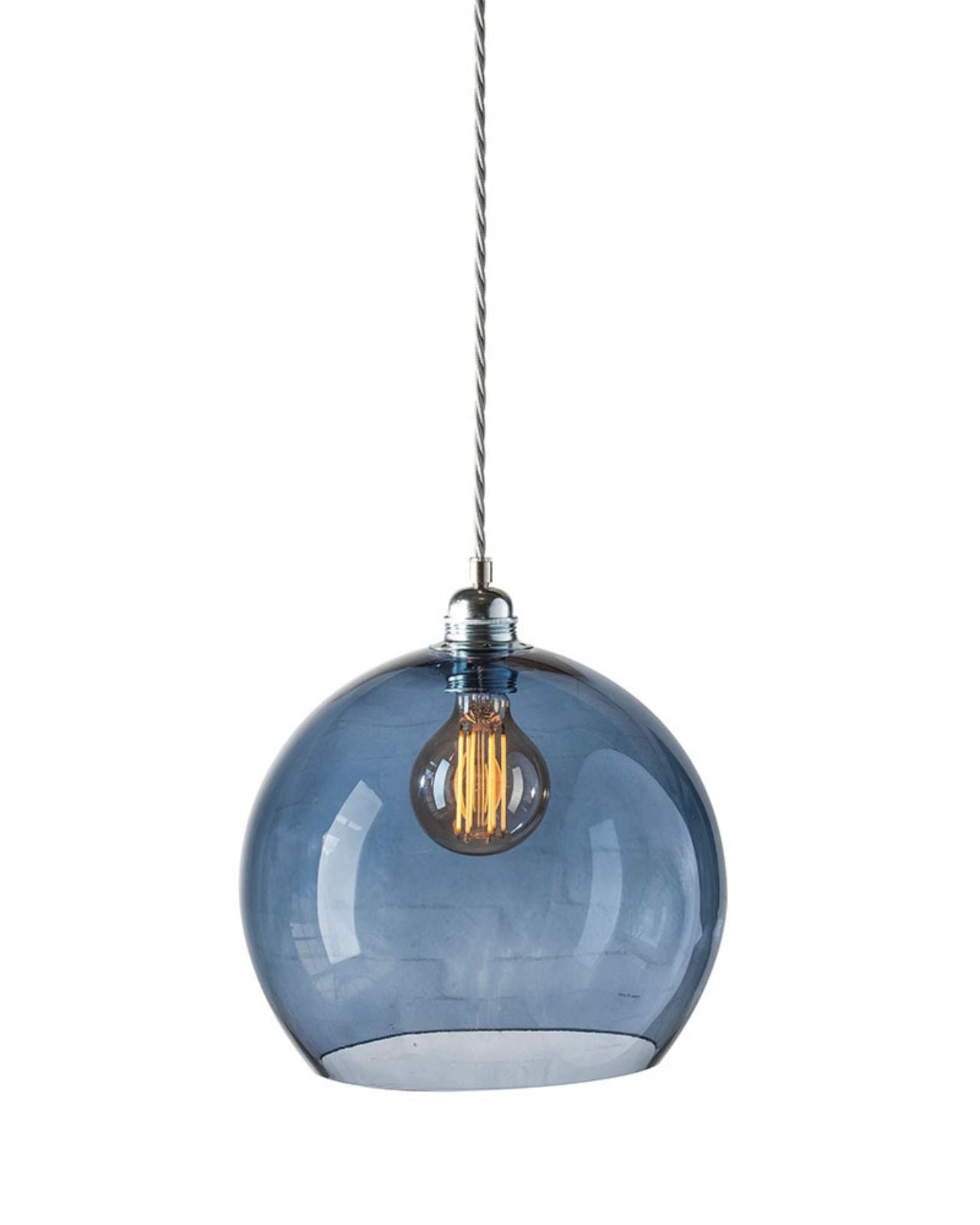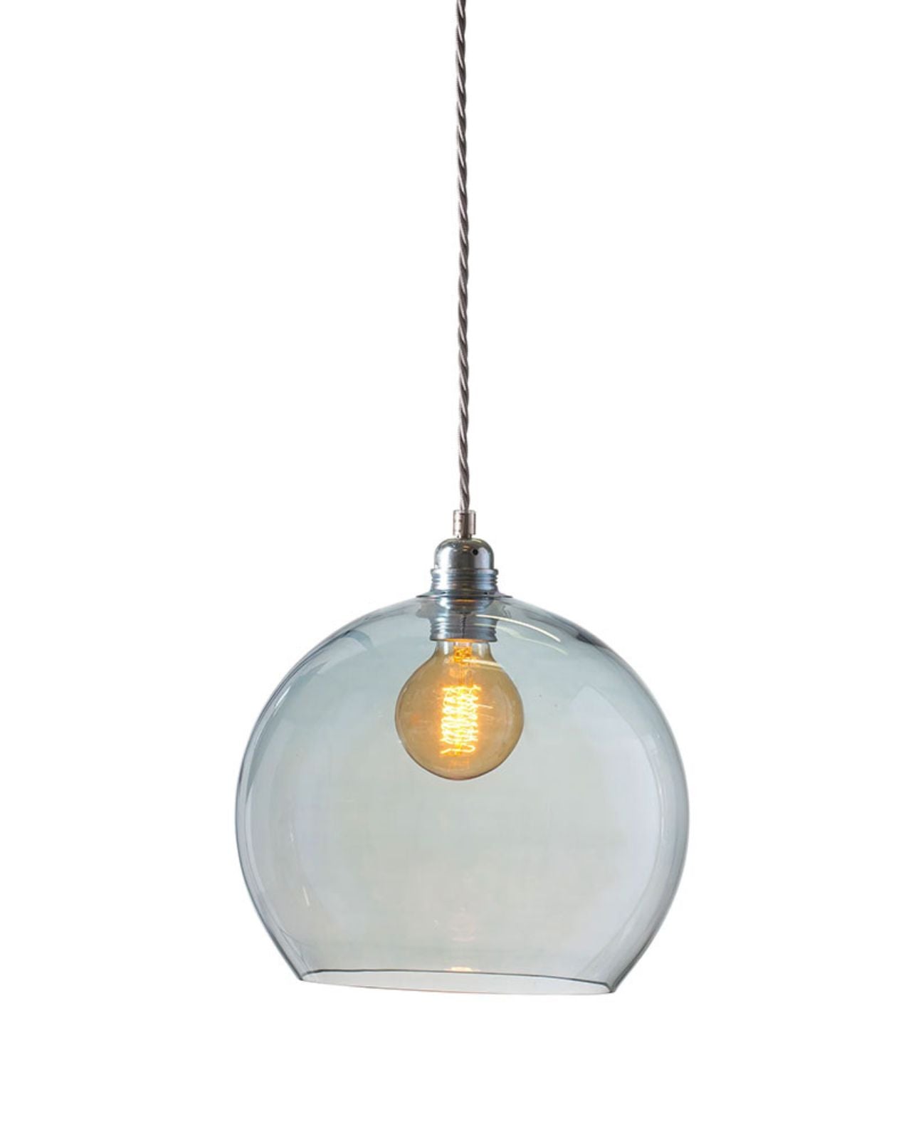 This timeless modern pendant light features a mouth-blown glass shade, a metal fitting, and a twisted silver woven textile cord. The Glass Silver Metal Spherical Pendant will stand out in living rooms, bedrooms, or kitchens, on its own or as a cluster with an adjusted suspension height, shade size, and colour. Available in four sizes and in clear, smokey grey, topaz blue, or deep blue. Due to the manufacturing process, there may be small air inclusions or slight deviations.