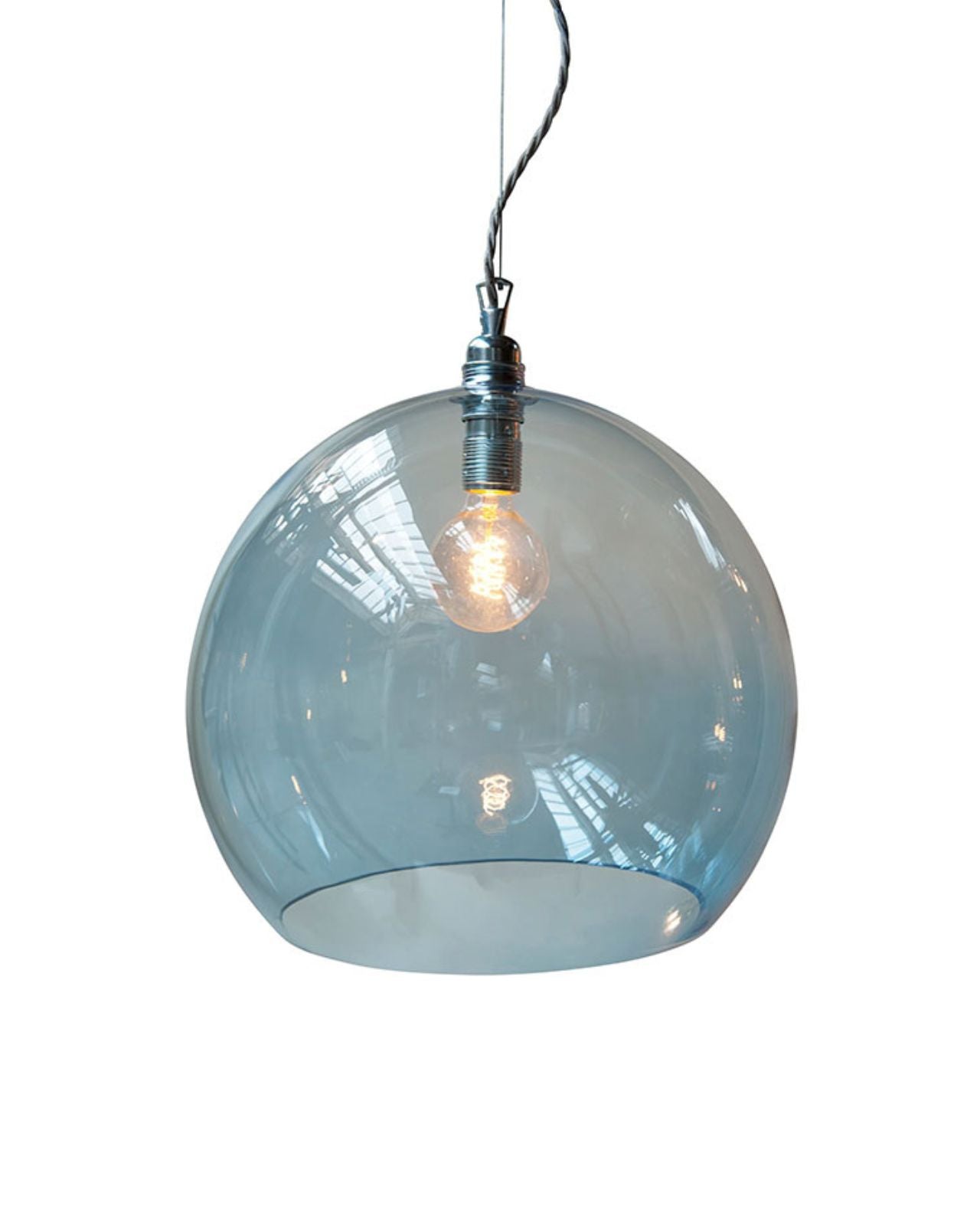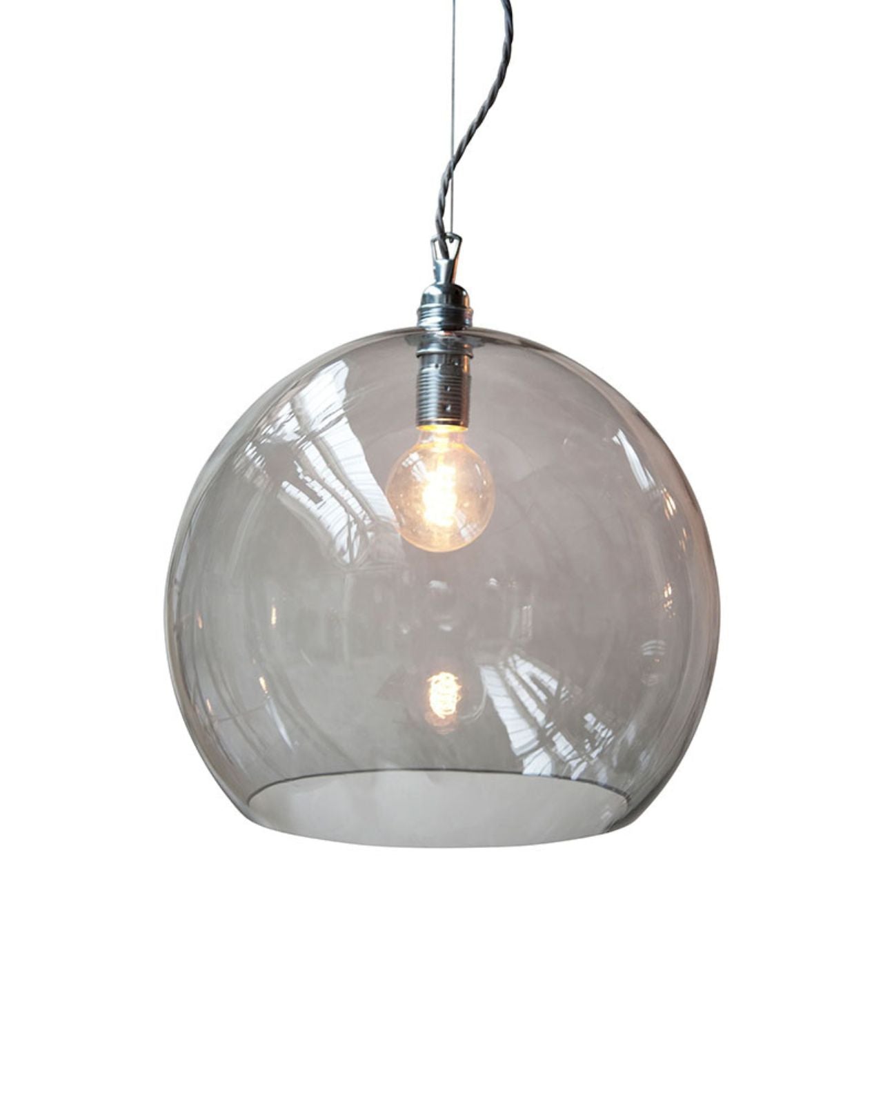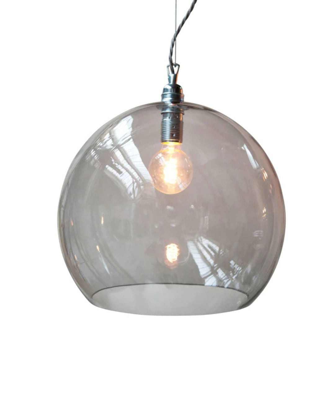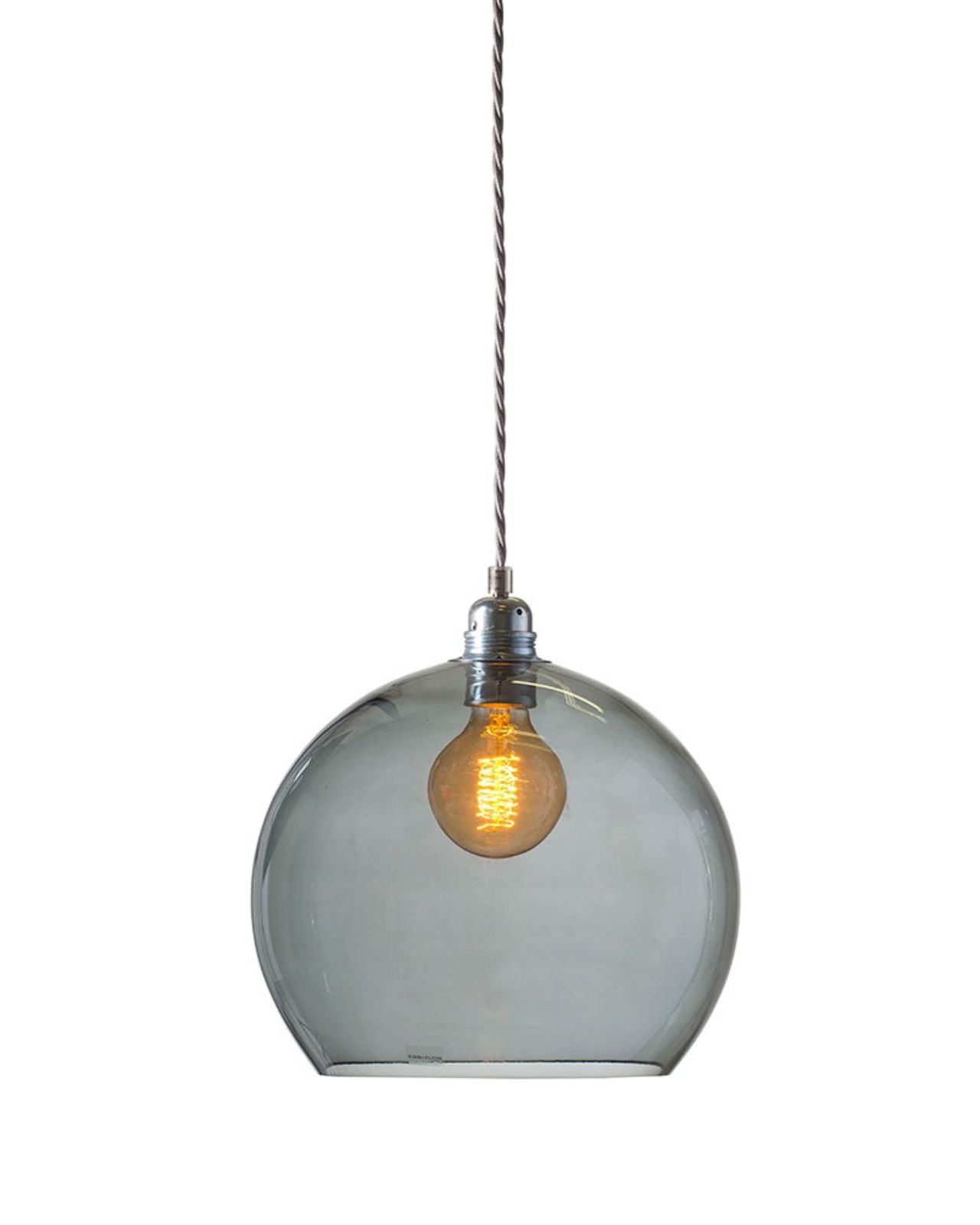 This timeless modern pendant light features a mouth-blown glass shade, a metal fitting, and a twisted silver woven textile cord. The Glass Silver Metal Spherical Pendant will stand out in living rooms, bedrooms, or kitchens, on its own or as a cluster with an adjusted suspension height, shade size, and colour. Available in four sizes and in clear, smokey grey, topaz blue, or deep blue. Due to the manufacturing process, there may be small air inclusions or slight deviations.