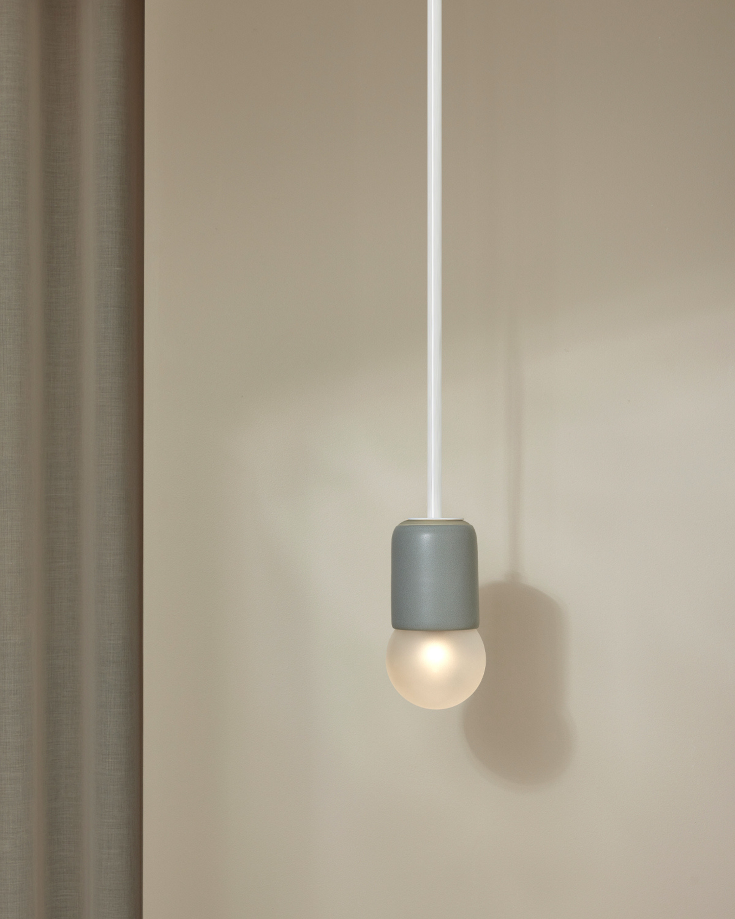 Minimalist pendant light with a ceramic base and glass shade on a neutral background