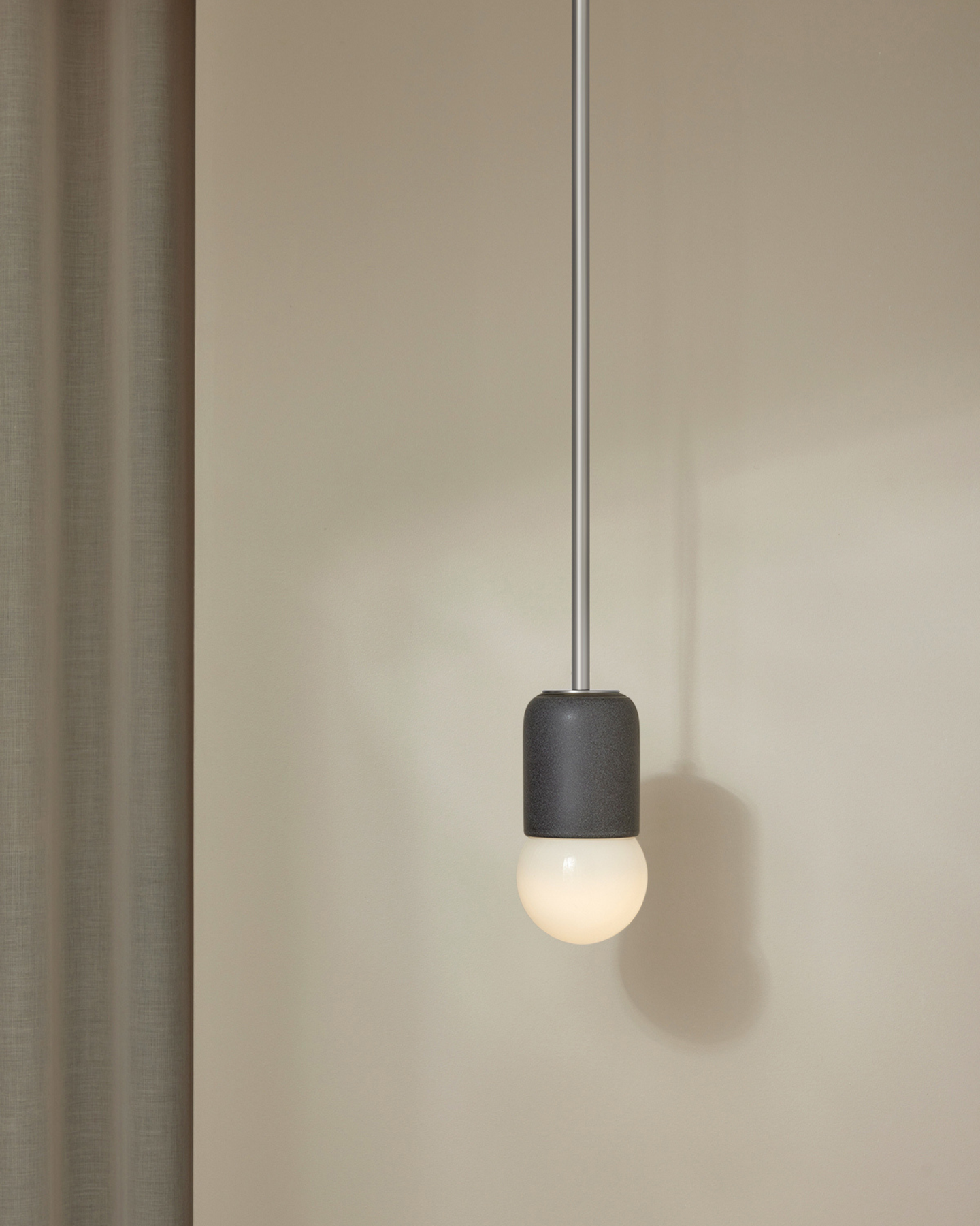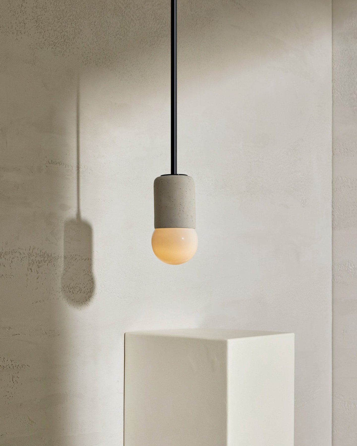 Minimalist pendant light with a black fixture and white bulb on a neutral background