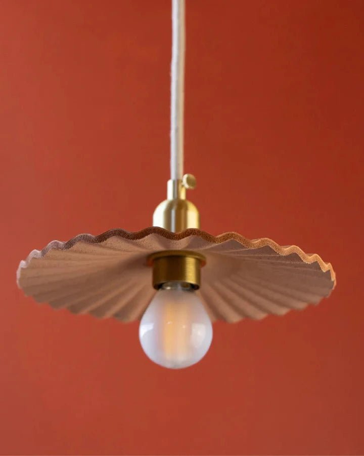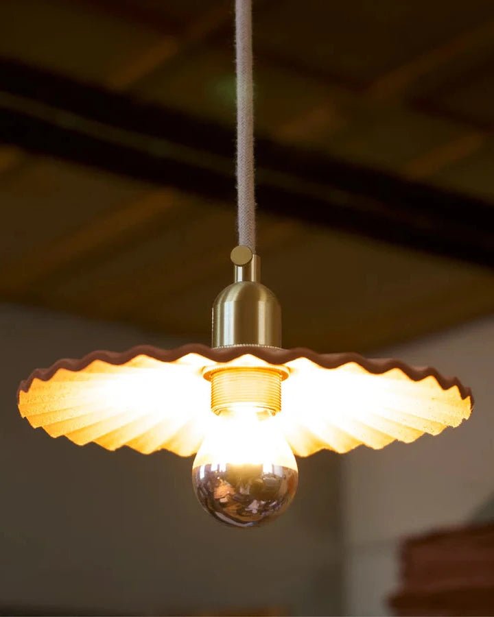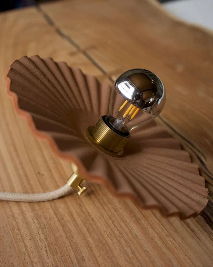 The Frillneck Pendant is a compact ceiling lamp with a pleated leather shade and brass bulb holder. Paired with a natural linen cable, the pleated surface reflects a warm and inviting light.