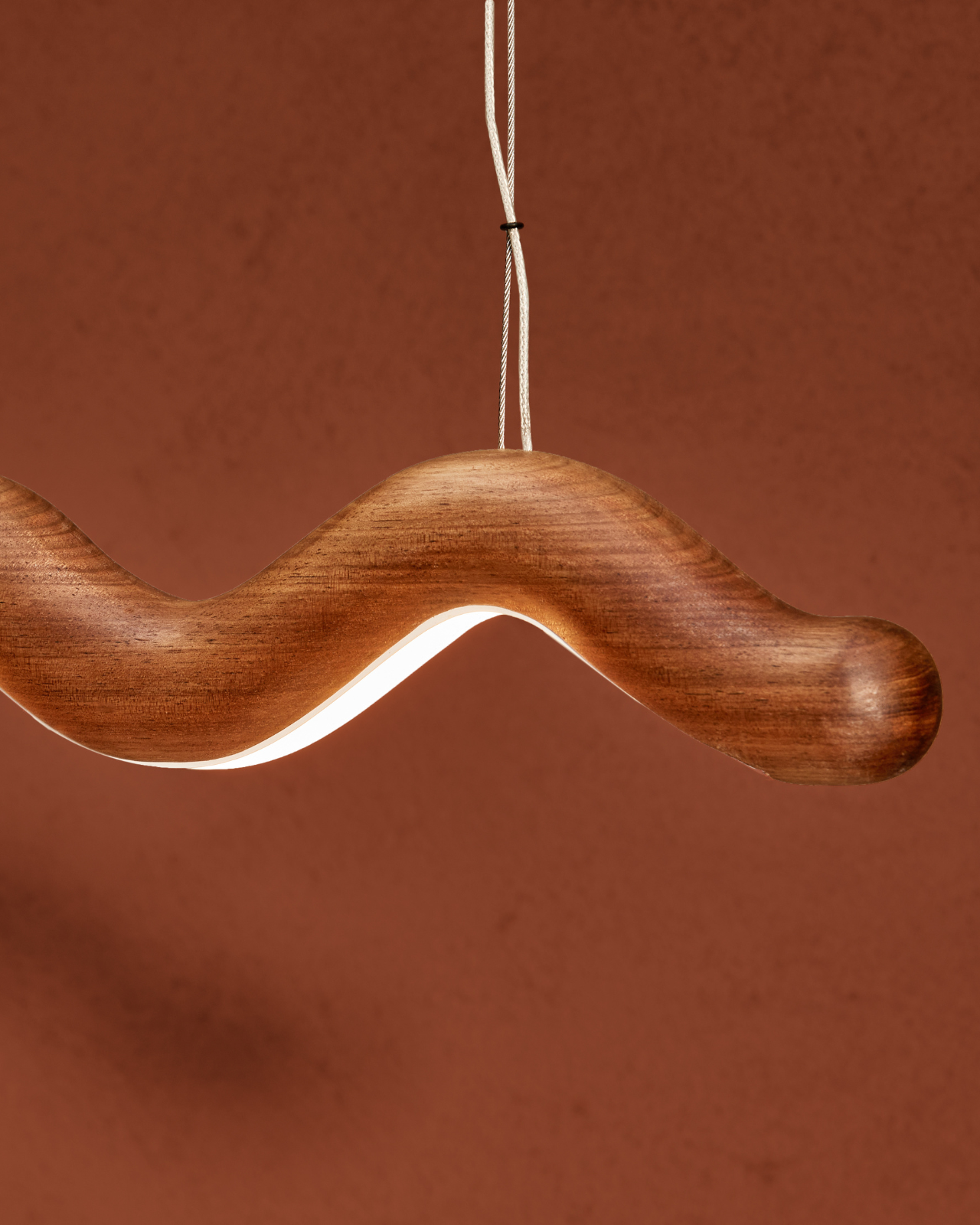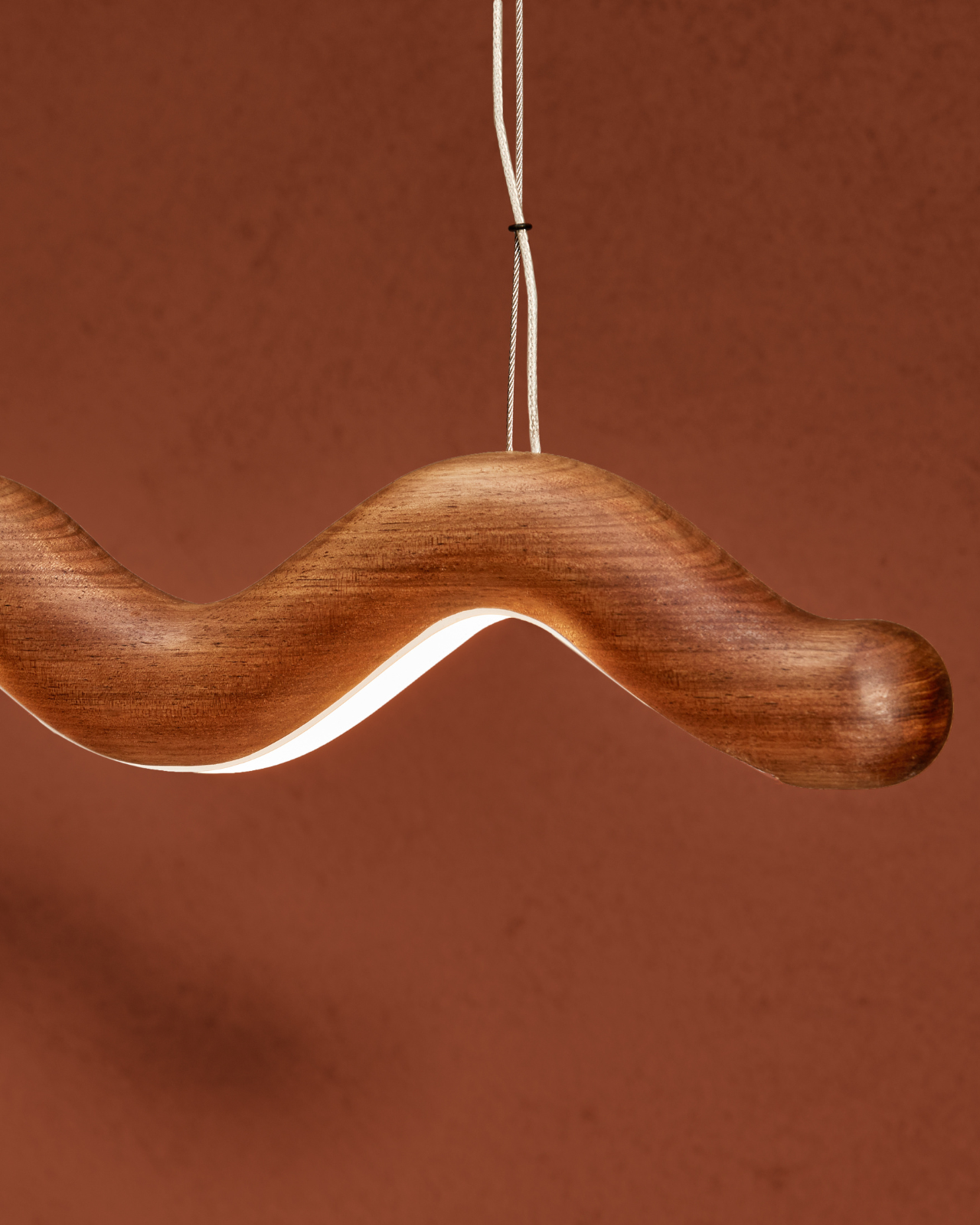 Wavey Blackwood timber pendant detail on a brown background