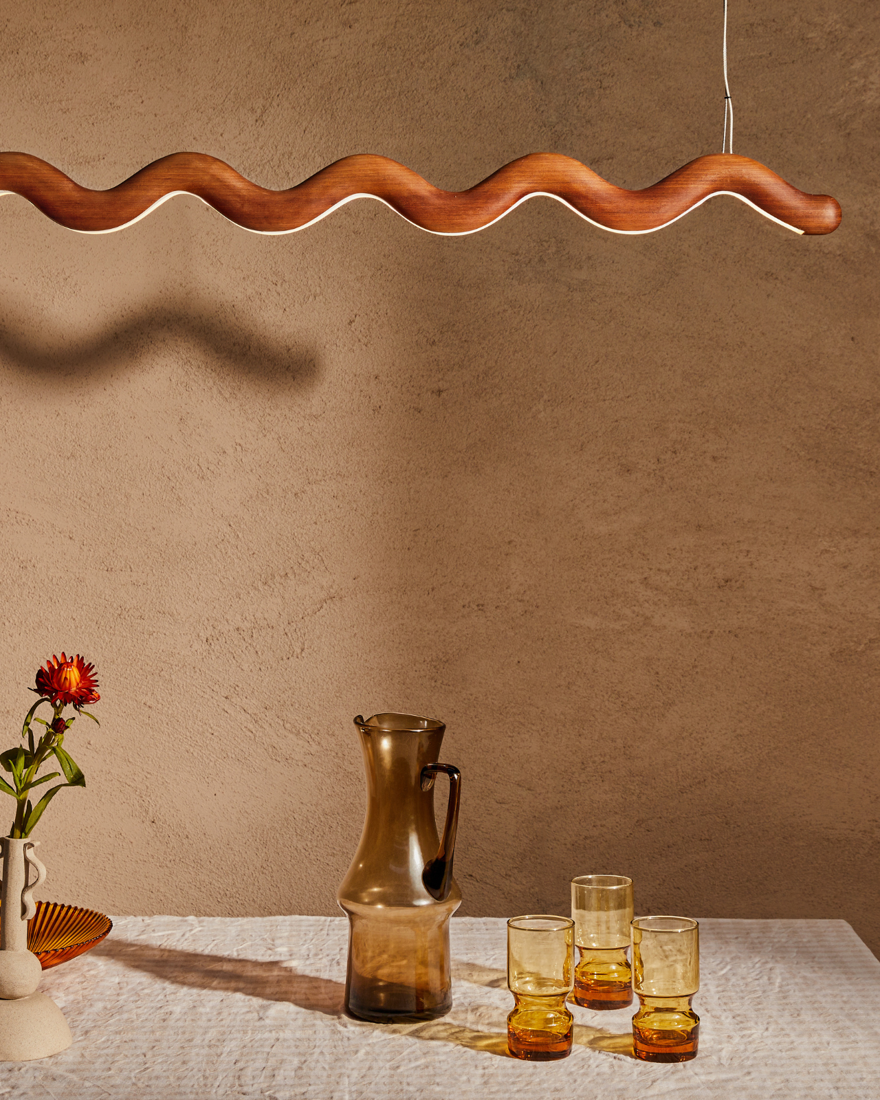 Amber glass pitcher and tumblers on a textured surface with a wavy wooden pendant above.