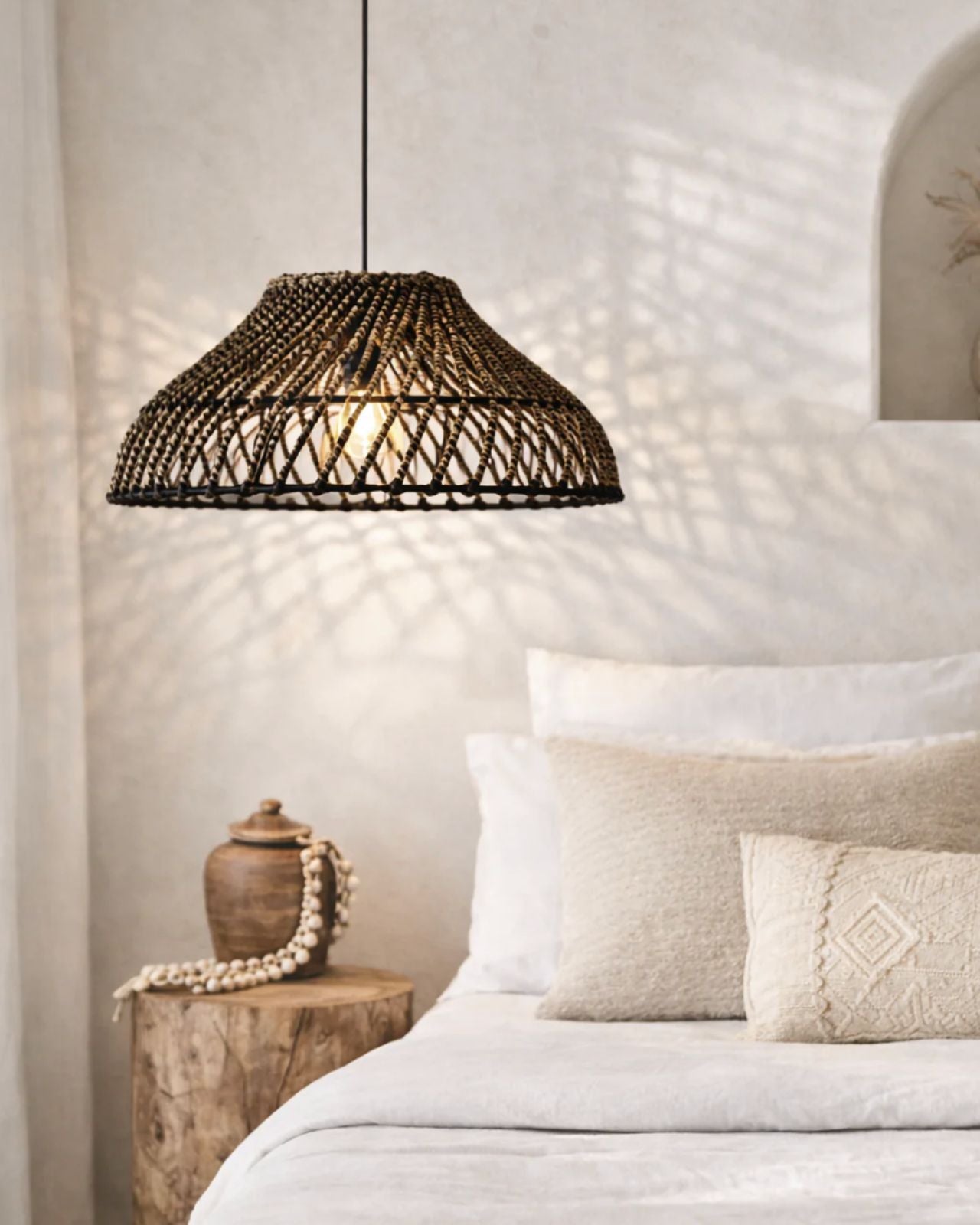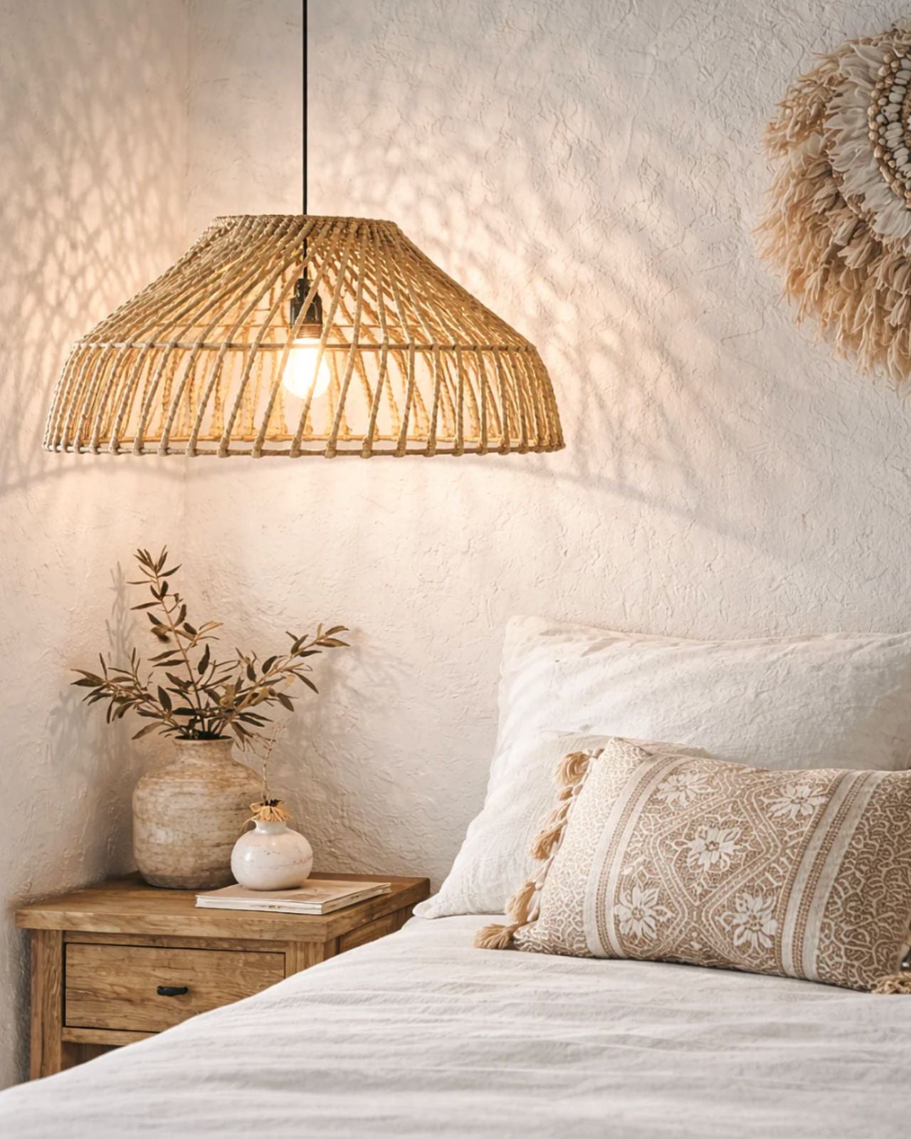 Handwoven Pendant Styled in Coastal Bedroom