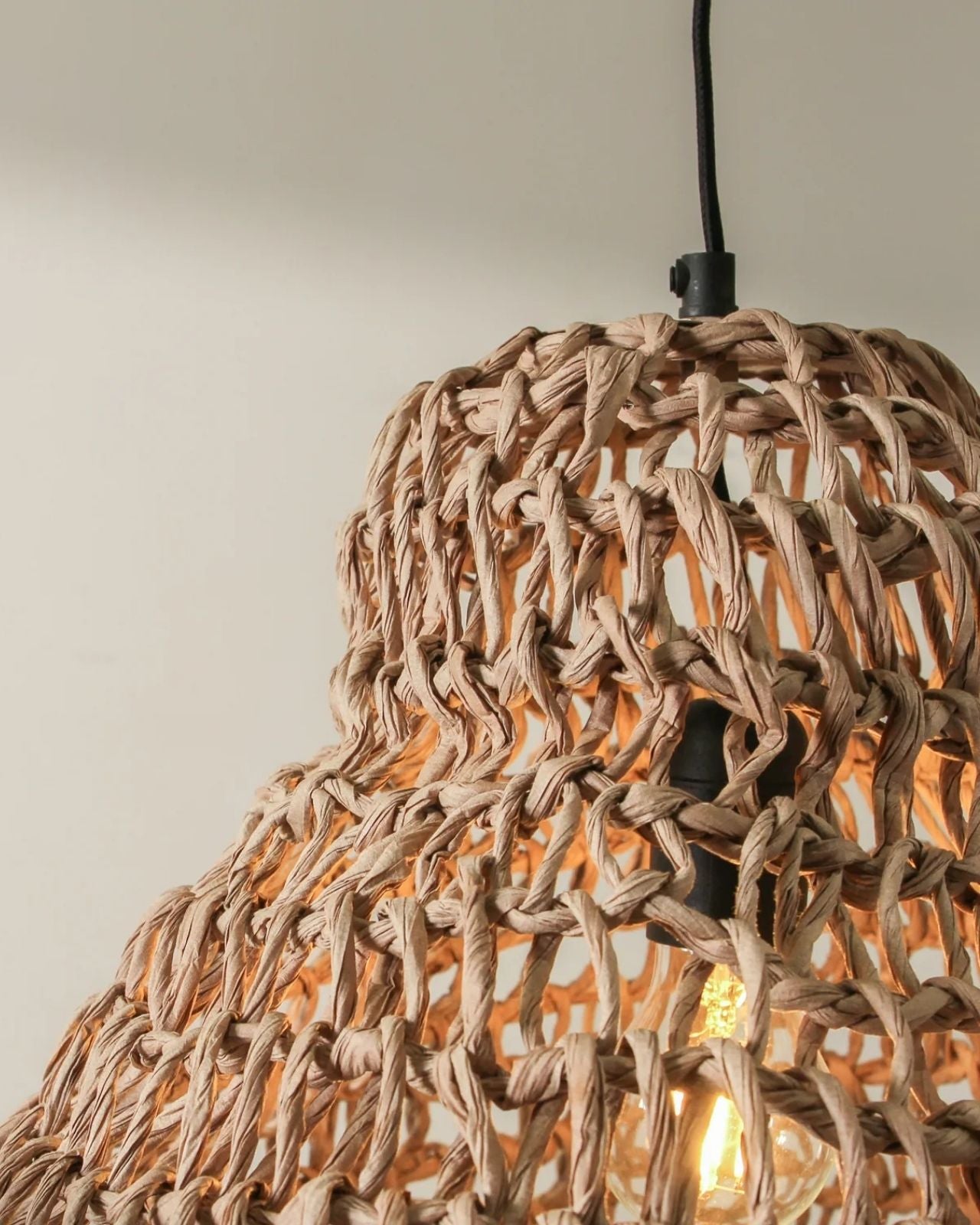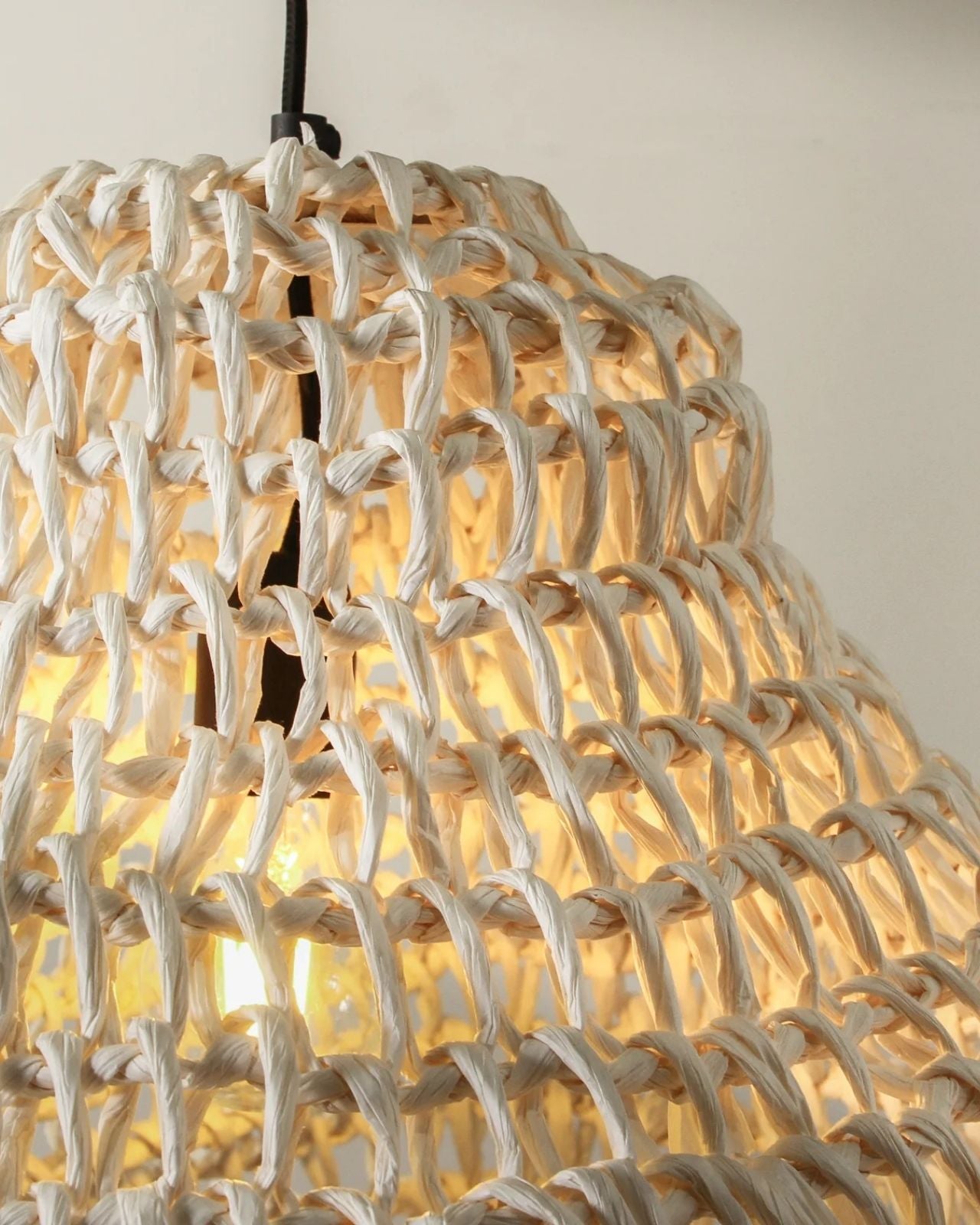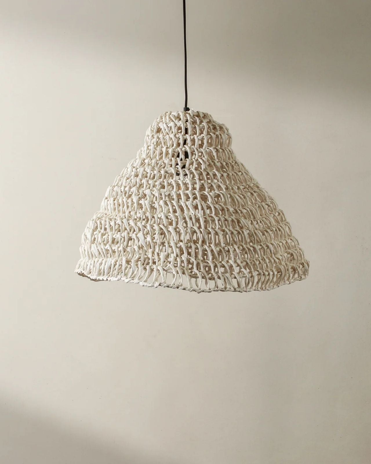 The Handwoven Paper Rope Bell Pendant features a rope construction in a natural or white finish, forming an elongated, triangle-shaped silhouette. Its organic form and soft diffusion of light is ideally paired with curved sofas, boucle textures or pale timber accents. This pendant would be best placed within a dining setting, high-ceiling stairwells, or layered installations.