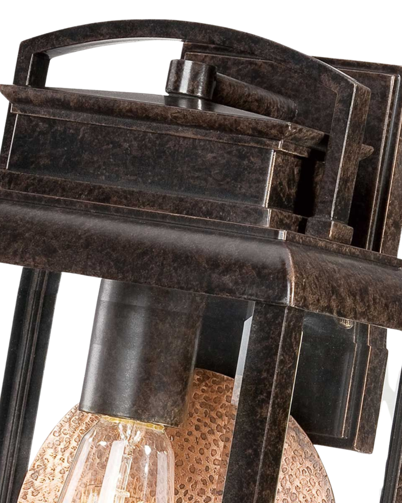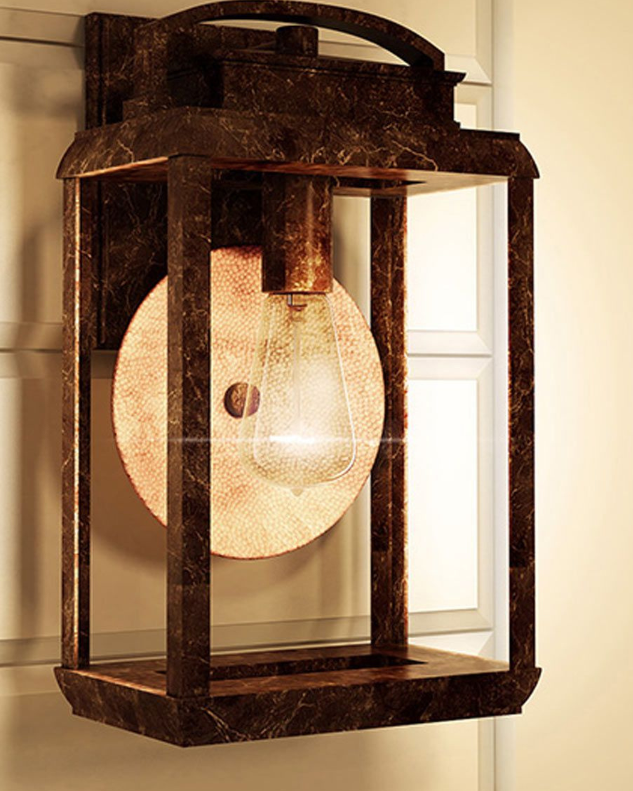 This beautiful exterior fixture features a stunning pitted plate in a copper finish that enhances the glowing light. Set within a regal lantern frame with clear bevelled glass, this light compliments the Vintage Industrial and Traditional styles and adds a historic look to your exterior.