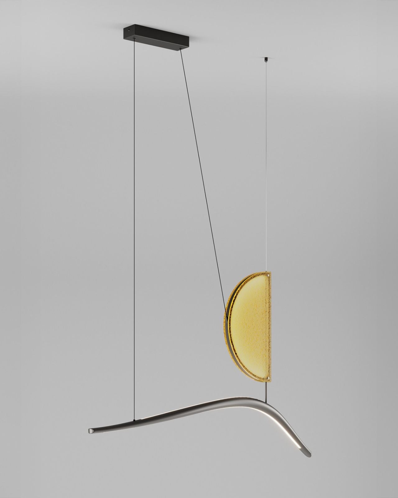 An expression of contemporary Italian artistry, this sculptural pendant light pairs architectural precision with the warmth of hand-crafted glass. The elongated silhouette is suspended from a glossy midnight grey structure, creating a striking linear presence above dining tables or statement interior spaces. The artistic glass semicircle disc is available in amber or brown, making this light perfect to be installed on its own or in a pair of the two colours for extra depth. Featured with an integrated LED light, producing a warm 3000K glow with exceptional colour rendering (CRI >90). The result is both atmospheric and refined.