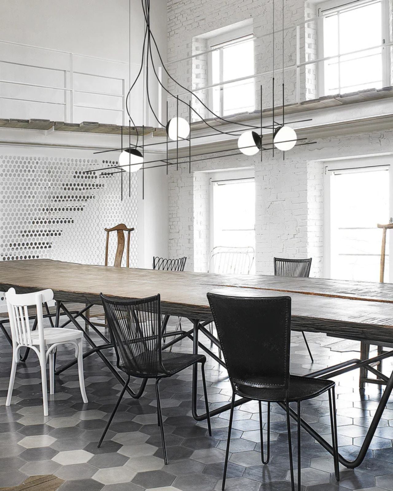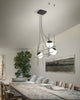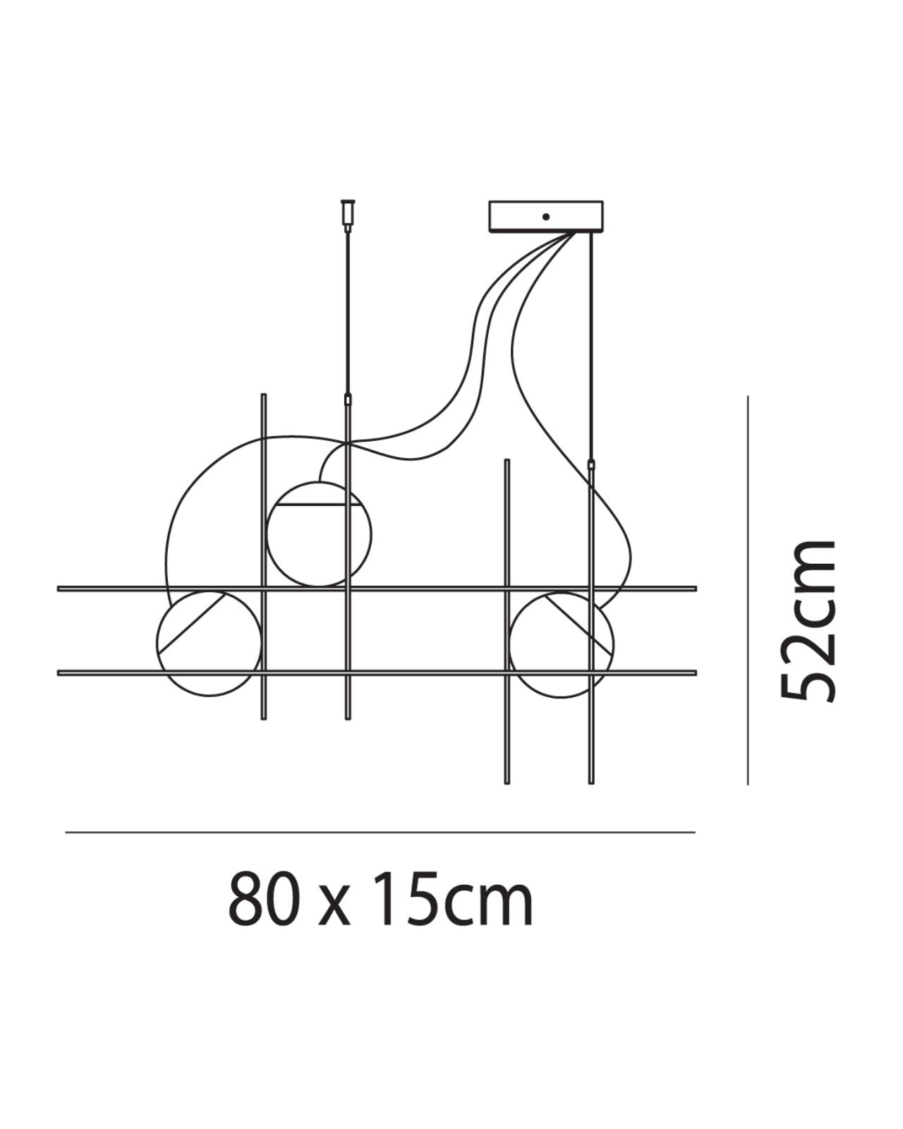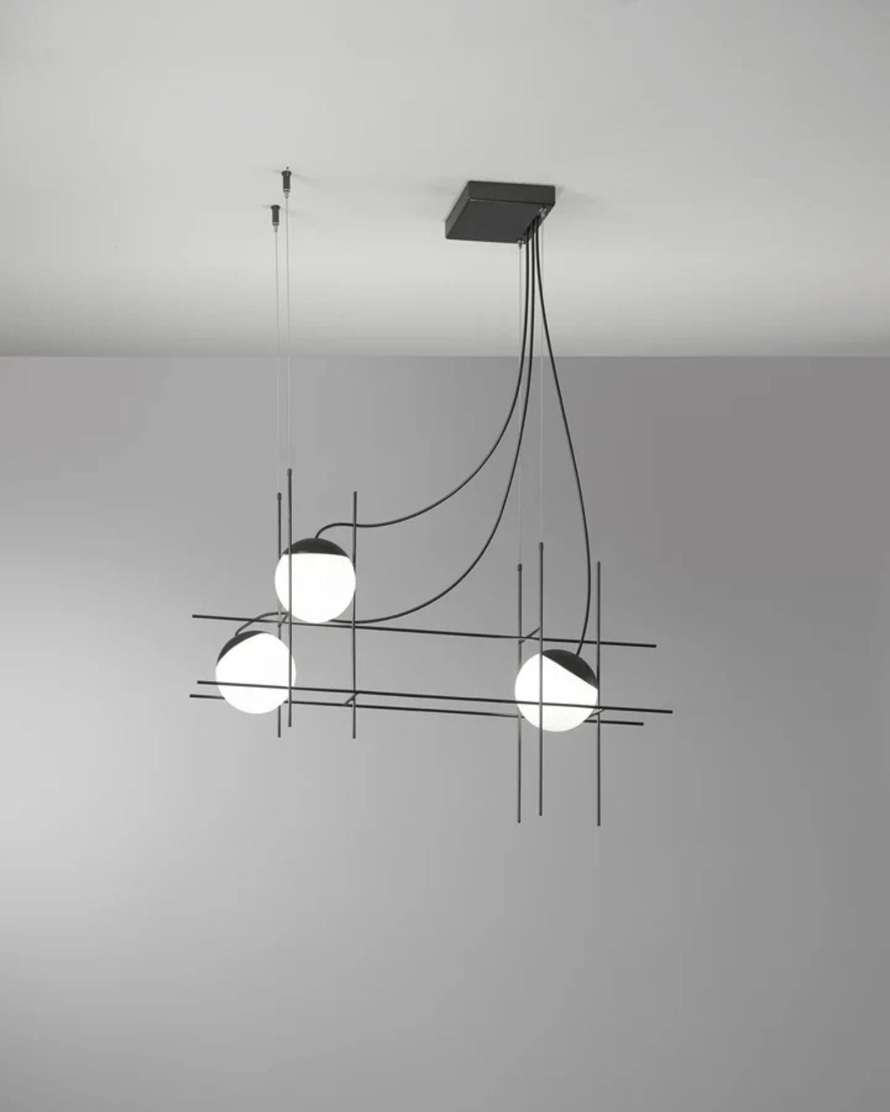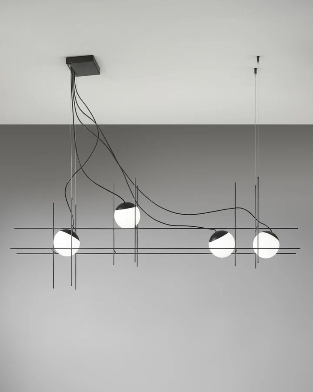 Handmade in Italy the design focus of this fitting is to create the illusion of light suspended in motion. Its linear weft crafted from Matte Black metal creates an exquisite form ideal for installation in high ceiling interior spaces over stairwells or dining areas. The capped blown glass white diffusers house a built-in LED source creating a focal point that will illuminate any room. Available in 3 or 4 light variations.