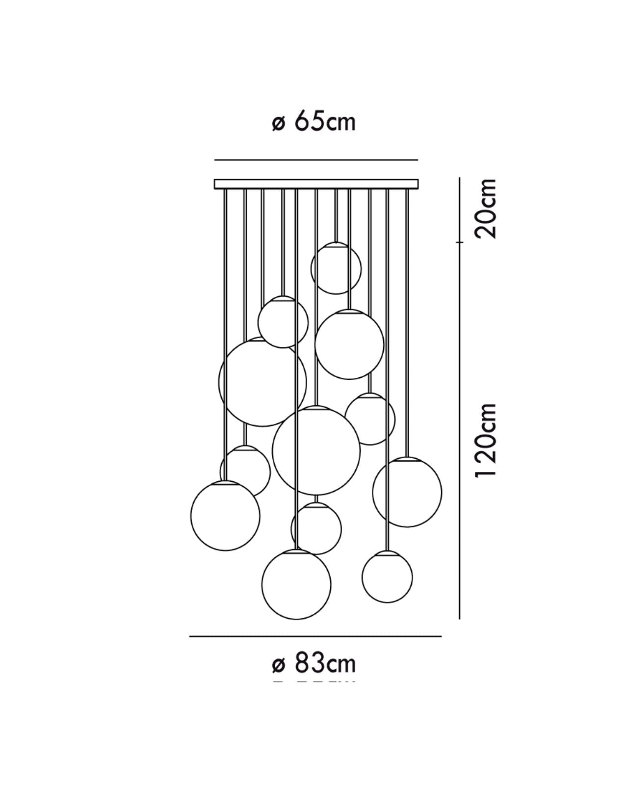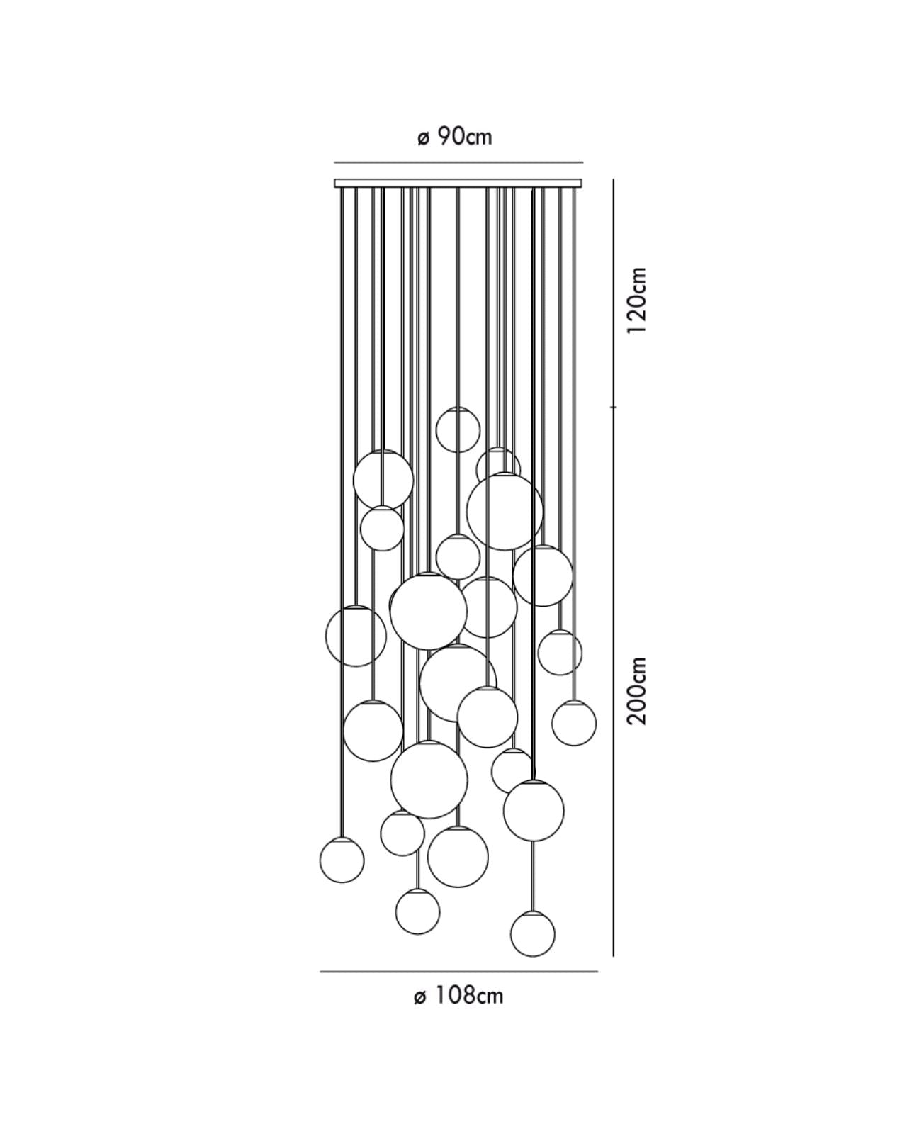 A contemporary lighting system featuring up to 24 hanging mouth blown crystal pendants, suspended from a round mounting plate affixed to the ceiling. Every version utilizes a combination of small, medium, and large sphere pendants to create an elegant composition. The diffusers feature a degrade finish for a warm and gentle glow. 100% designed and made in Italy.  Available in various sizes and colour options.