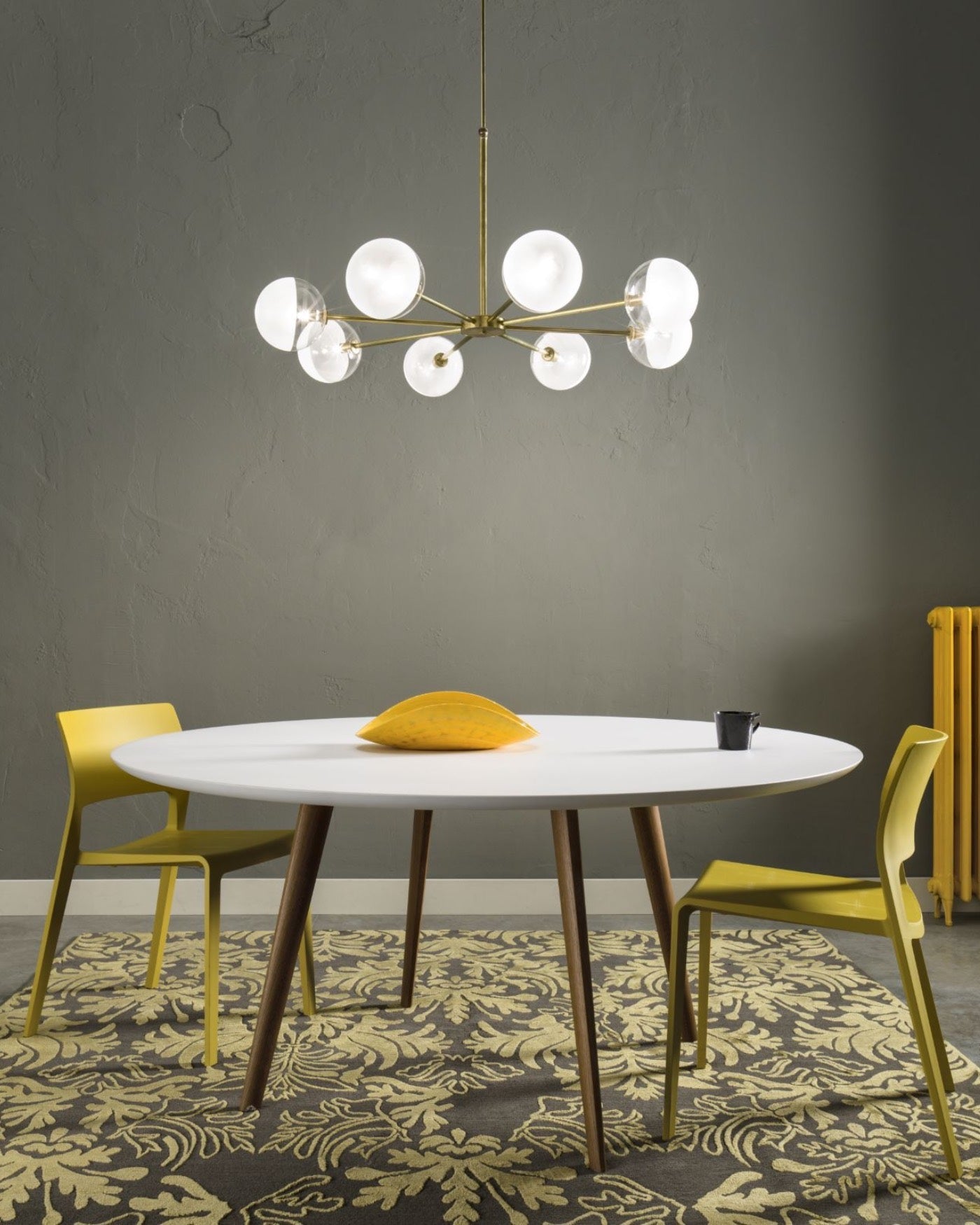 Natural brass eight light pendant hanging over a dining table with baroque and pop influences