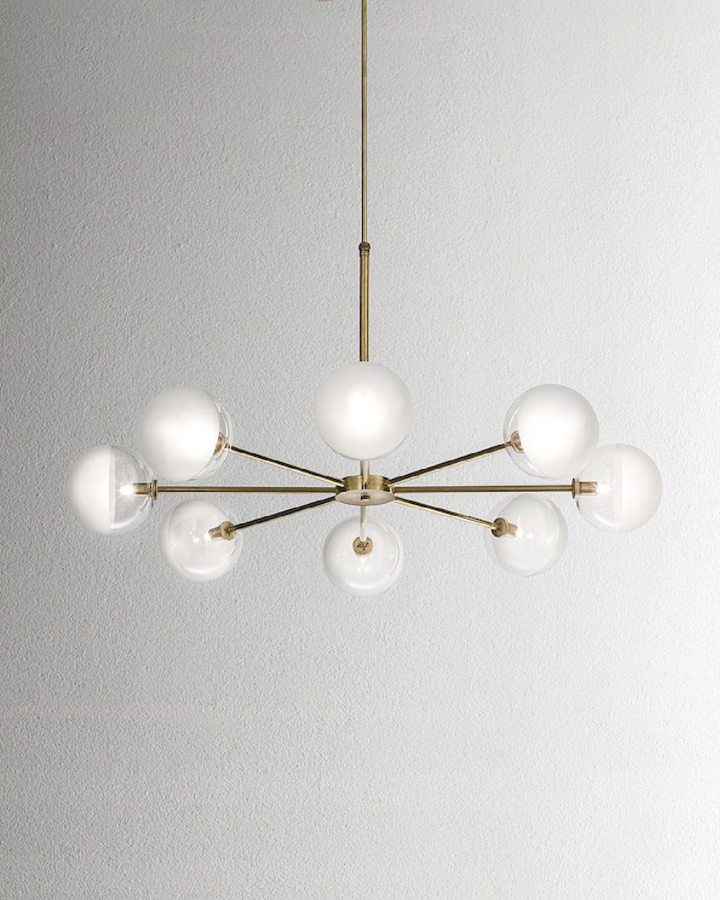 This is a beautiful eight-light brass pendant light with a natural finish, and made in Italy. The bodies base material is top quality antique brass which holds a very slight sheen and very subtle brush strokes, giving it gorgeous textural qualitiesIt makes for a superb piece over a dining or coffee table and will gracefully light up your space.
