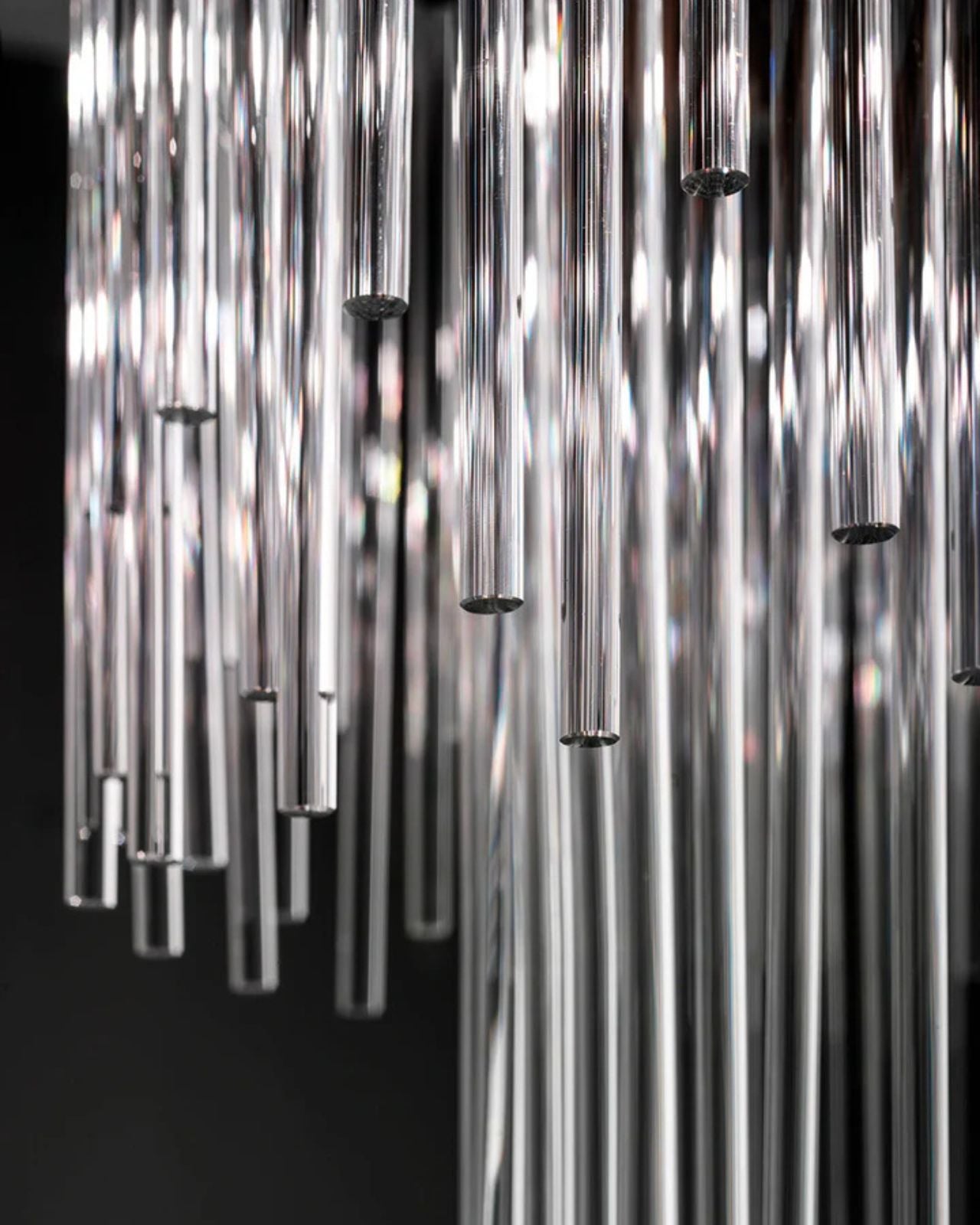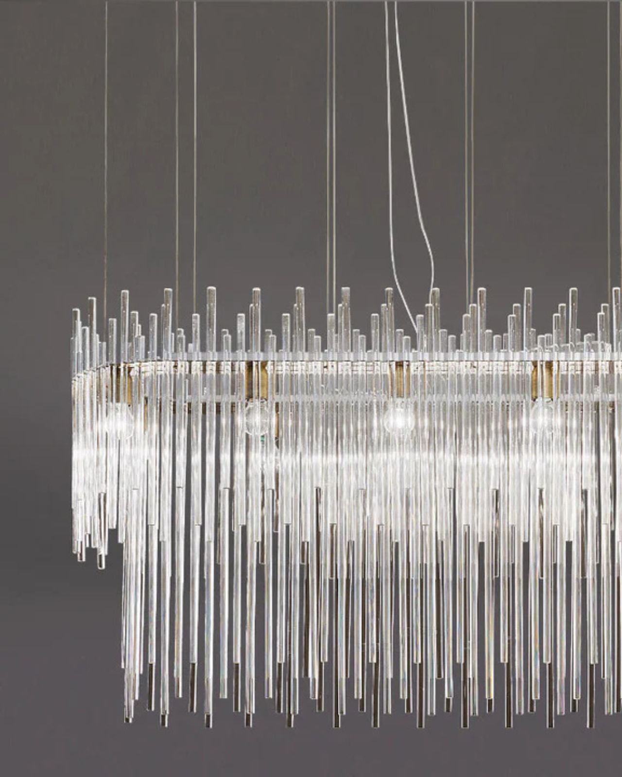 Centered around the concept of the glass rod, this contemporary ovular chandelier combines reeds of varying sizes to reflect and play with the light to bring a sensation of opulence and timelessness to your space. Designed and made in Italy.