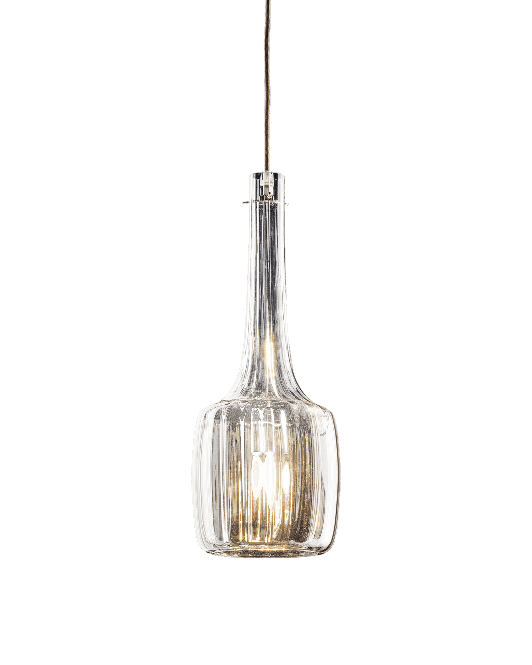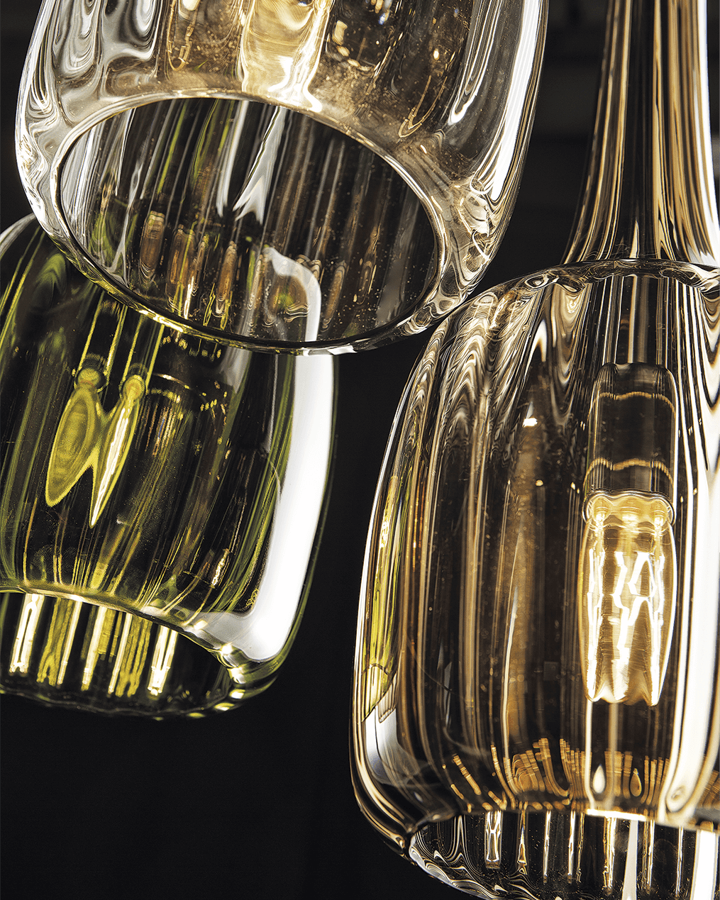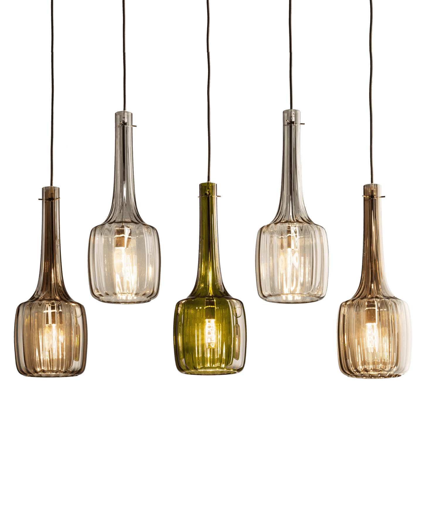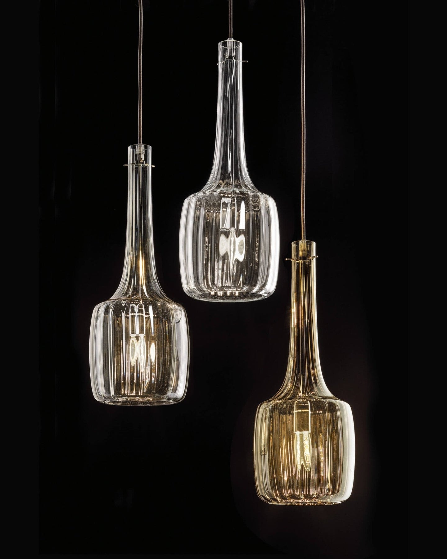 The elegant Italian Interior Glass Blown Pendant Light is available in four glass finishes and colours: transparent, smoke, dove and olive green. Featuring Iron Grey metal details with blown glass diffusers. This pendant complements the modern kitchen and dining room settings. 100% designed and made in Italy.