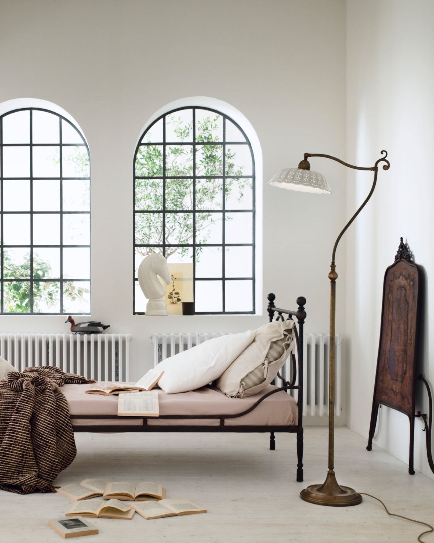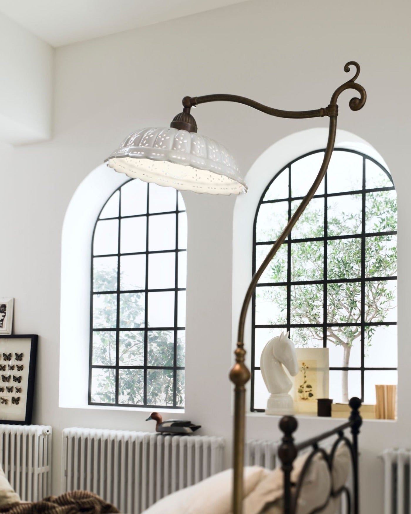 Handmade in Italy from solid brass and finished with a Bassano ceramic shade; the perforated detail of the fretted ceramic is inspired by the delicate stitching of lace fabric. This unique design is complimented beautifully by the decorative curled frame.