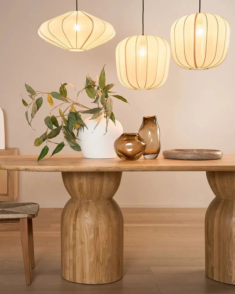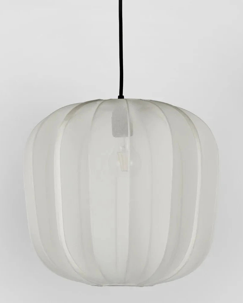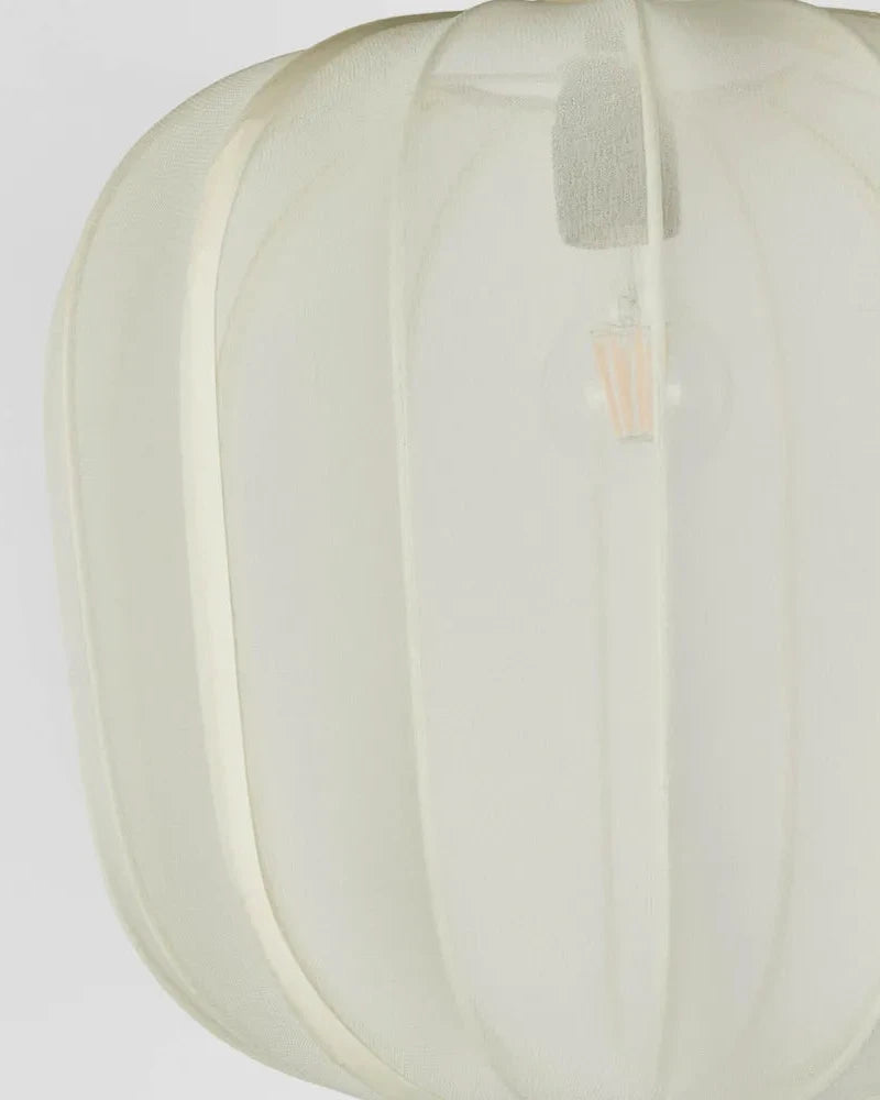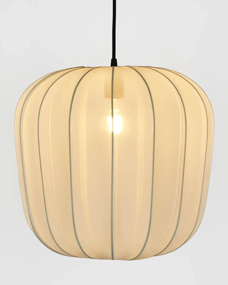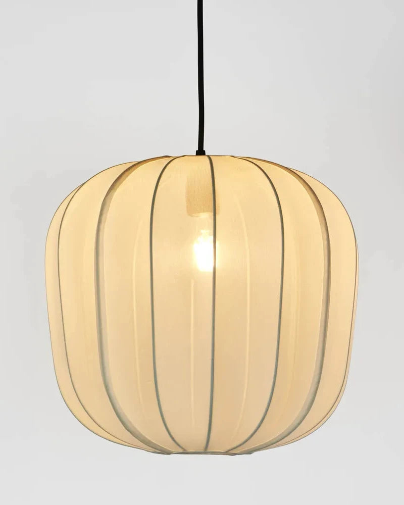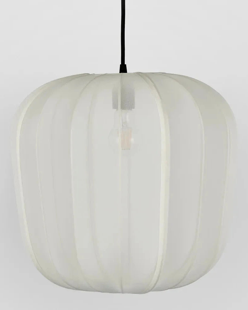 This pendant is crafted from ivory chiffon, resembling traditional rice paper lanterns. When the light is off, the soft, translucent fabric showcases a sophisticated ivory aesthetic. Paired with a warm light globe, when the light is on, it casts a gentle, inviting glow, perfect for adding warmth and character to living spaces. This pendant is paired with a black cord suspension and is available in a medium and large shade size.