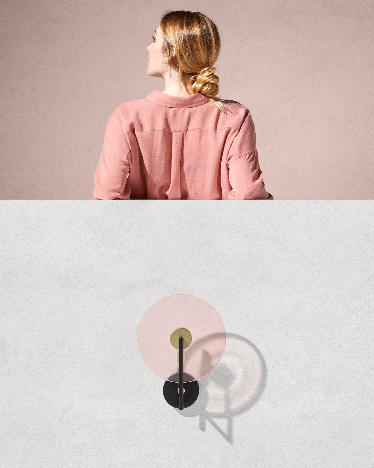 Person wearing a pink shirt with a wall-mounted pink light fixture in the foreground.