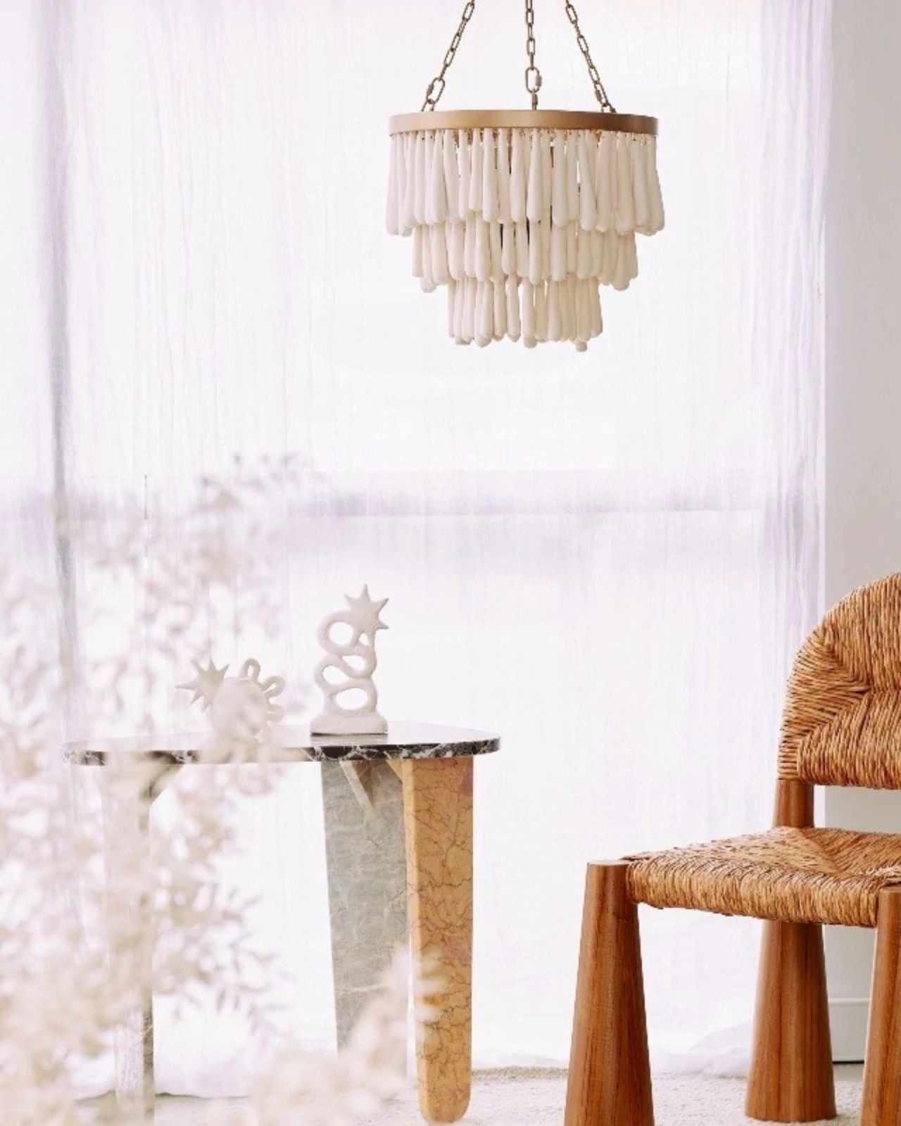 Marble and Curved Arm Chandelier over a dining table in a minimalist setting