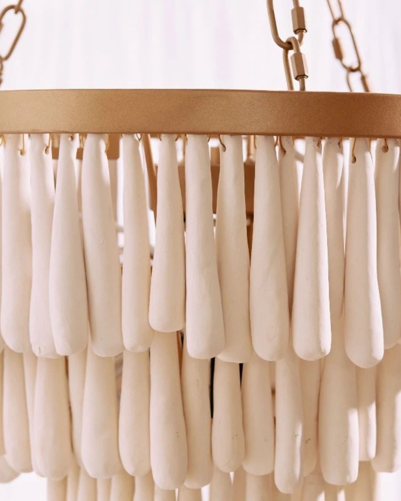 This romantic design will become an artistic focal point within any interior. Comprised of individually rolled clay beads that are kiln fired, dip-dyed and then threaded onto a wrought wireframe. Its layered clay form will add beautiful texture to dining rooms, master bedrooms and entranceways. This design is ideal for lower ceilings and can be installed flush against the ceiling or lower with its chain suspension. Handmade by an African community in Kwazulu Natal.