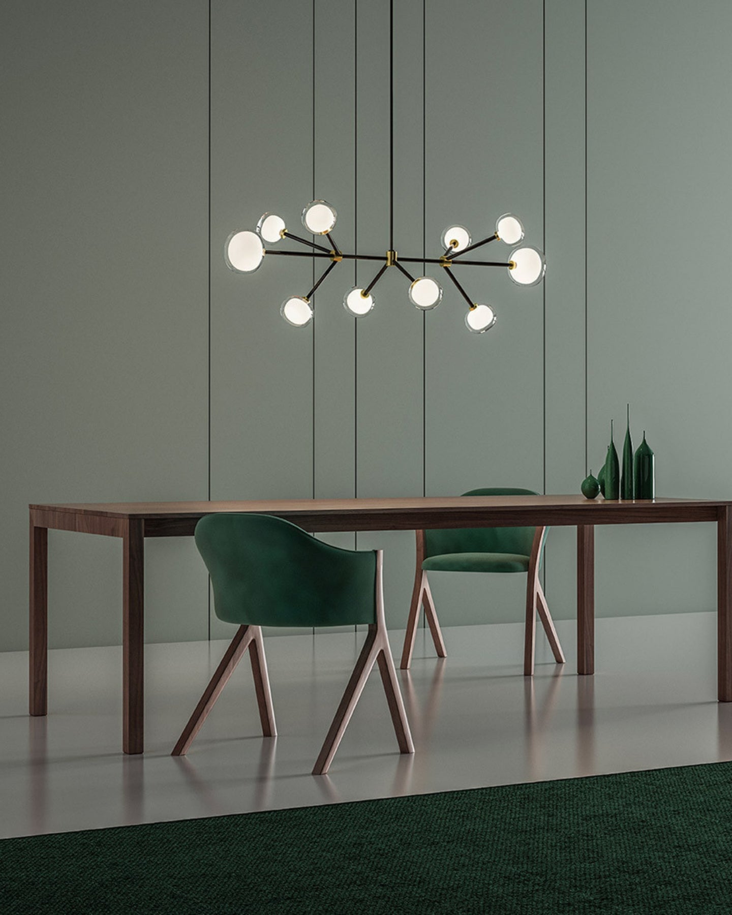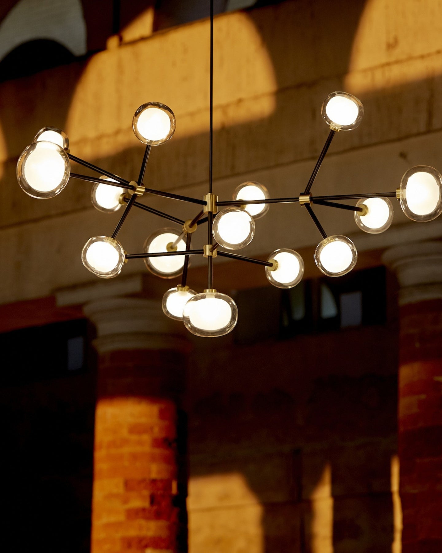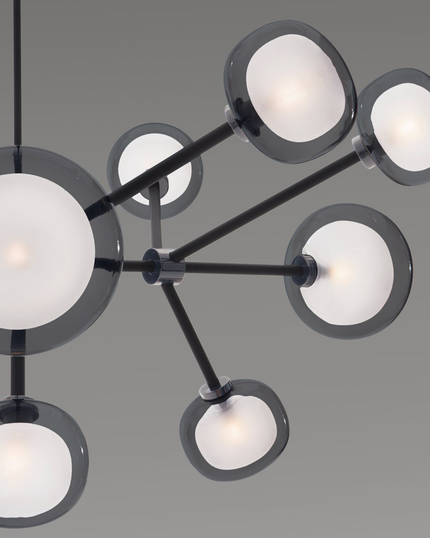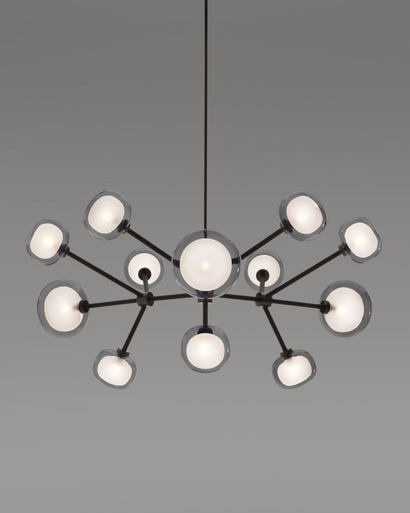 The Layered Glass Chandelier merges mid-century design principles with modern aesthetics through its striking architectural form. Comprising of 9, 10, 12, or 16 double-walled borosilicate glass spheres suspended from a metal frame, this fitting delivers both visual aesthetics and functional illumination. Available with brass or black chrome finishes, this statement piece creates a floating, sculptural presence ideal for expansive living spaces, formal dining rooms, and grand foyers.