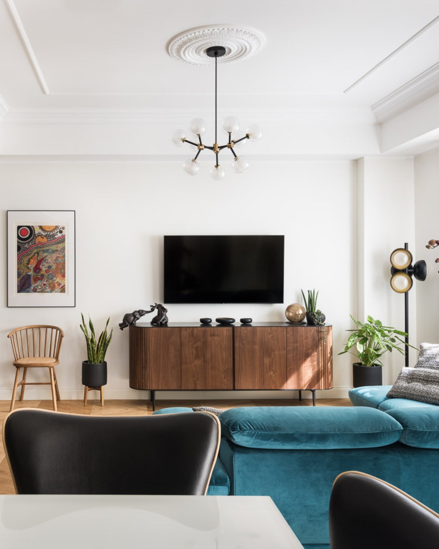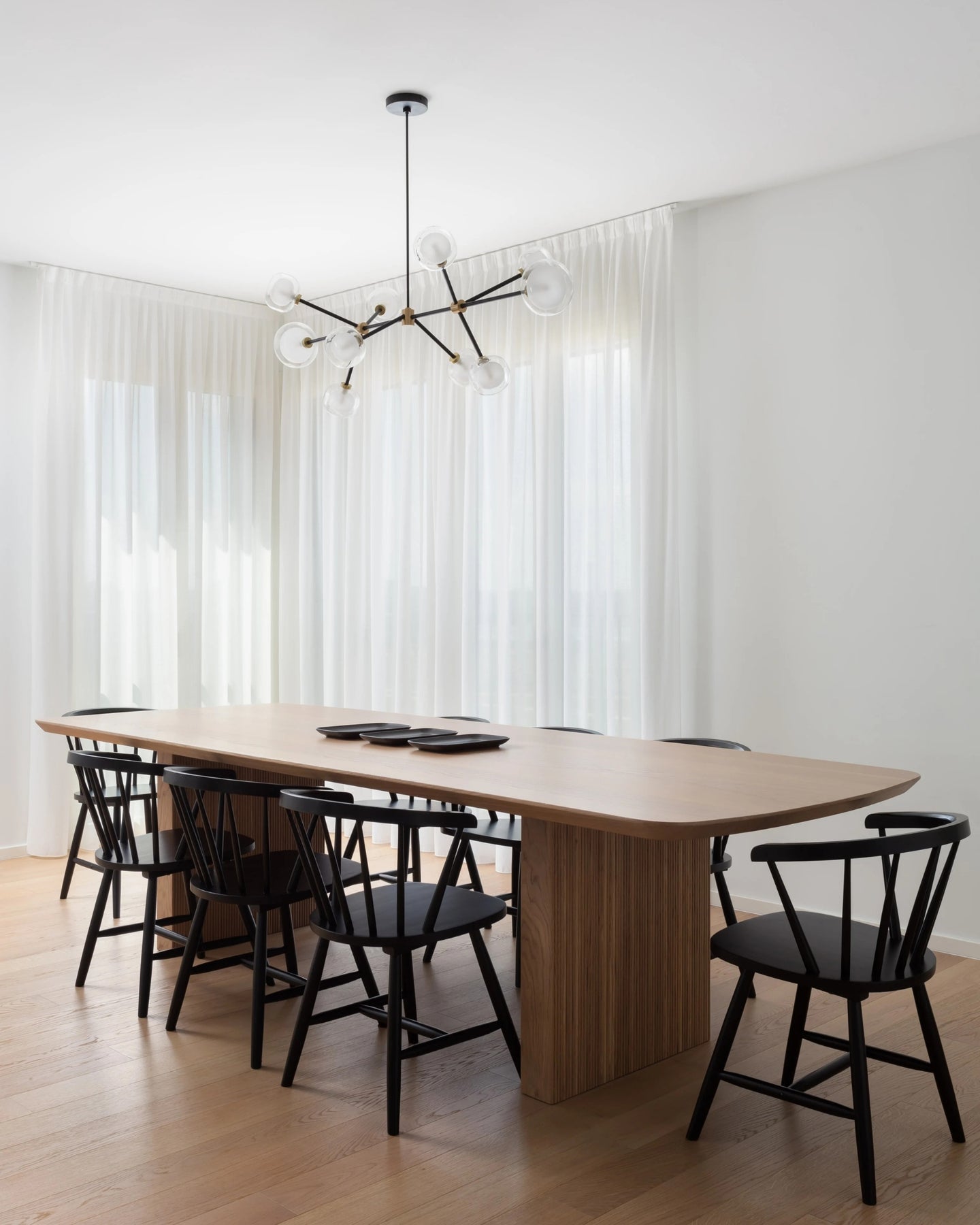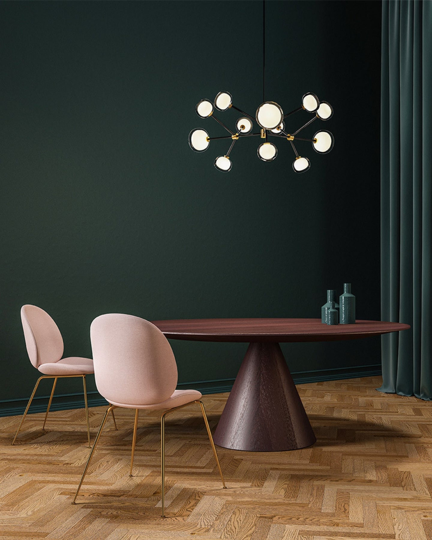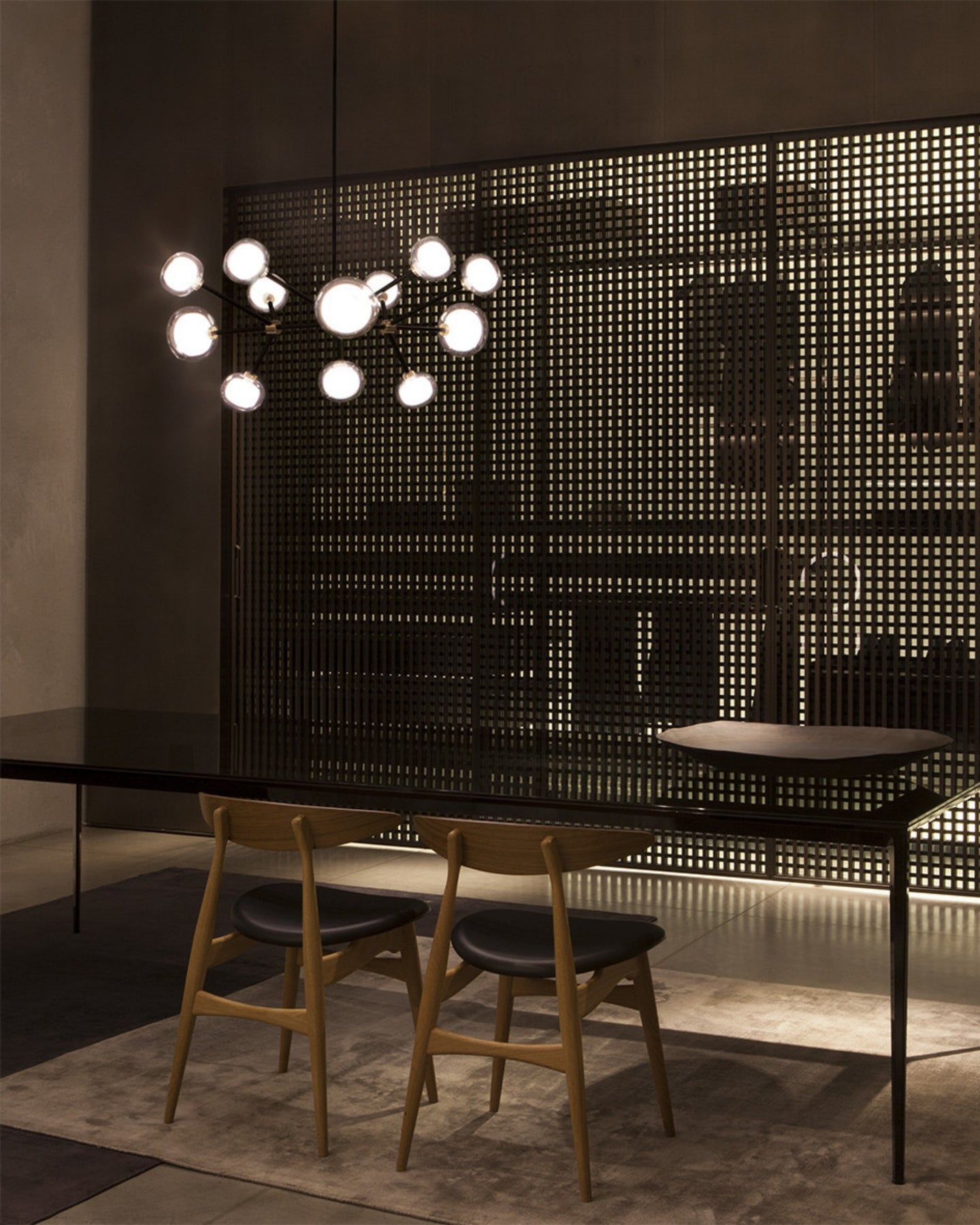 The Layered Glass Chandelier merges mid-century design principles with modern aesthetics through its striking architectural form. Comprising of 9, 10, 12, or 16 double-walled borosilicate glass spheres suspended from a metal frame, this fitting delivers both visual aesthetics and functional illumination. Available with brass or black chrome finishes, this statement piece creates a floating, sculptural presence ideal for expansive living spaces, formal dining rooms, and grand foyers.