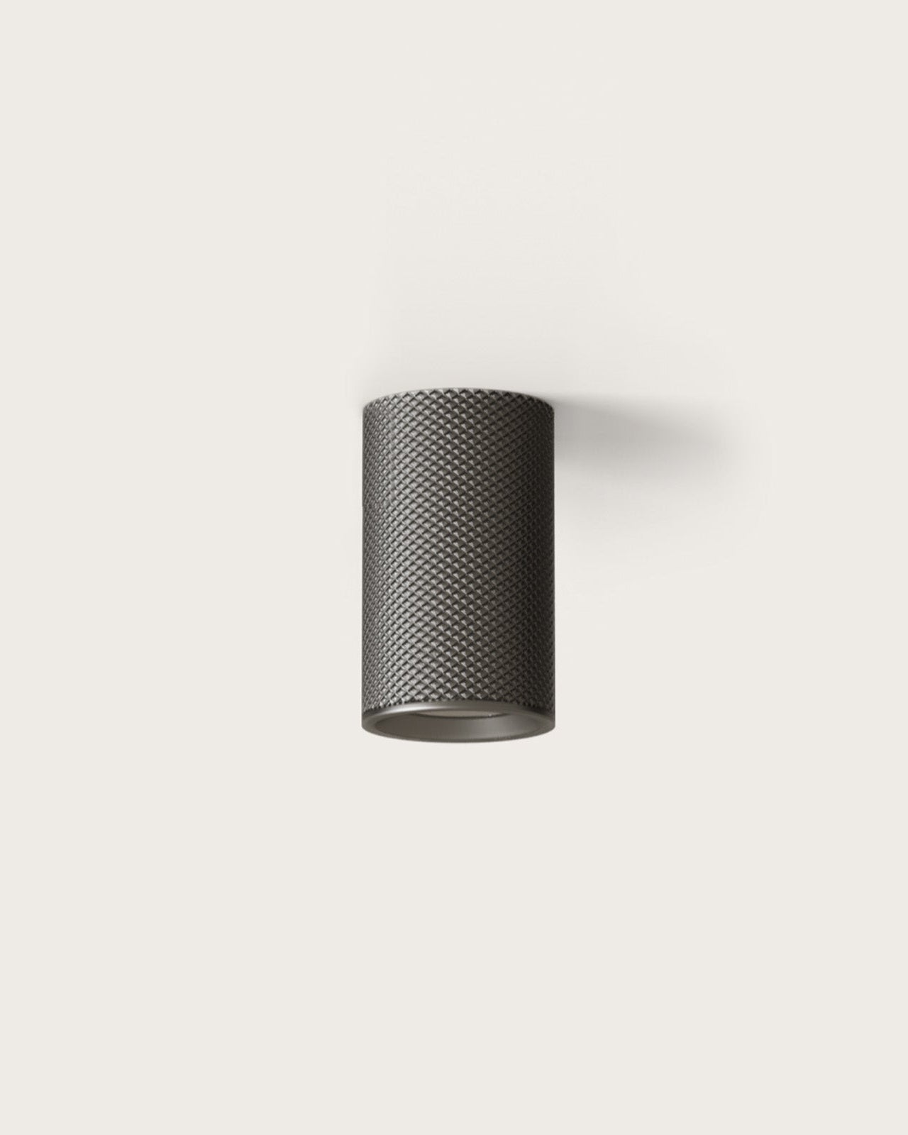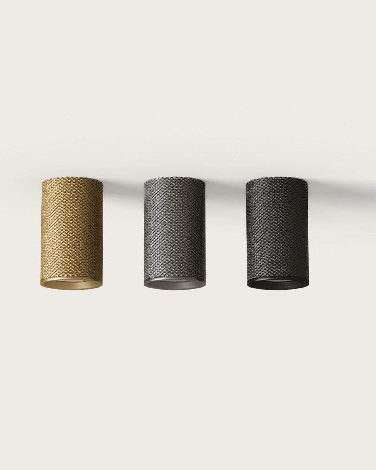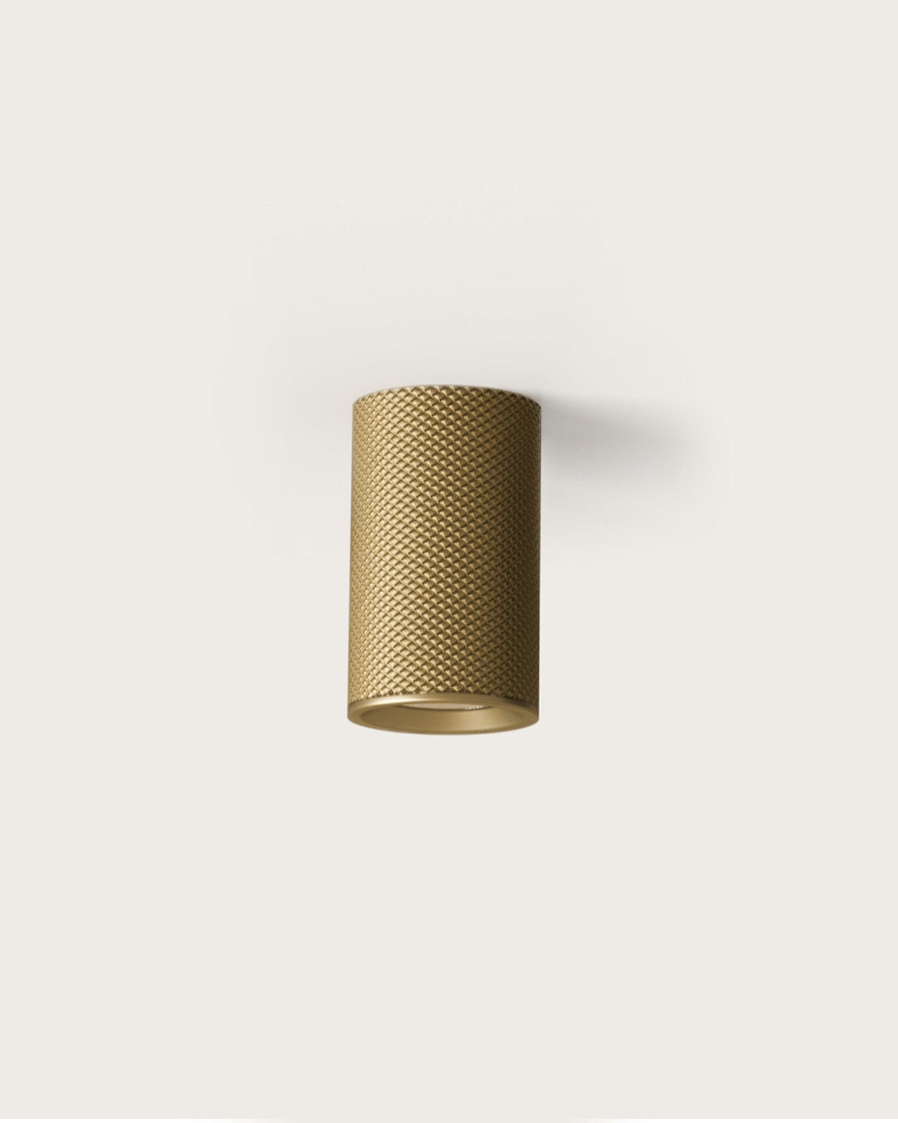 This small ceiling light features a simple yet sophisticated cylindrical shade. Made from robust aluminium, this fixture comes with an incorporated textured pattern allowing it to bring some modernity and refinement to any interior. This downlight will illuminate kitchen islands, corridors, and bookshelves, and is available in Aged Gold, Matte Black or an Anthracite finish.