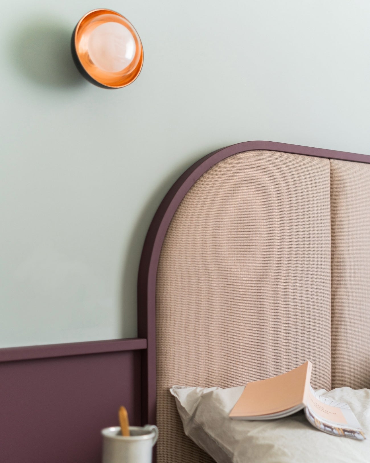 Beige upholstered headboard with purple frame against a light green wall with an orange wall lamp.