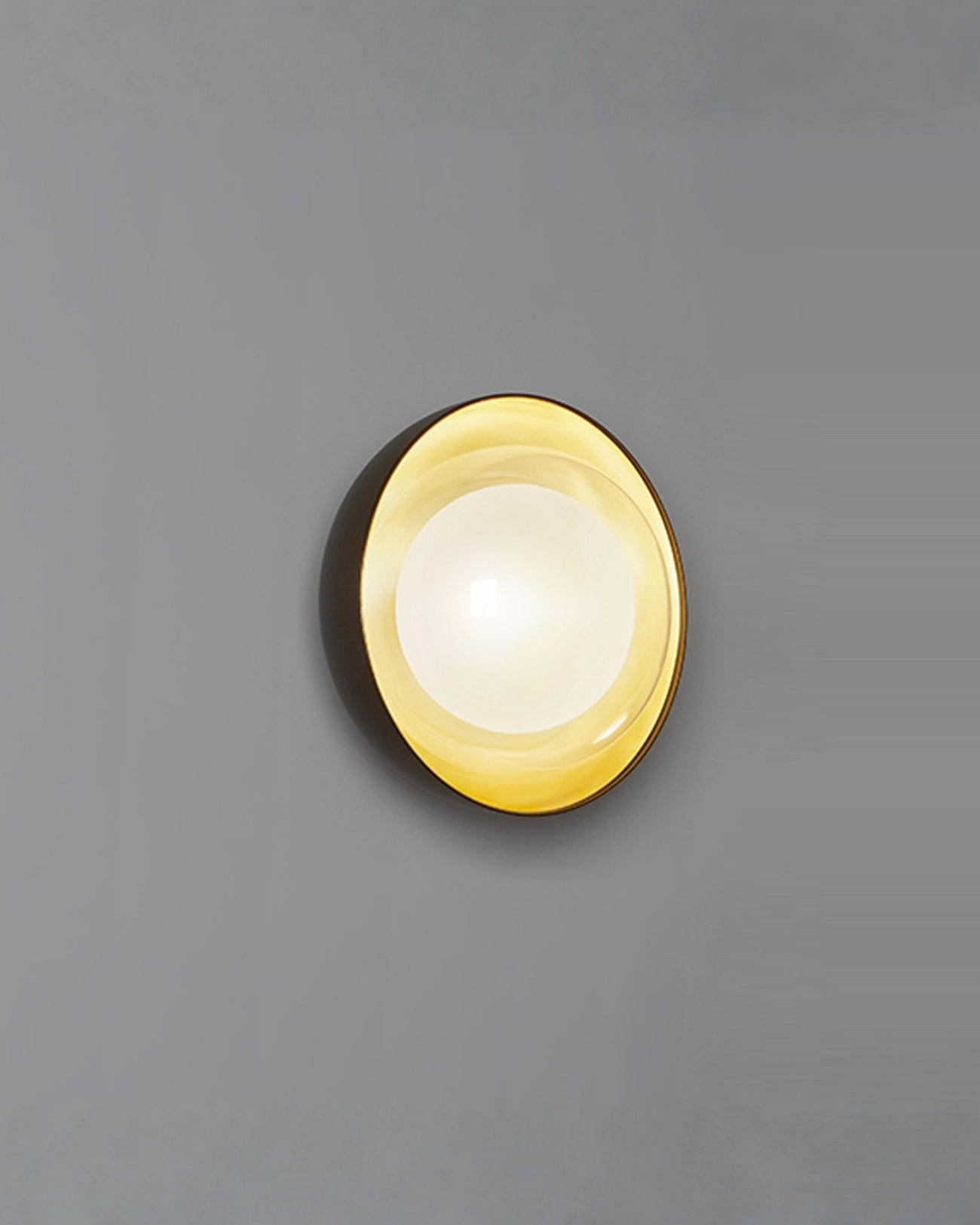 Round wall light fixture with gold rim on a gray background