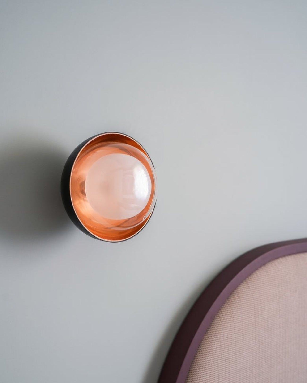 Round metal wall light on a light blue wall