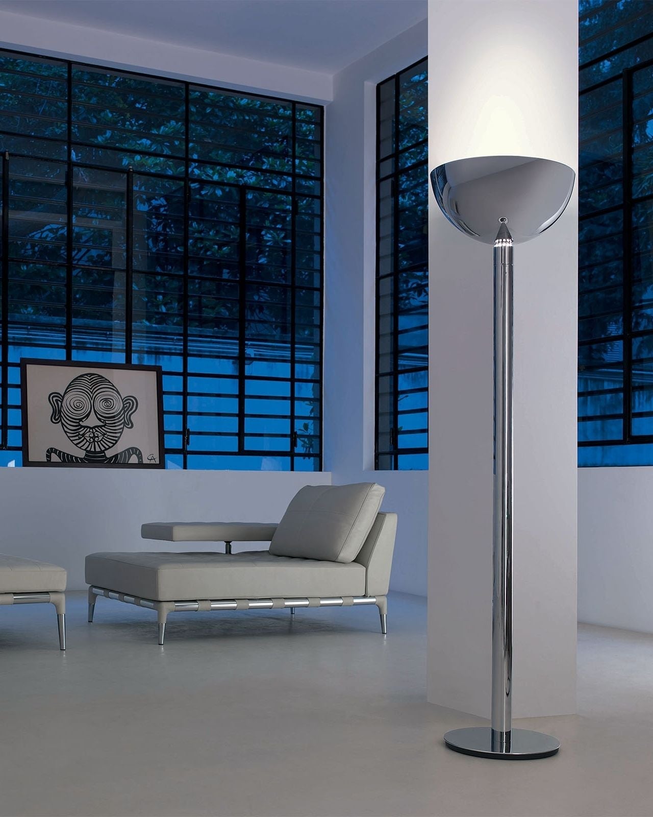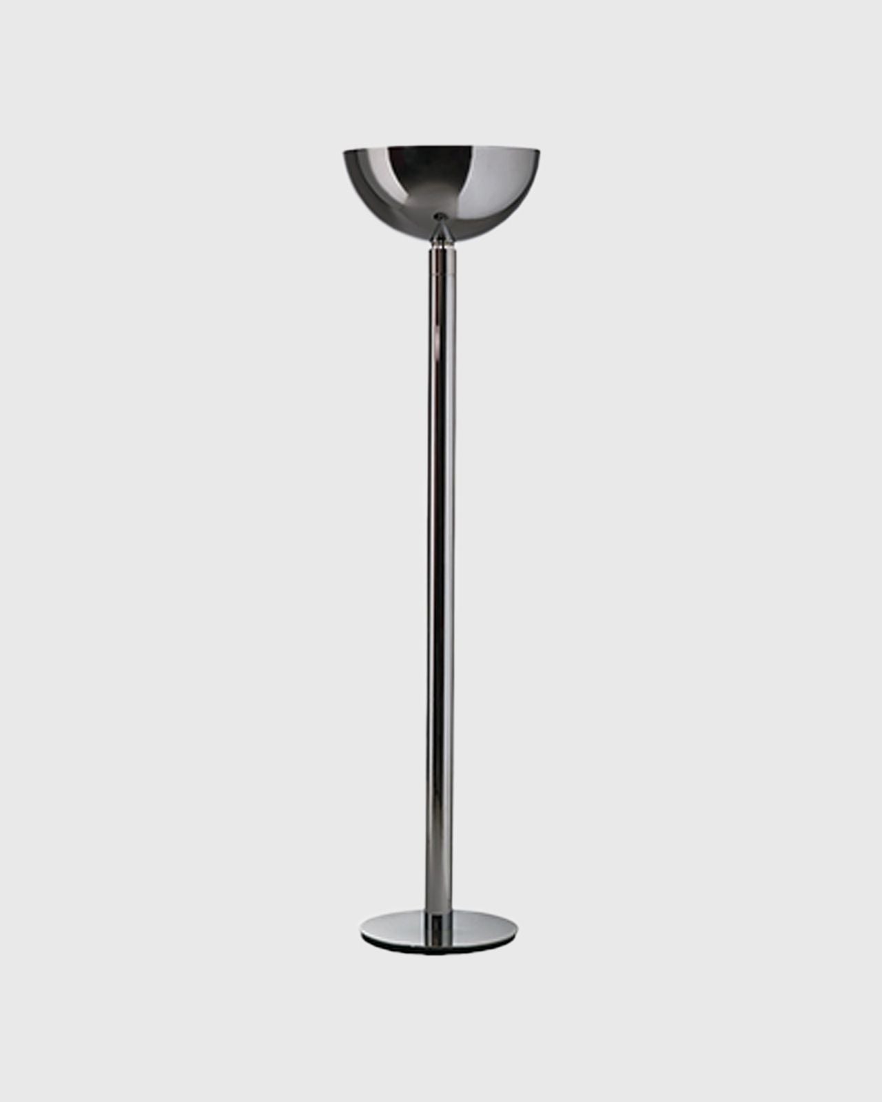 Collaborating with France Helg and Antonio Piva, the renowned Italian architect and designer Franco Albini designed this fixture aiming for perfection and elegance. This 1969 floor lamp showcases a sleek stem made from metal with a chrome or white finish and an upside-down dome shade available in reflective chrome or a matte white finish. This floor lamp is a true object of design and ensures a soft illumination in contemporary reading nooks, modern bedrooms, or mid-century living rooms.