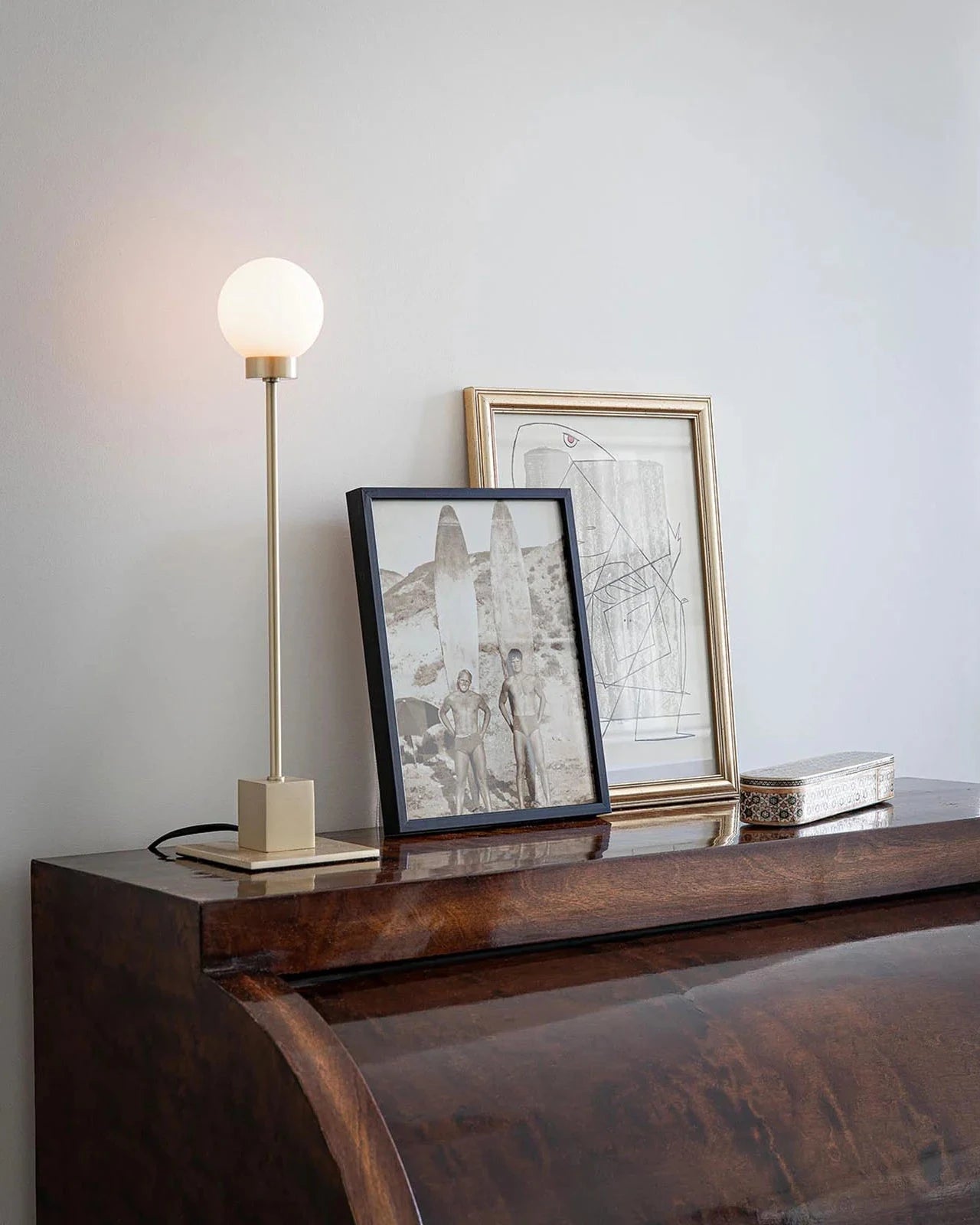 Framed artwork and a lMid-Century Modern Orb Table Lamp on a wooden surface against a light gray wall.