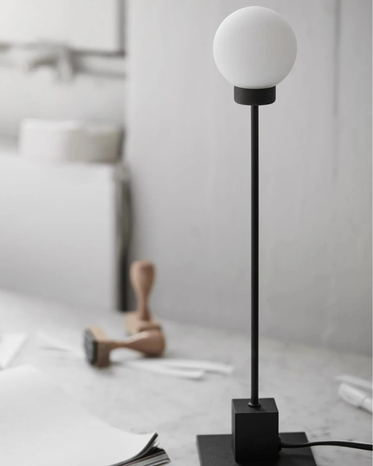 Modern interior with a desk, Mid-Century Modern Orb Table Lamp, and framed artwork on a light gray wall.