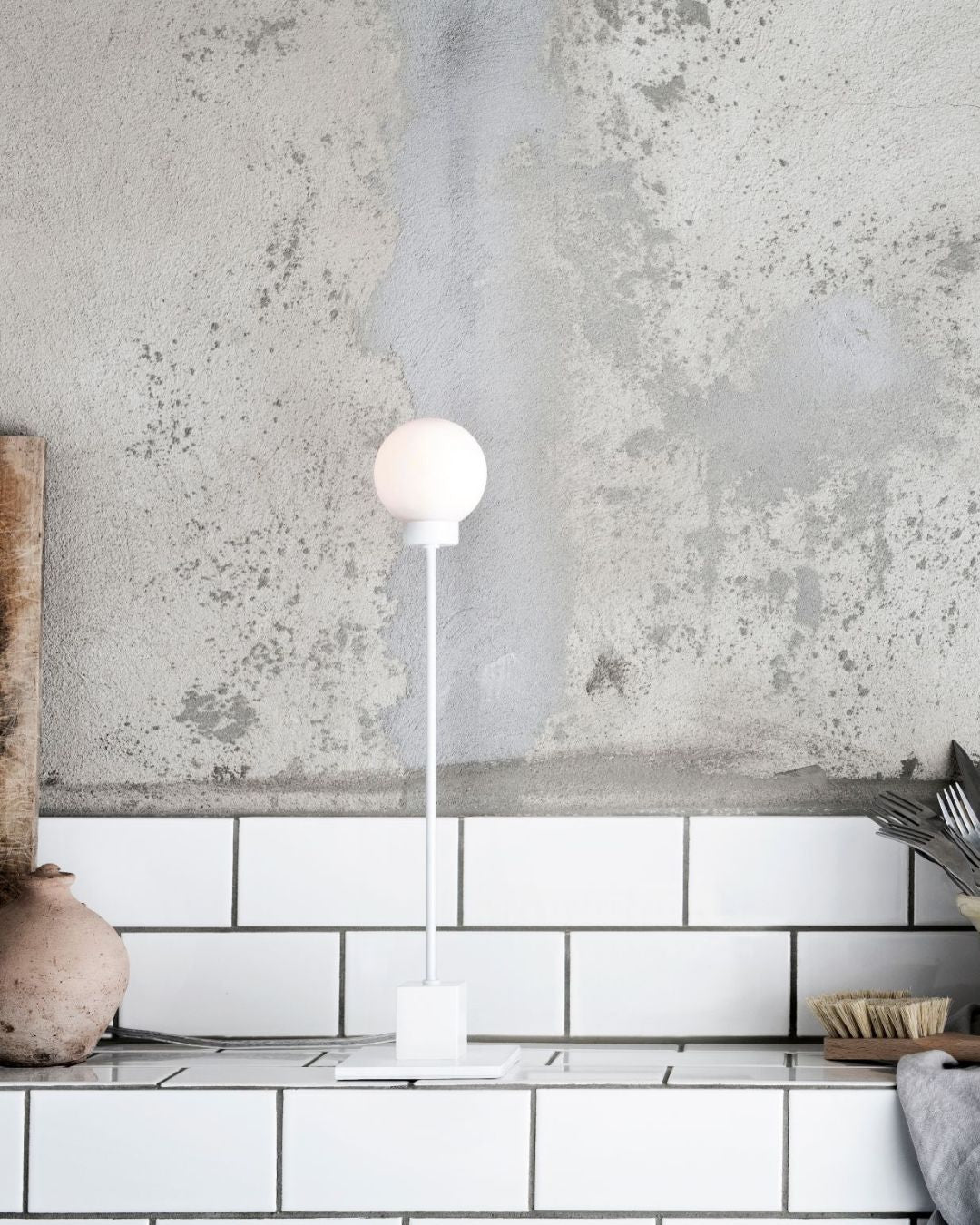 Mid-Century Modern Orb Table Lamp with a white spherical light bulb in a minimalistic room.