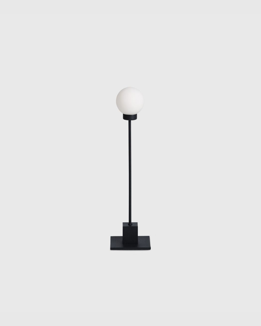 BlackMid-Century Modern Orb Table Lamp with a white spherical shade on a light gray background