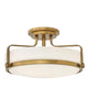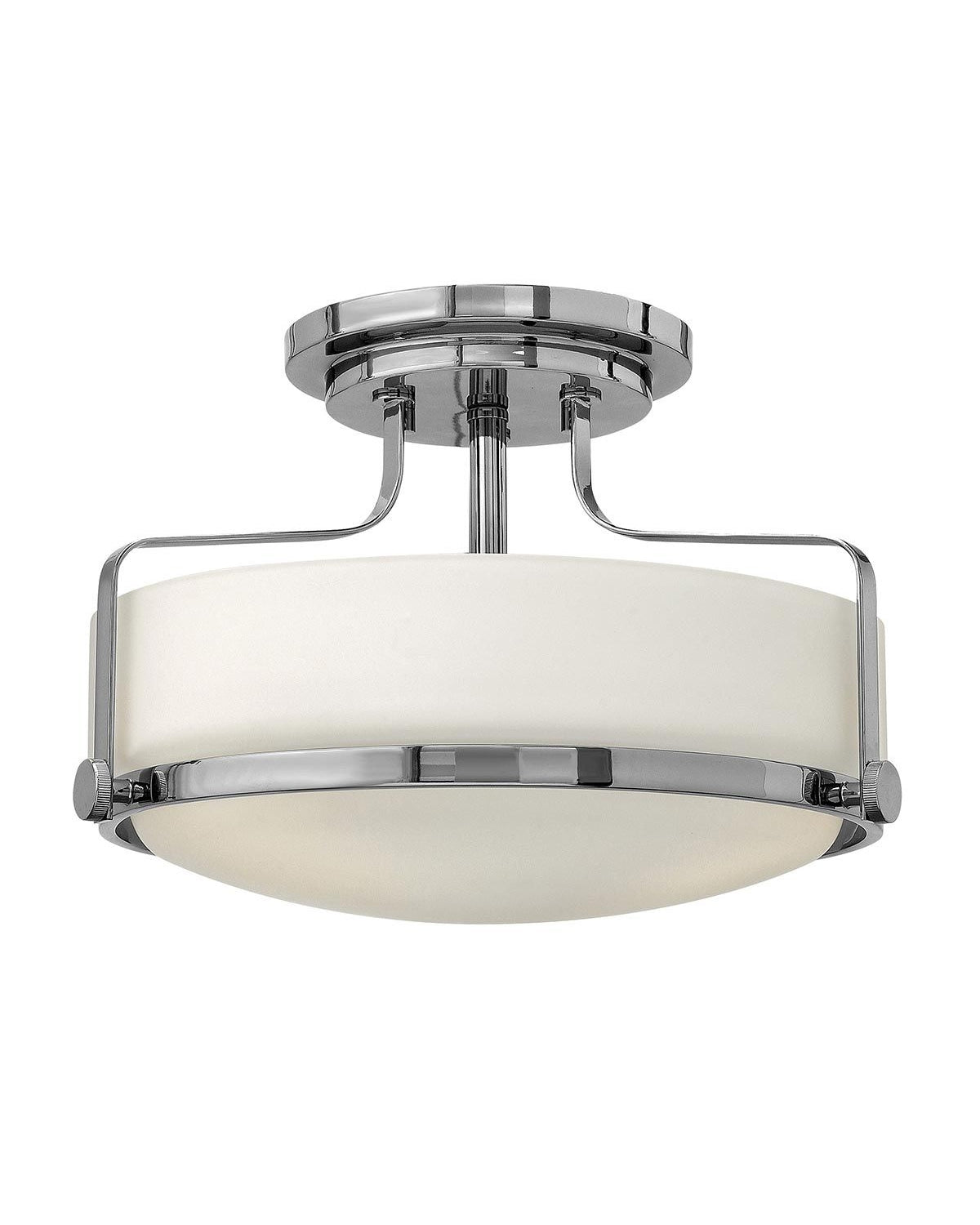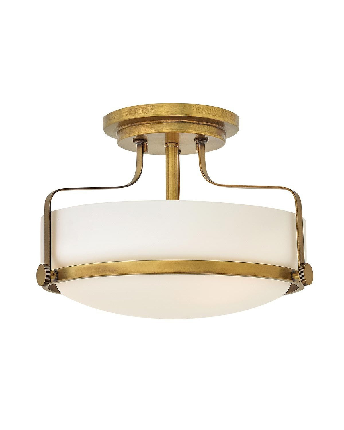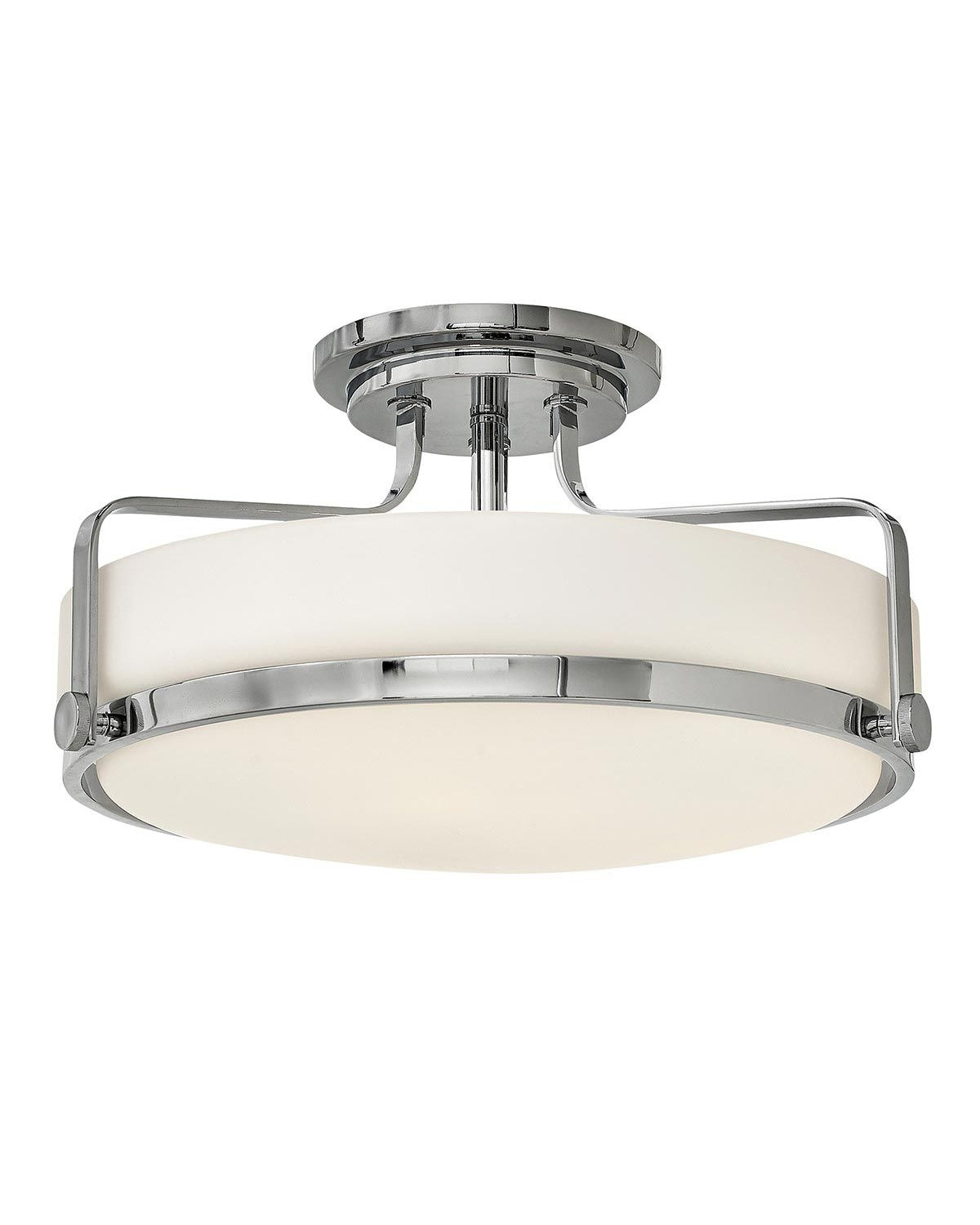 This Mid-Century Modern style ceiling light has a sleek, retro design. A semi-flush mount with a unique opal glass bound by a prominent metal ring and decorative knobs available in Polished Chrome and Brass. An elegant addition to any room and space.