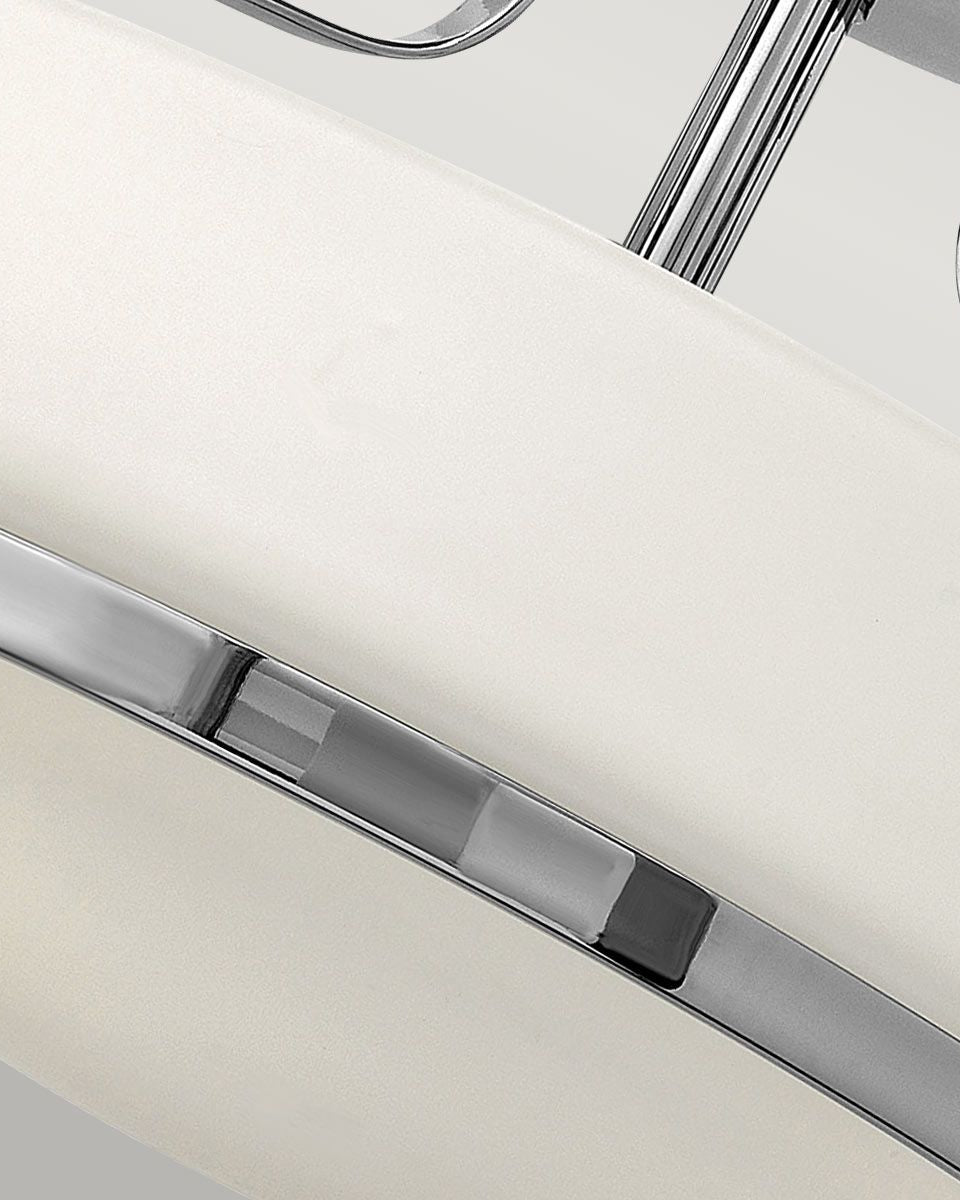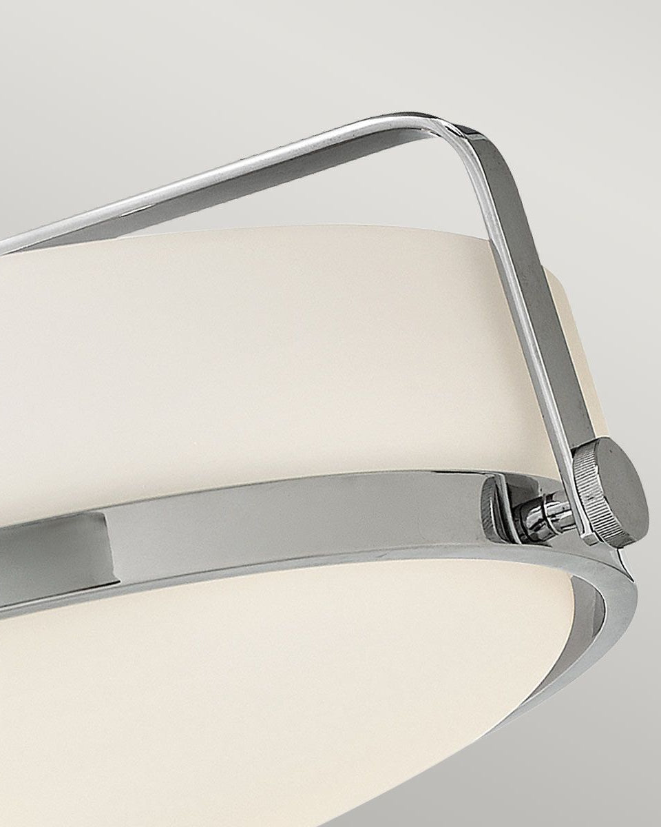 Close-up of a modern ceiling light fixture with white shade and chrome finish.